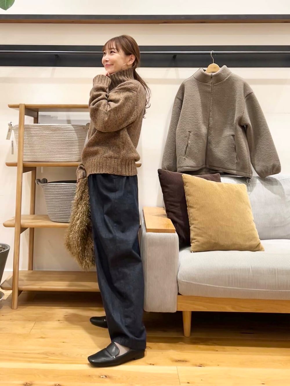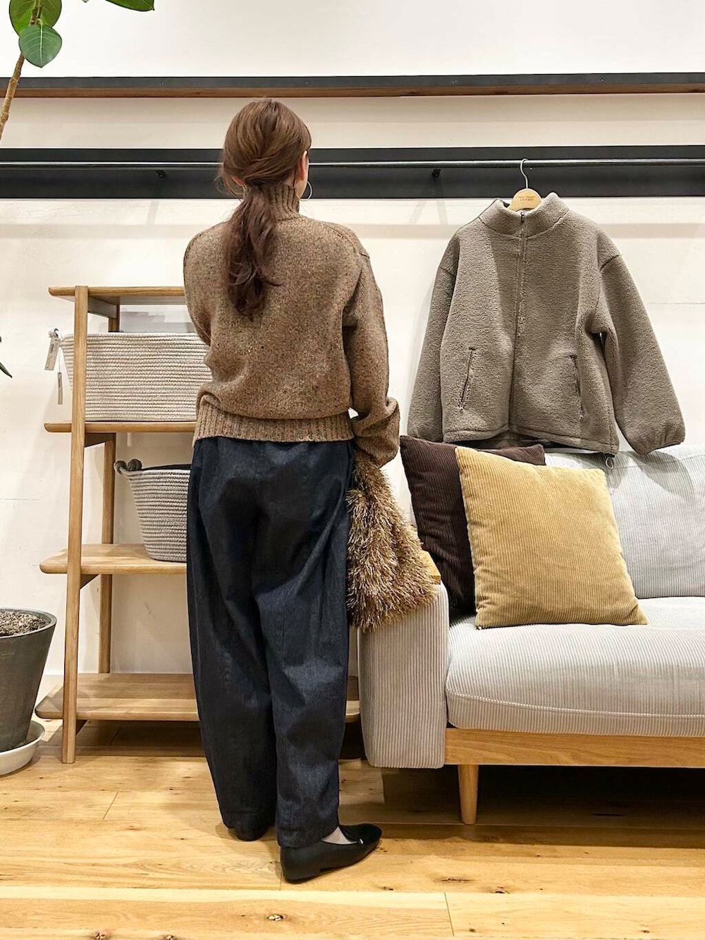 ボトムスにかぐれのデニムボリュームパンツを合わせてます。