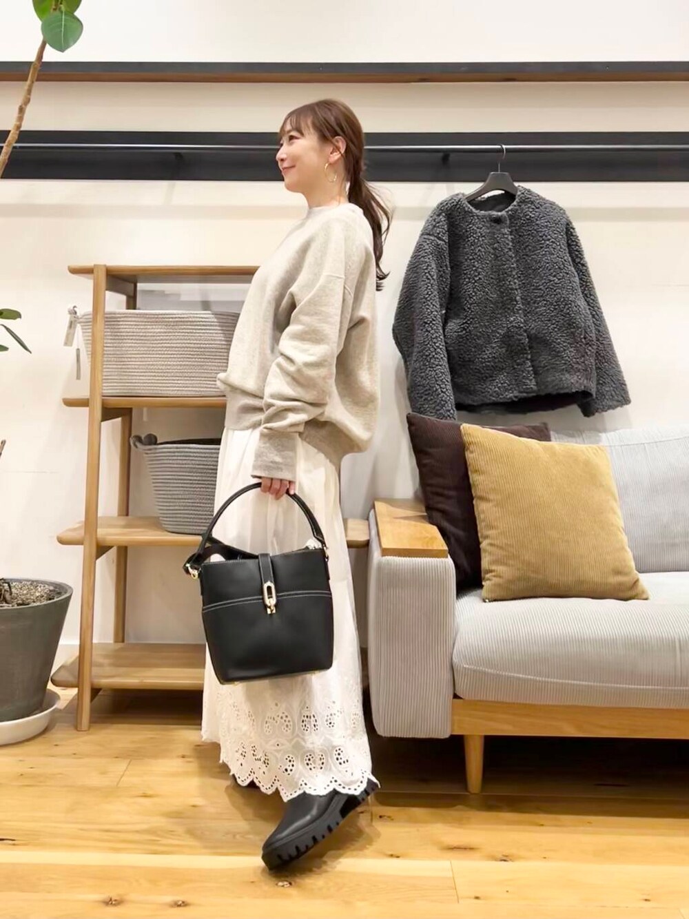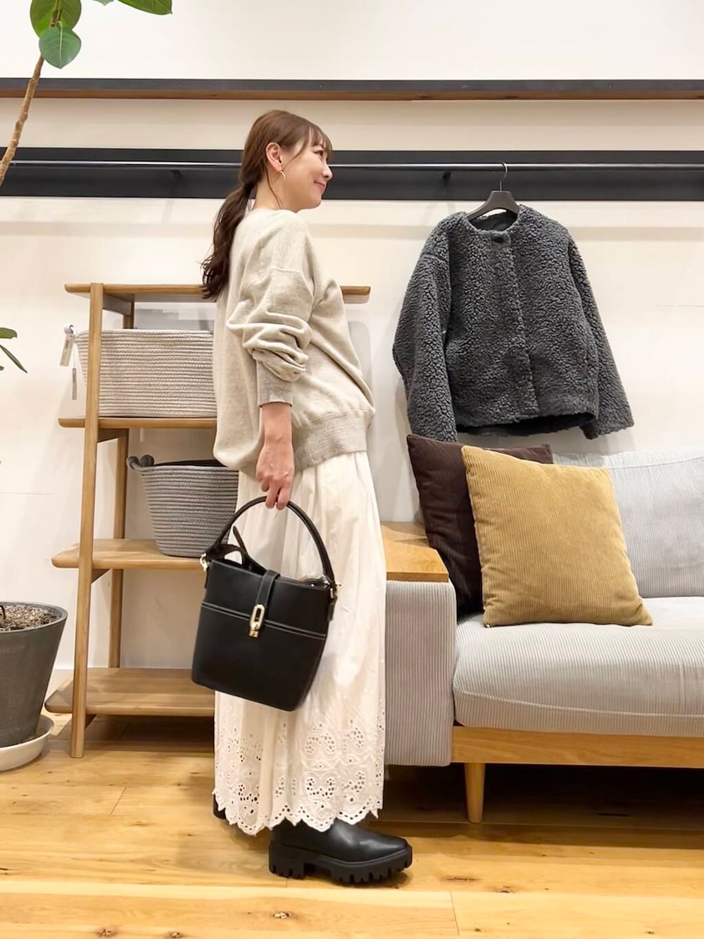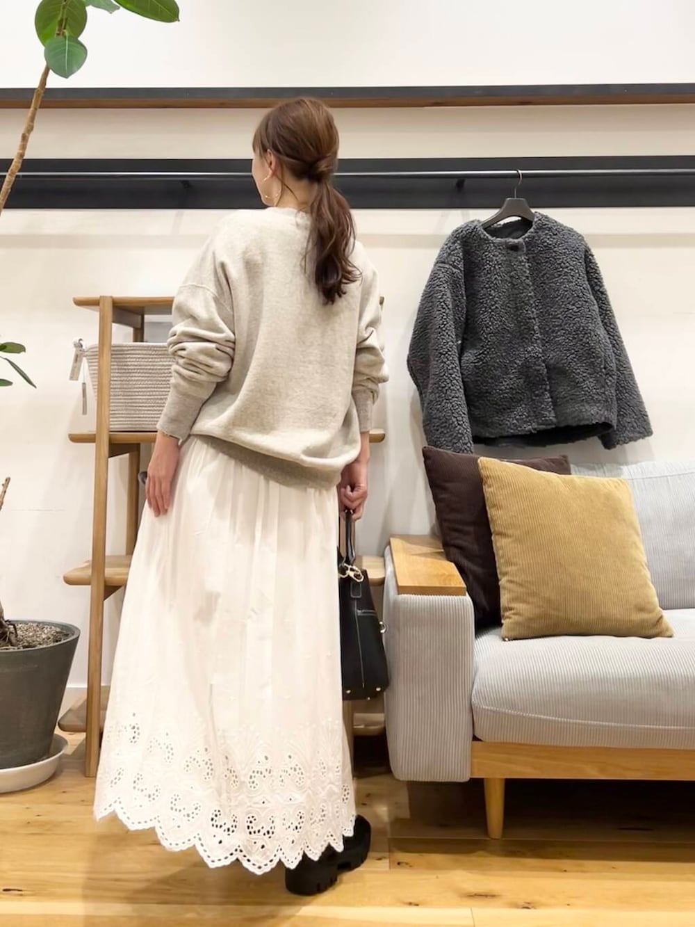 モコモコの羊みたいになりますが、着丈がそんなに長くないので、太めのパンツやスカートにも合わせやすいバランス。