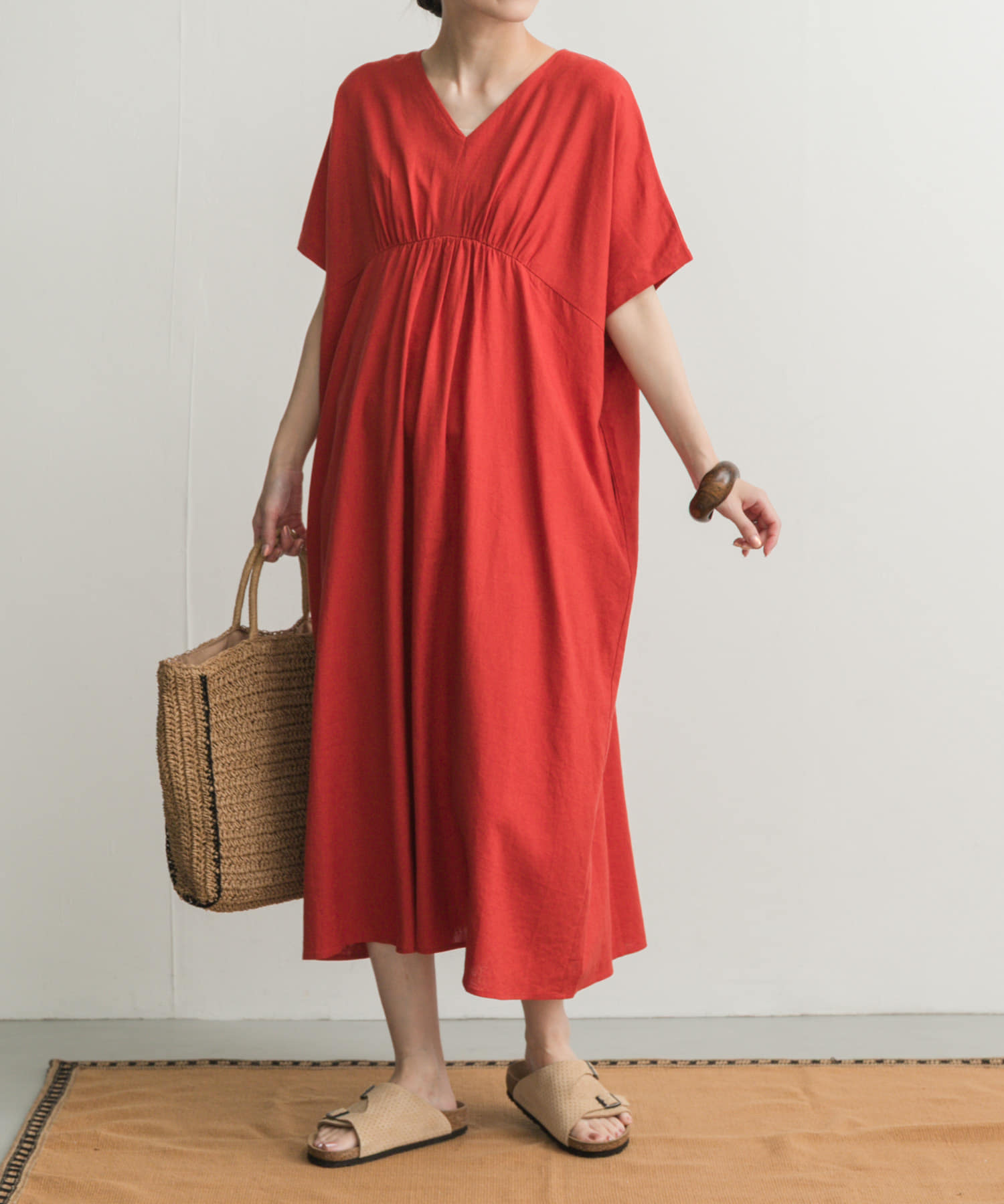 DOORSリネンレーヨンVネック切替ギャザーワンピース- カラー: