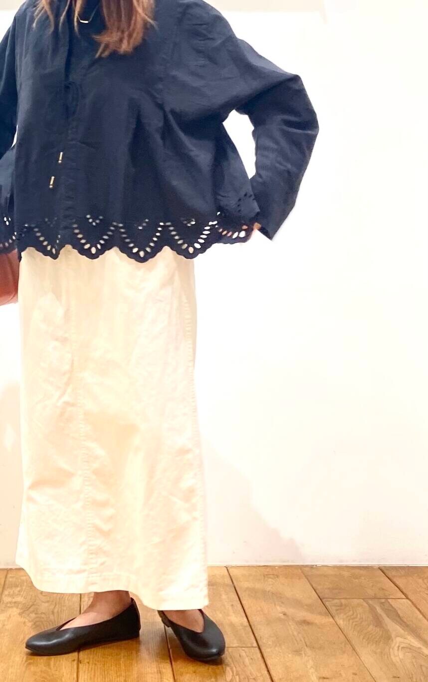 デザインのある羽織りに、かぐれのコットンスカートを合わせました。