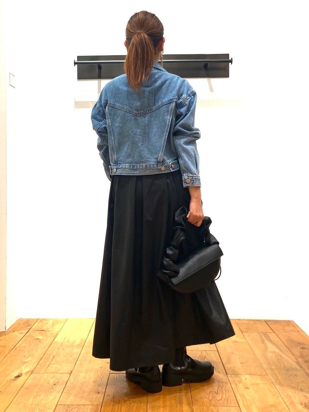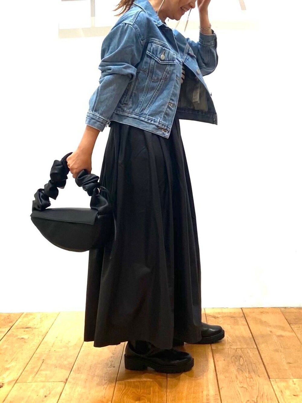 リーバイスのデニムジャケットに、レザー調のスカートとアクセサリーはシルバーでまとめました。ブーツを合わせることで秋先取りな甘辛コーデです。