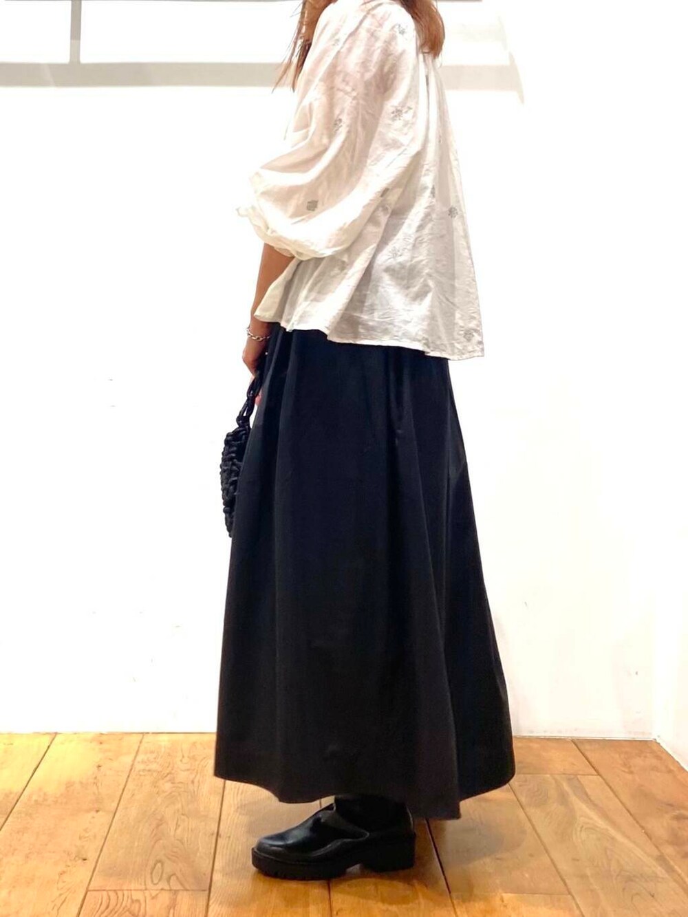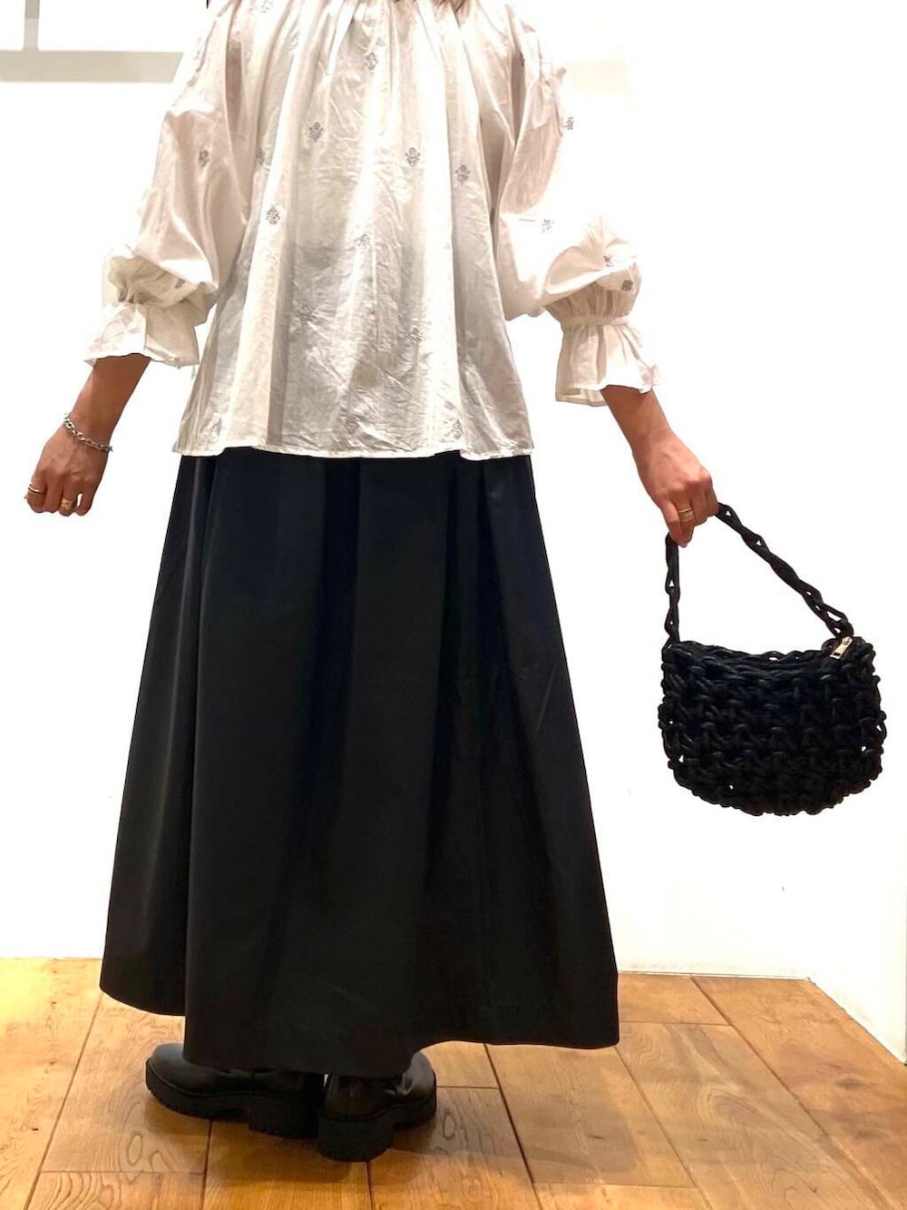 白にシルバーの刺繍入りブラウスが主役のコーデです。
