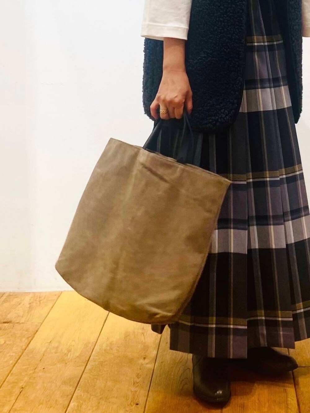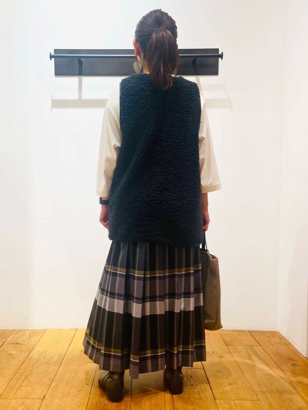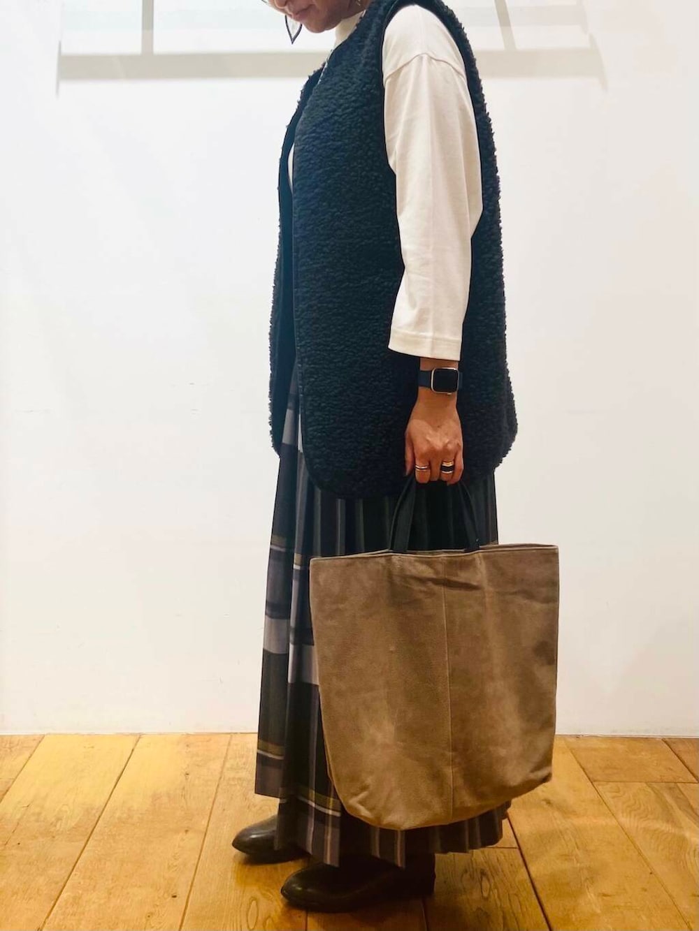 クラシックになり過ぎない様にボアベストを合わせ、全体の色合いは統一してまとまりを持たせています。