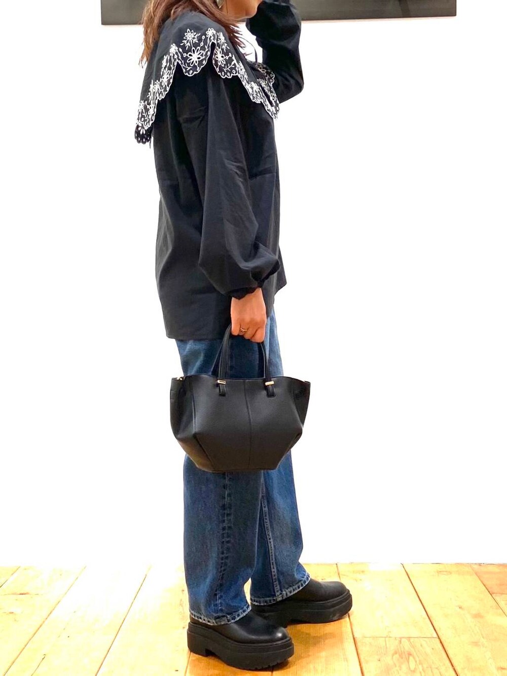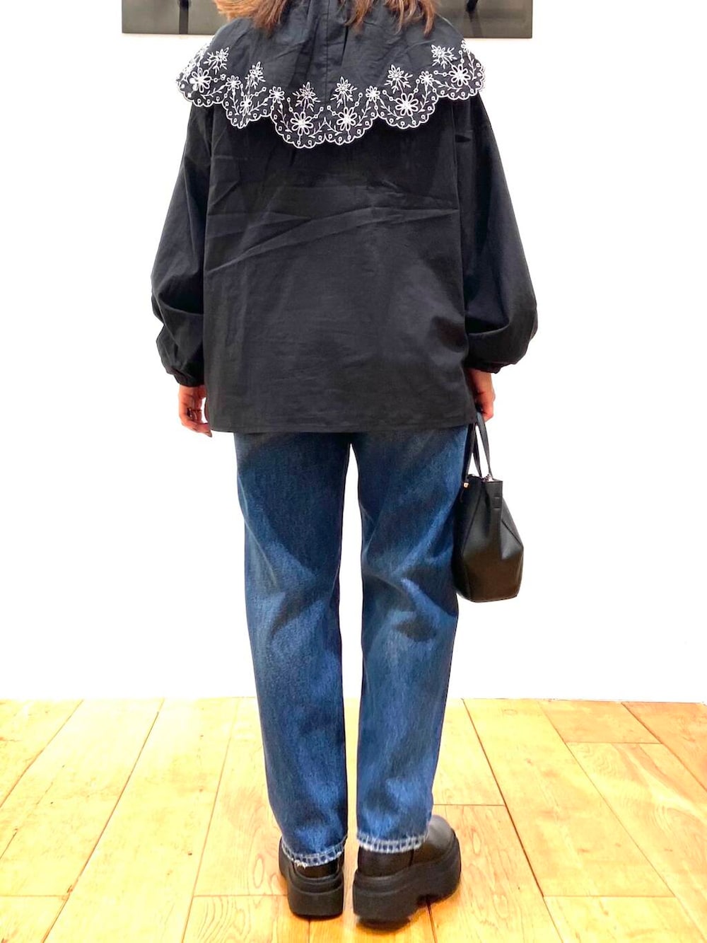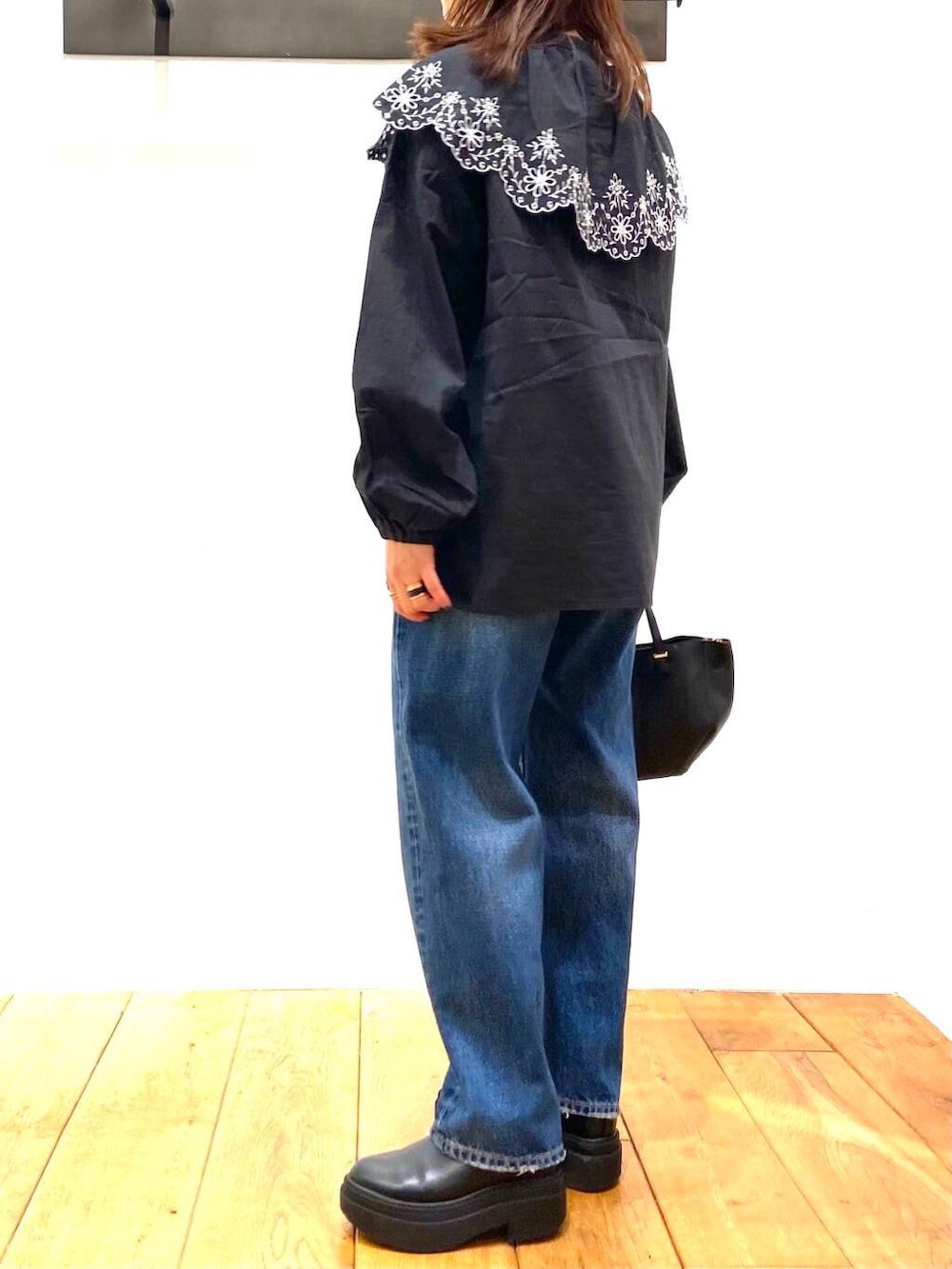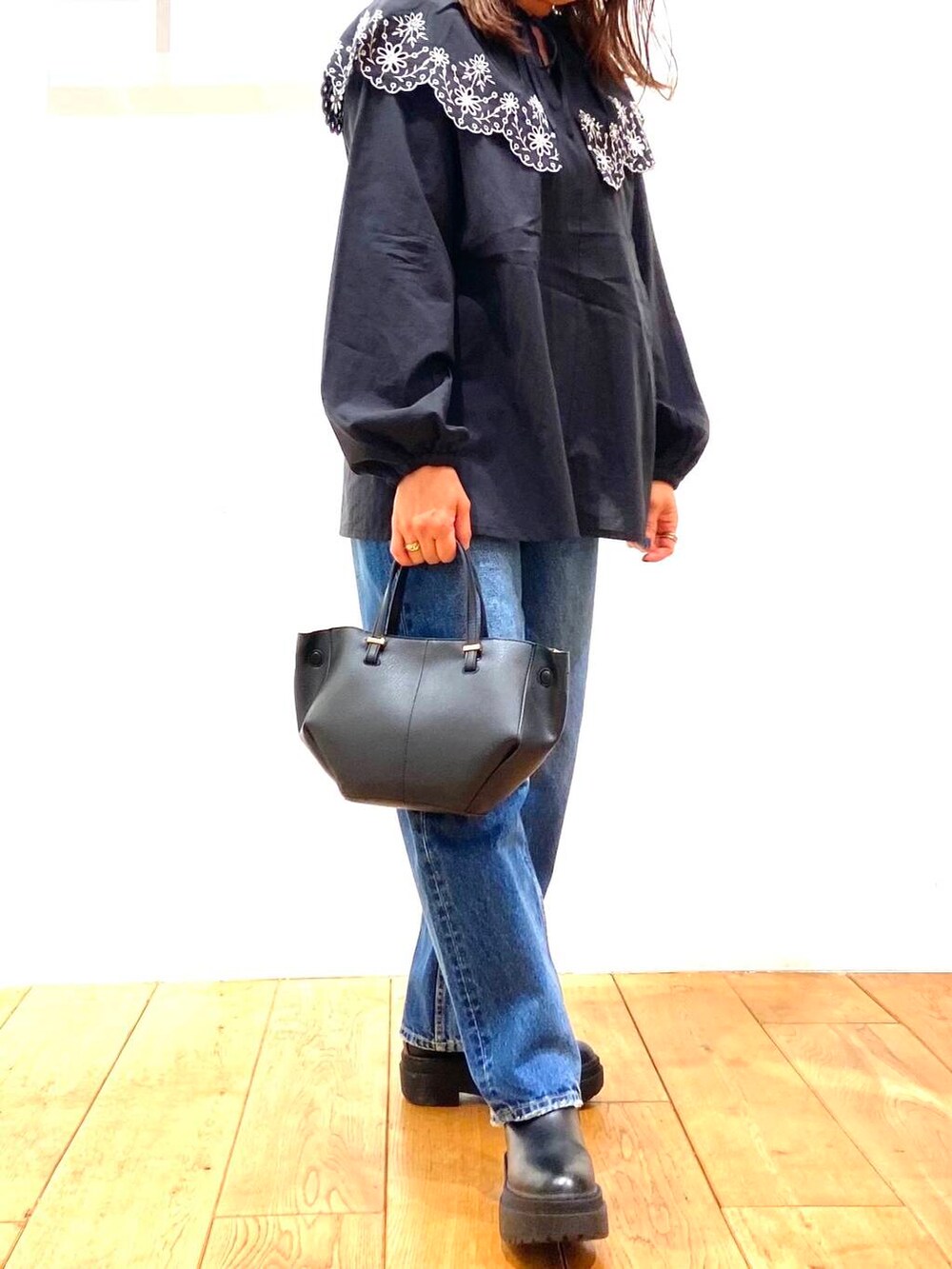 カジュアルなデニムに、甘めのブラウスを合わせて女性らしいコーデにしました。