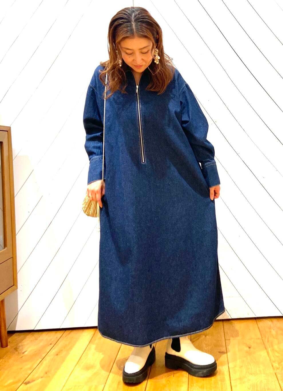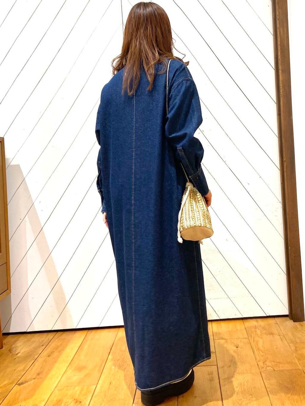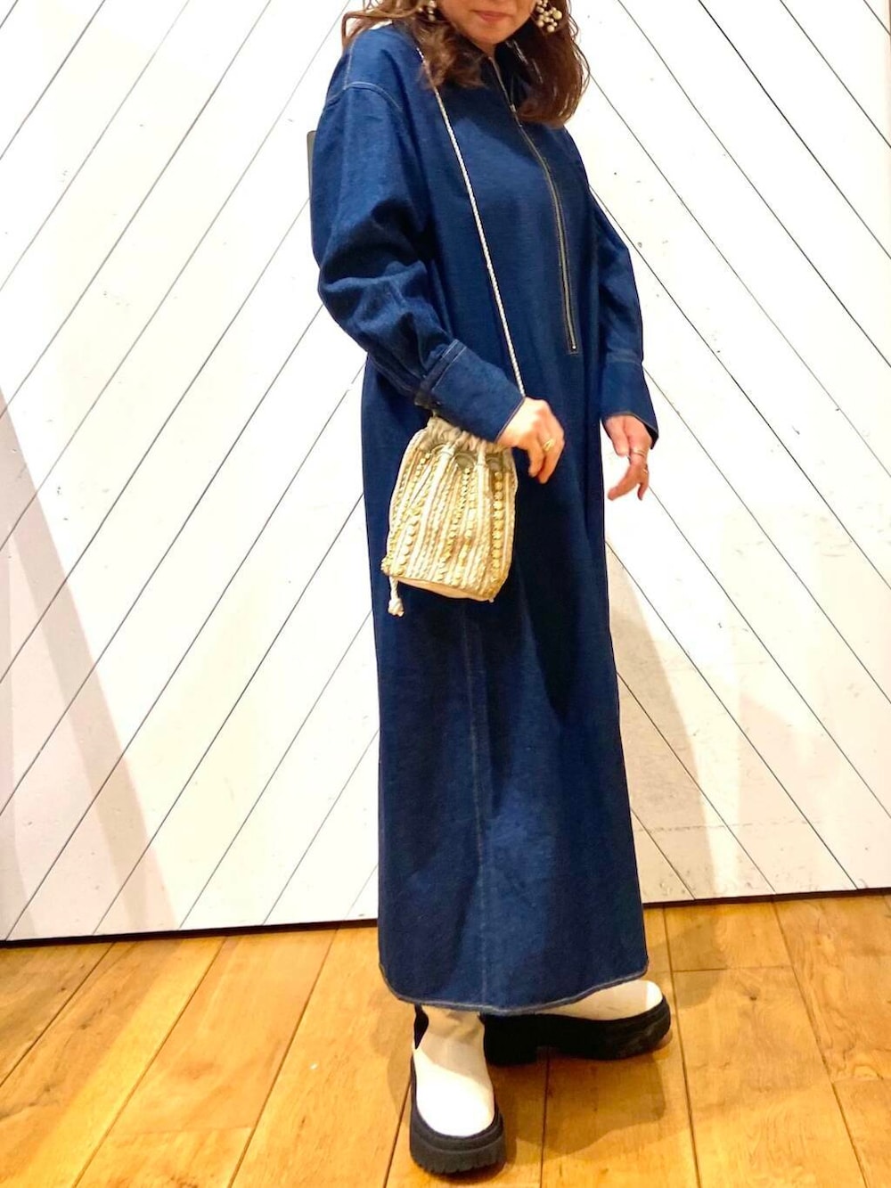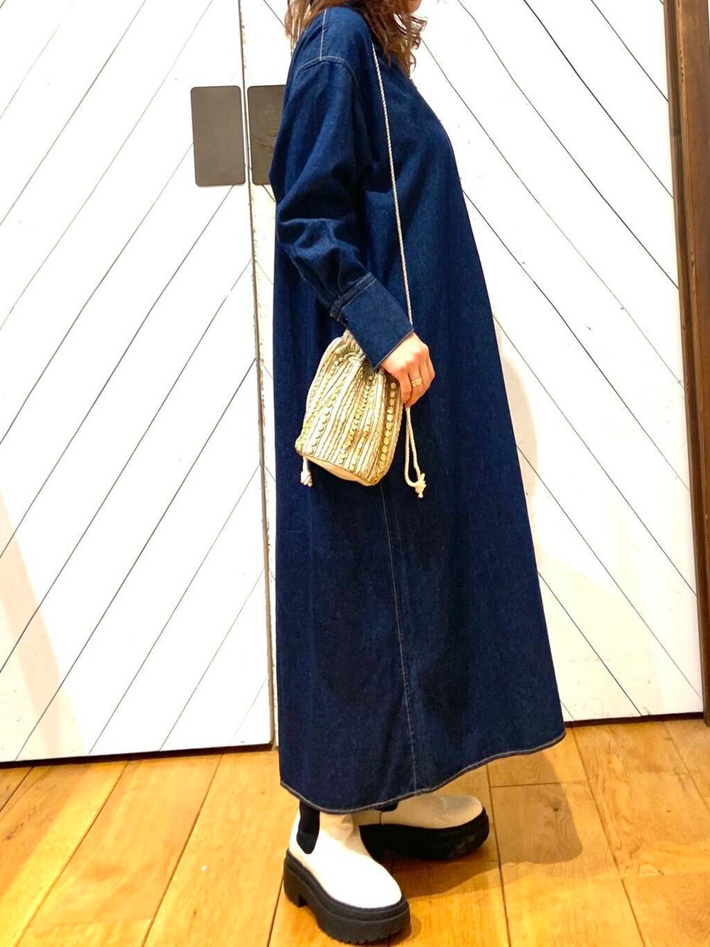 キレイめデニムワンピにビーズ刺繍がされた巾着バッグ♡