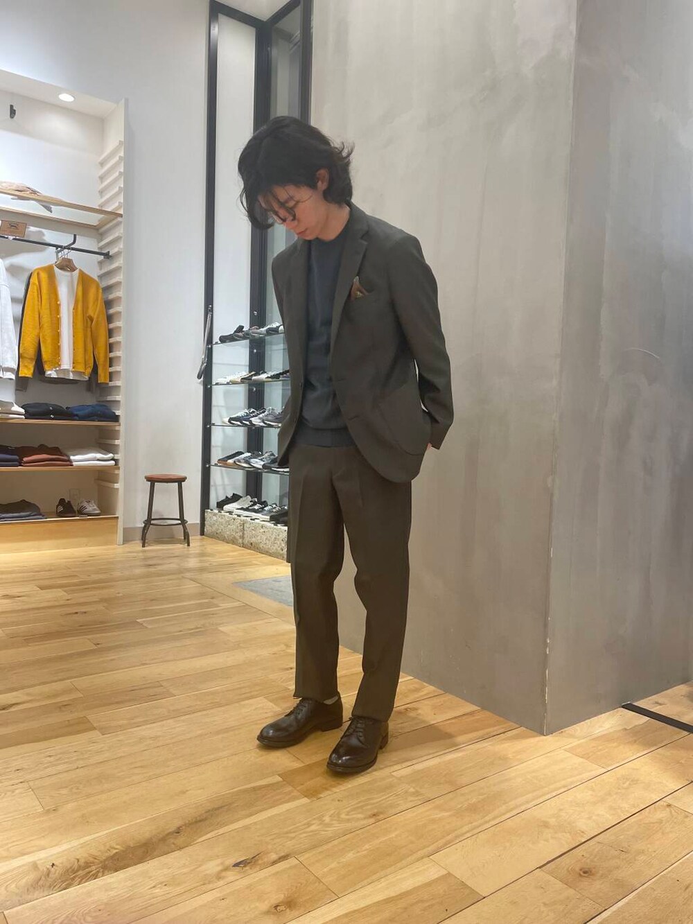 スーツやセットアップはブラック、ネイビーなどが定番ですが、こちらのカーキは落ち着いた深めの色味で大人びた渋い印象を与えてくれます。
