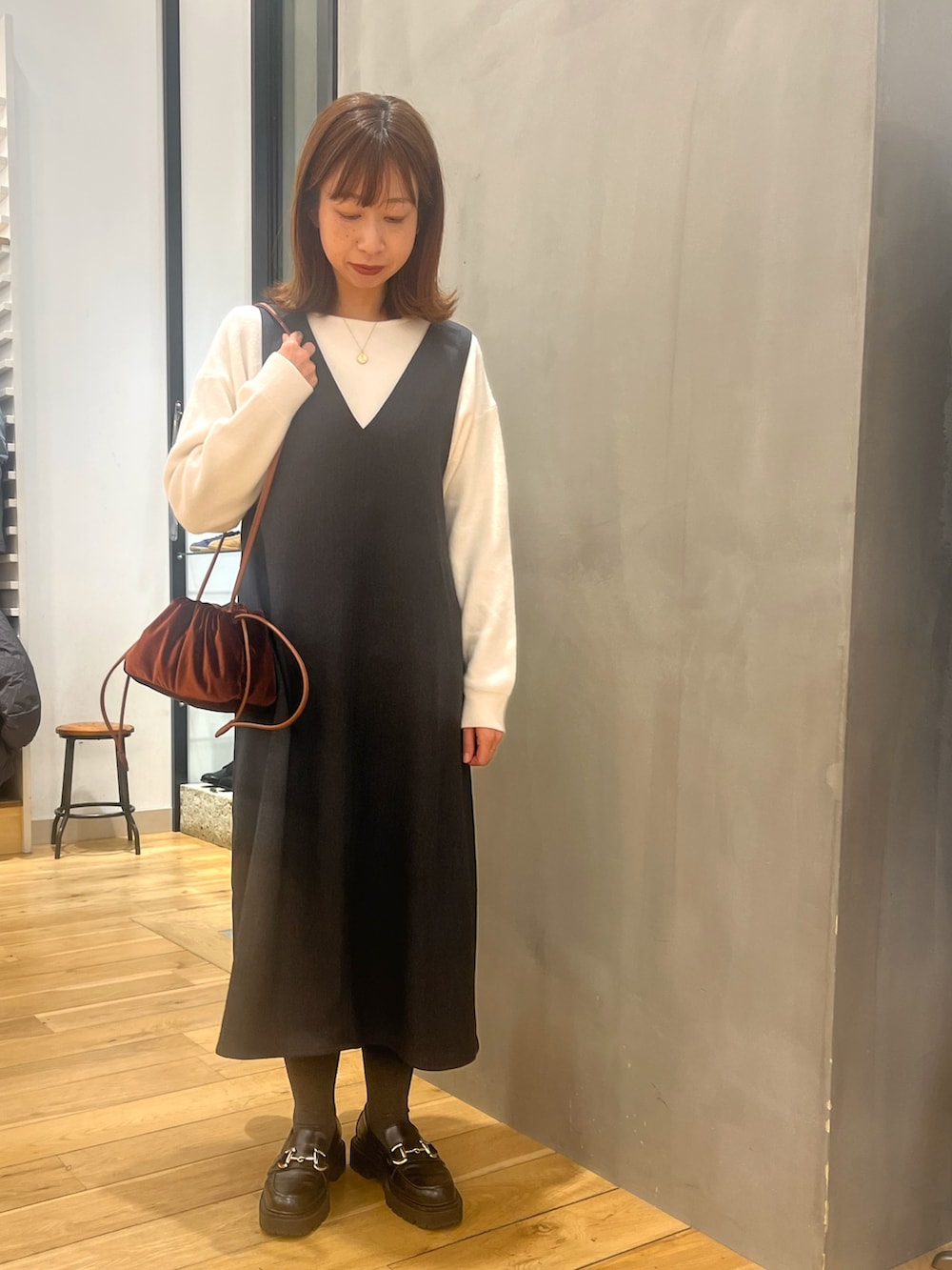 コーディネートのポイントにもなるベロアのバッグもオススメです