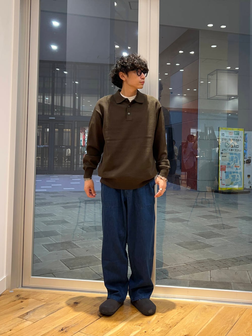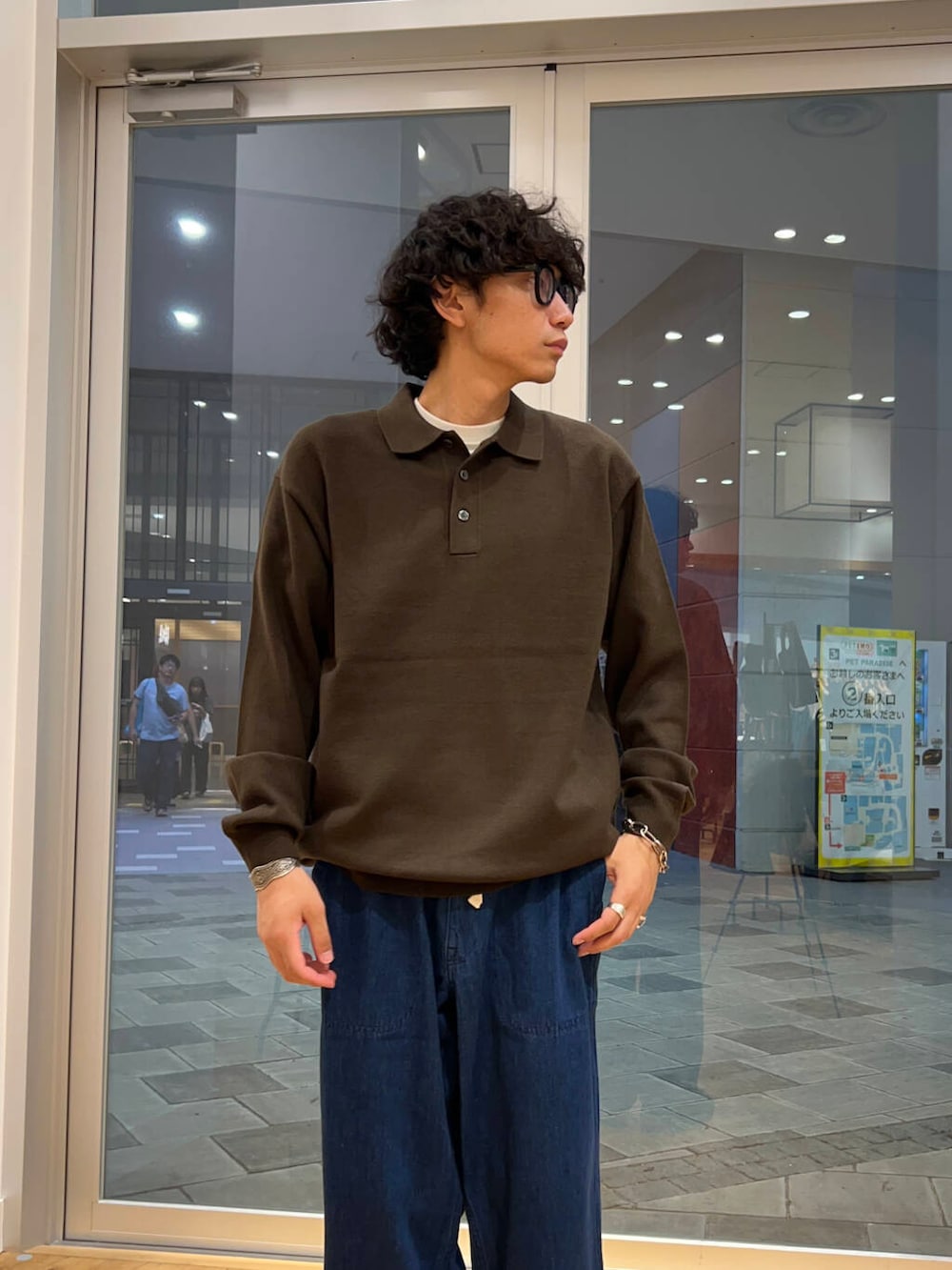 ニットポロにデニムでカジュアルスタイル