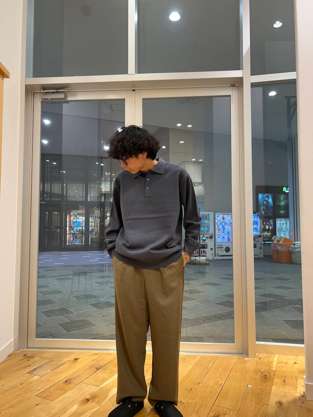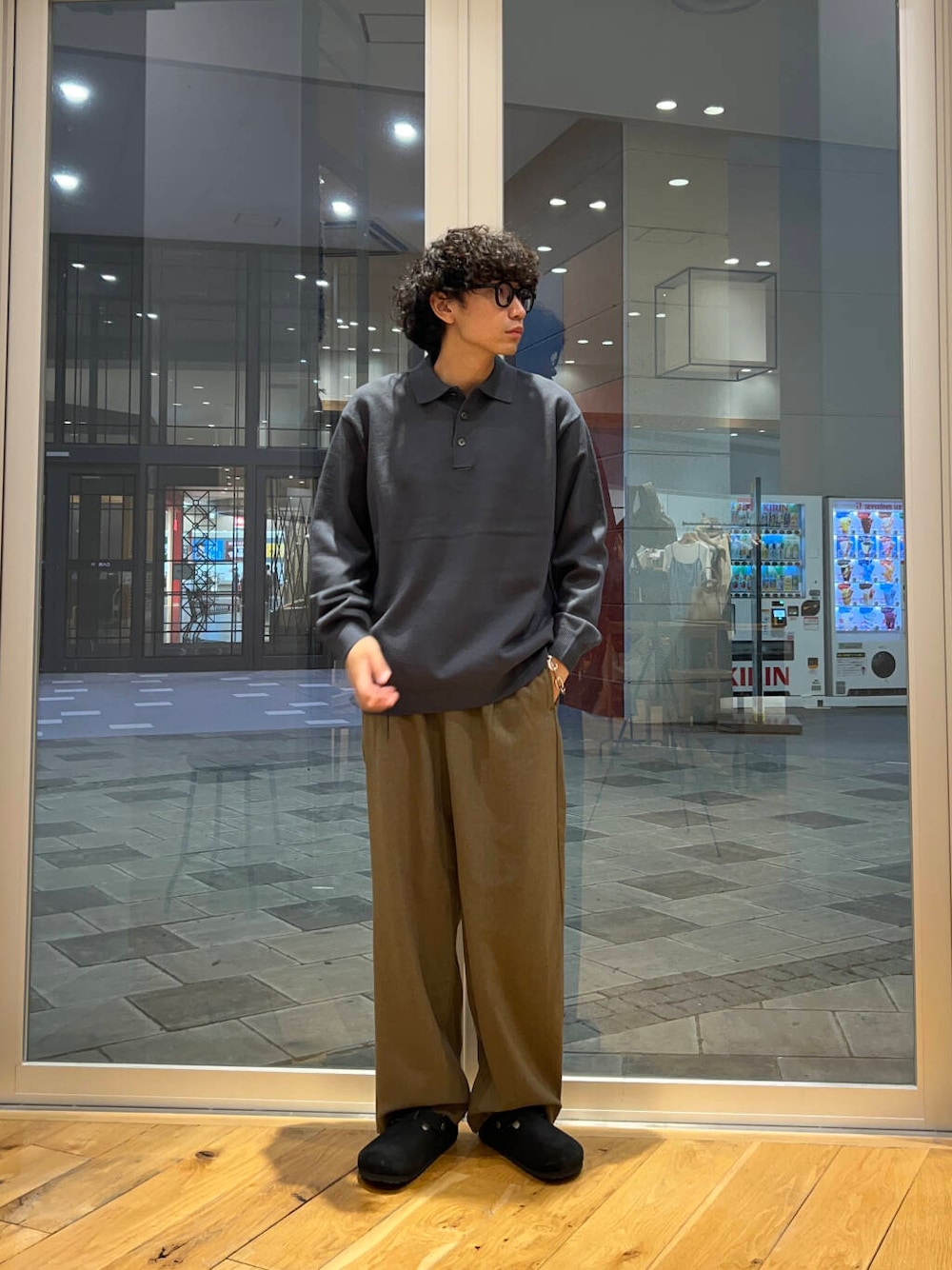 秋らしくニットポロを着用したスタイリングです。