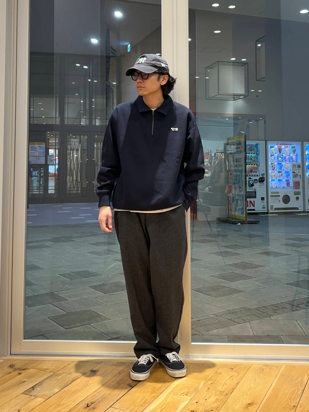 スウェットとスラックスでキレイめカジュアルスタイル。