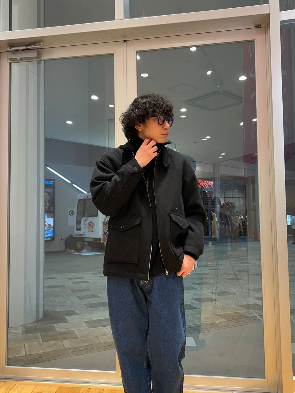 コートのインナーにドライバーズを忍ばせたスタイリング。
