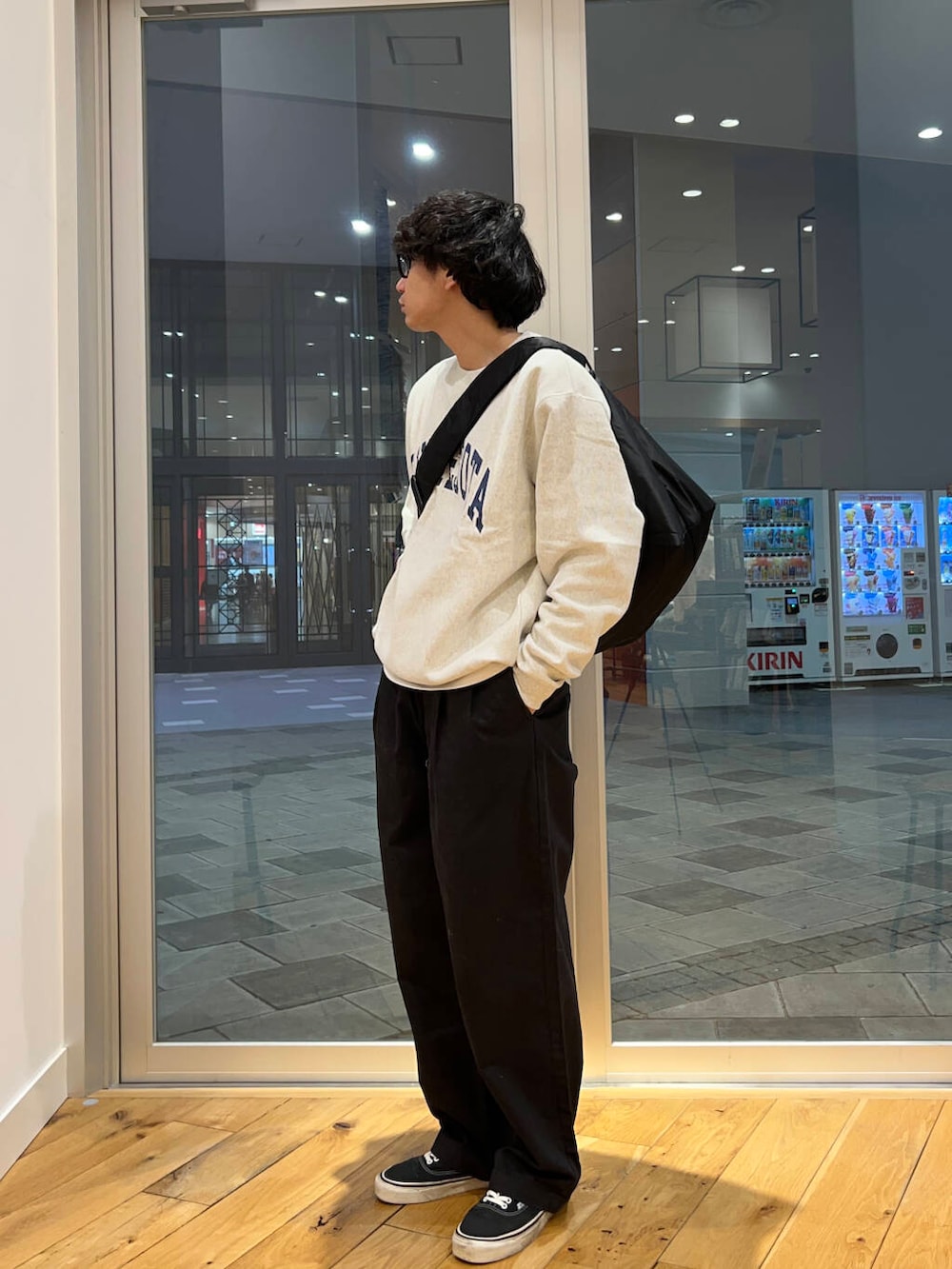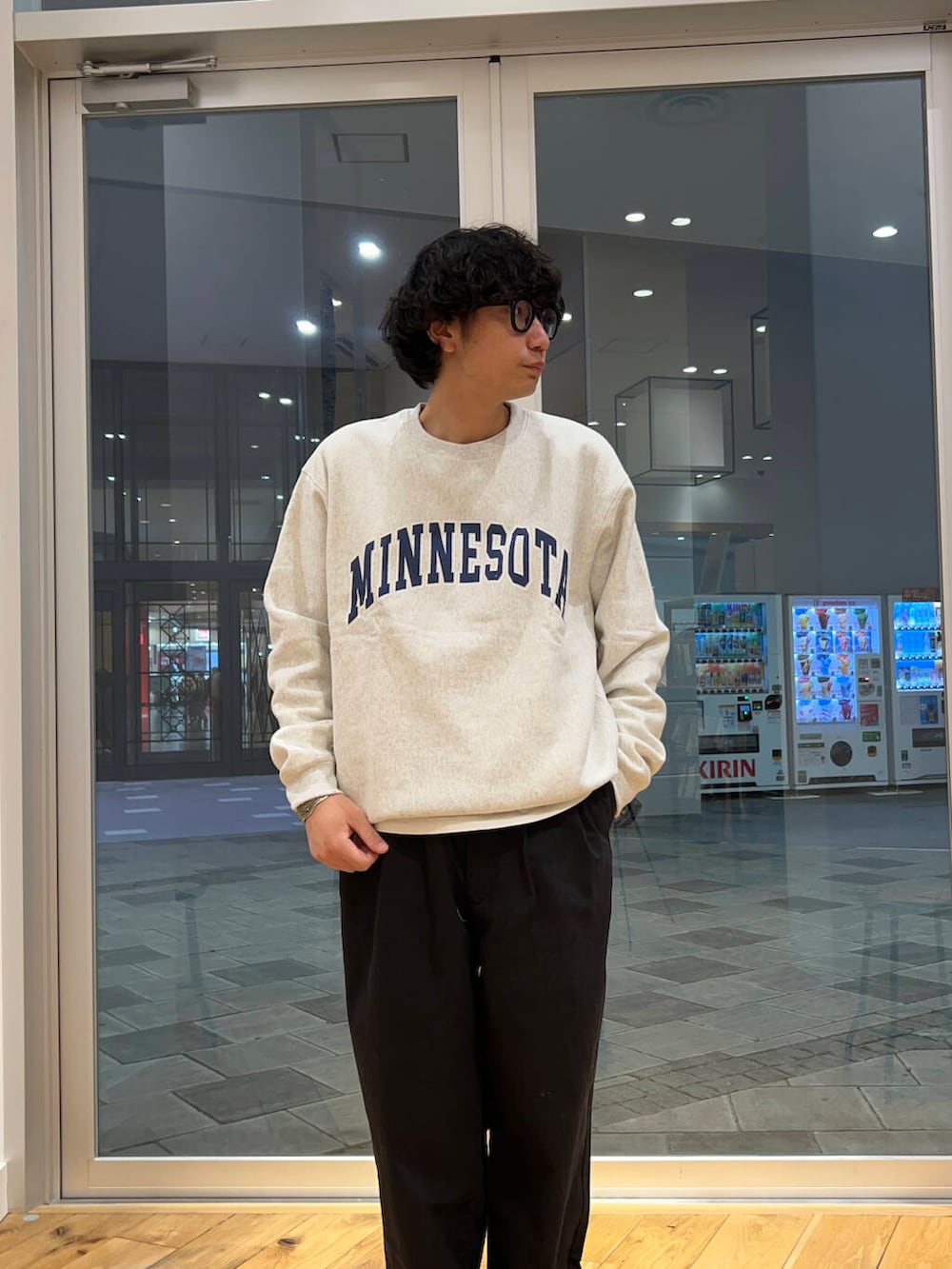 カレッジ系のスウェットは1枚で存在感あるスタイリングに。