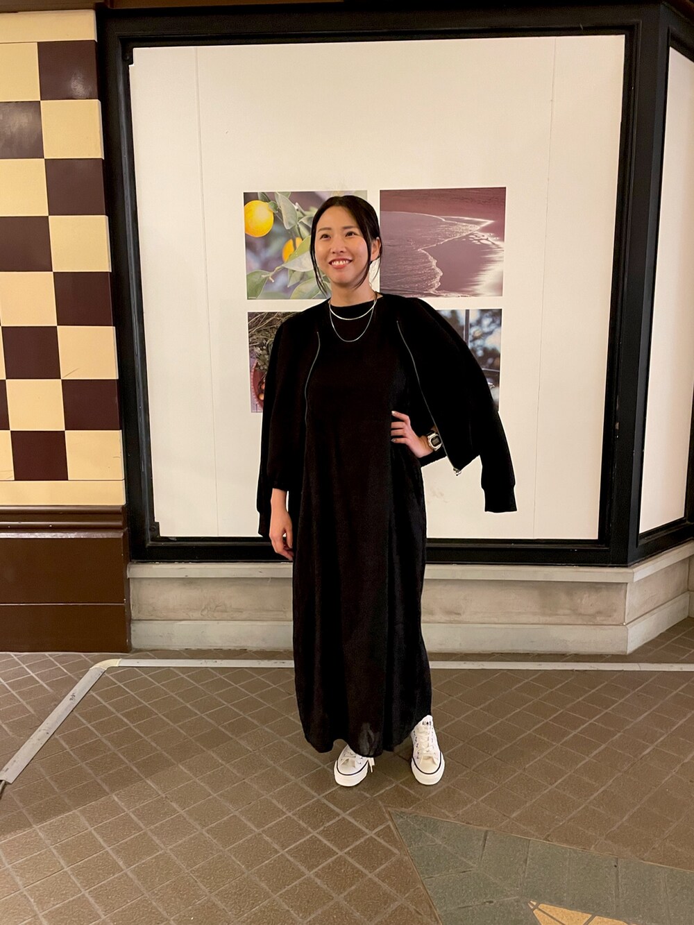 キレイめのワンピースとカジュアルなパーカー風アウター、スニーカーでMixスタイルにしてみました。シアーワンピースで今年らしさも取り入れてみました☻