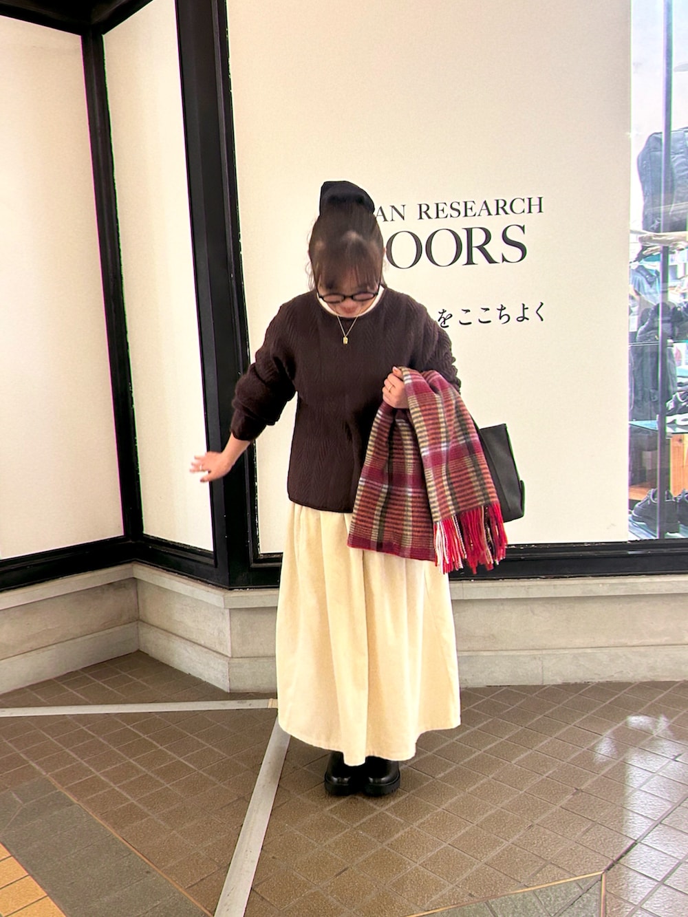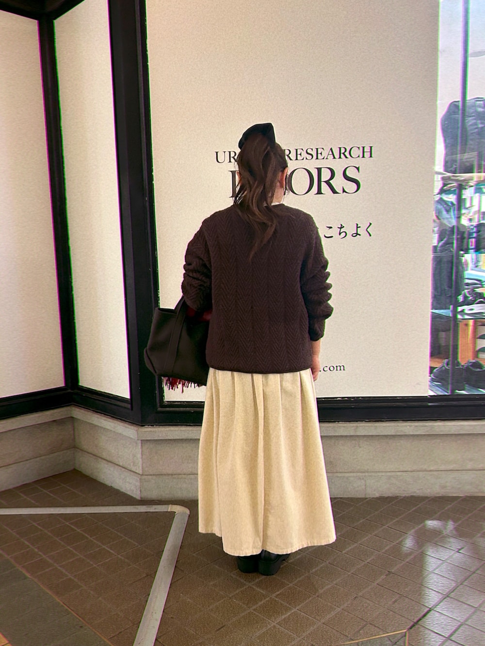 こちらのスカート、コーデュロイが季節感を出してくれ、ふんわりシルエットがいい感じです。