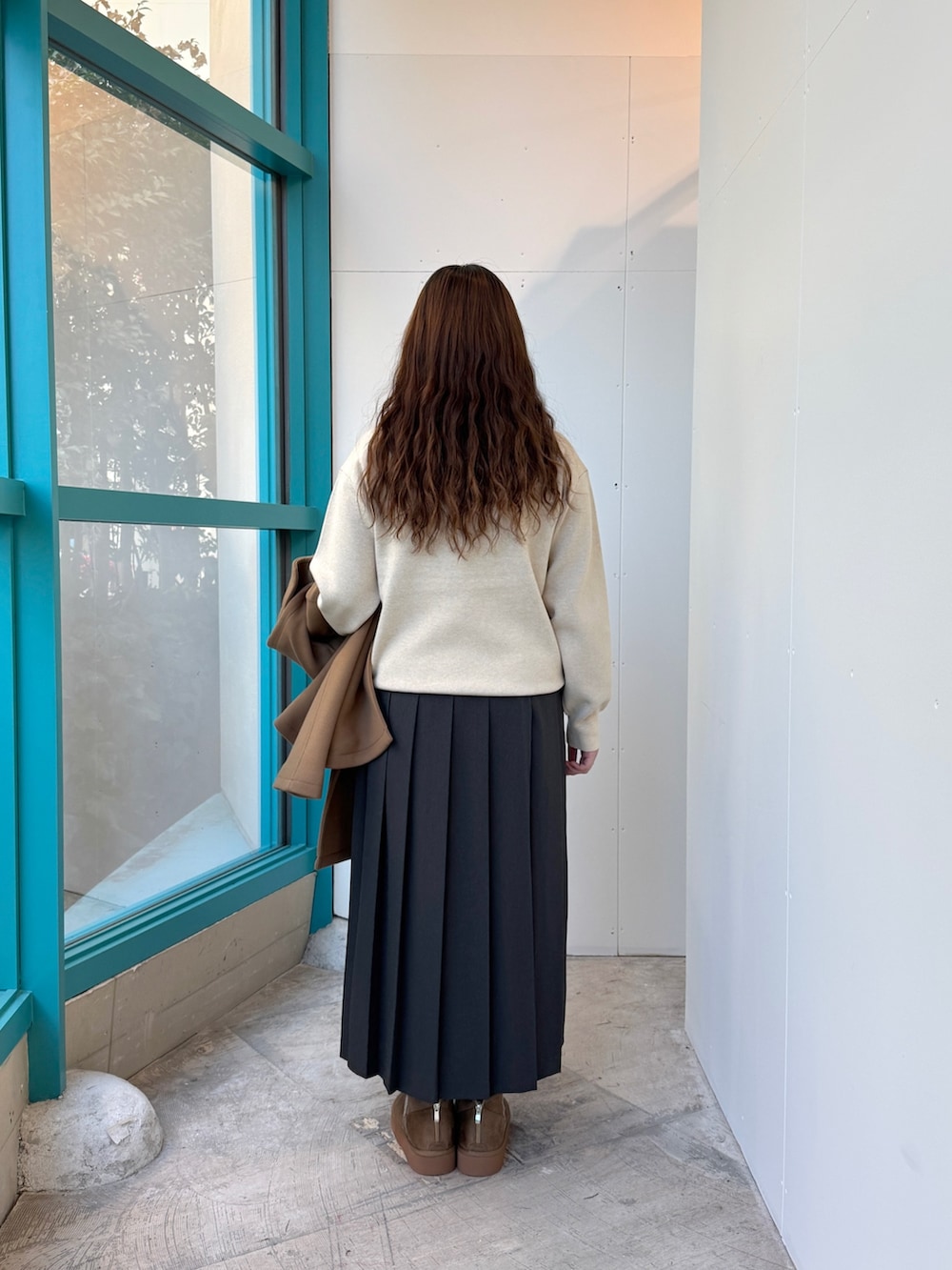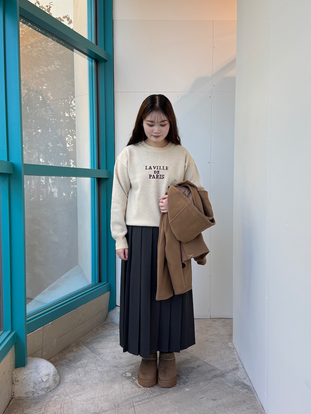 ムートンブーツと色を合わせて統一感と季節感を出しています🐈