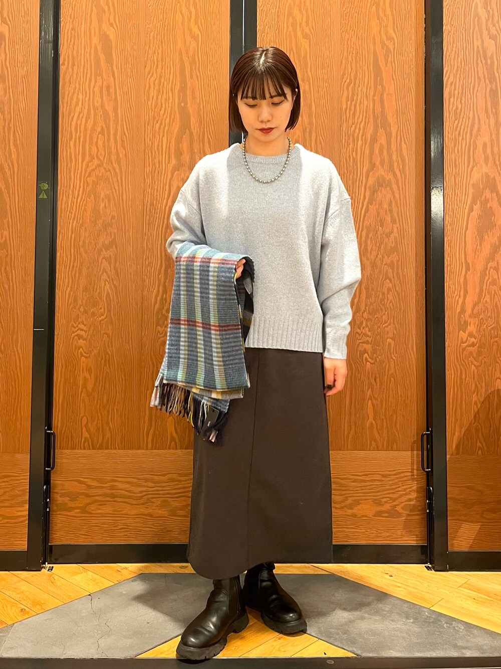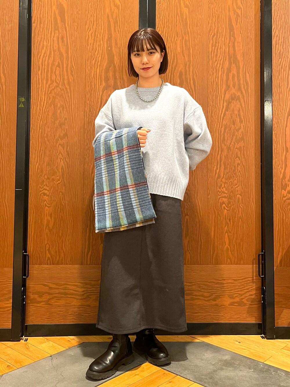 落ち着いた色味のブルーニットにチャコールグレーのスカートを合わせることで、全体的に柔らかく大人っぽいコーディネートになります!