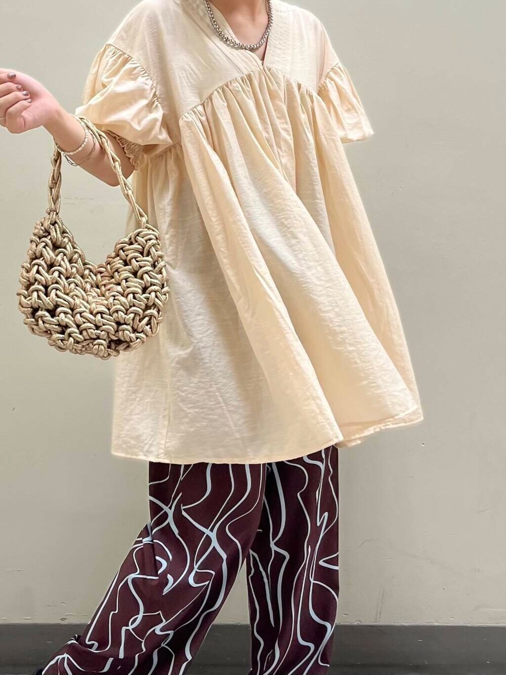腰回りをカバーしてくれる丈感で、Vネックなので華奢見えします!