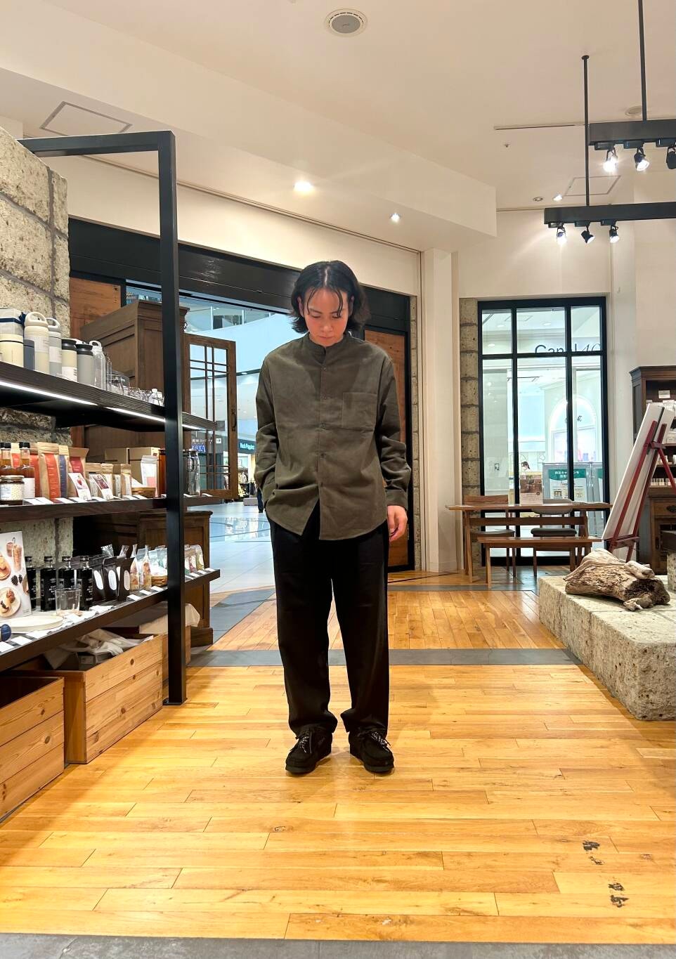 コーデュロイバンドカラーシャツ大人っぽいカラーで合わせやすく簡単にかっこいいコーディネートを組めると思います!