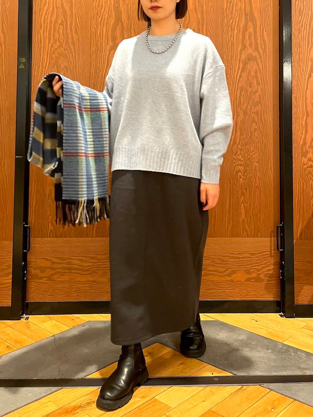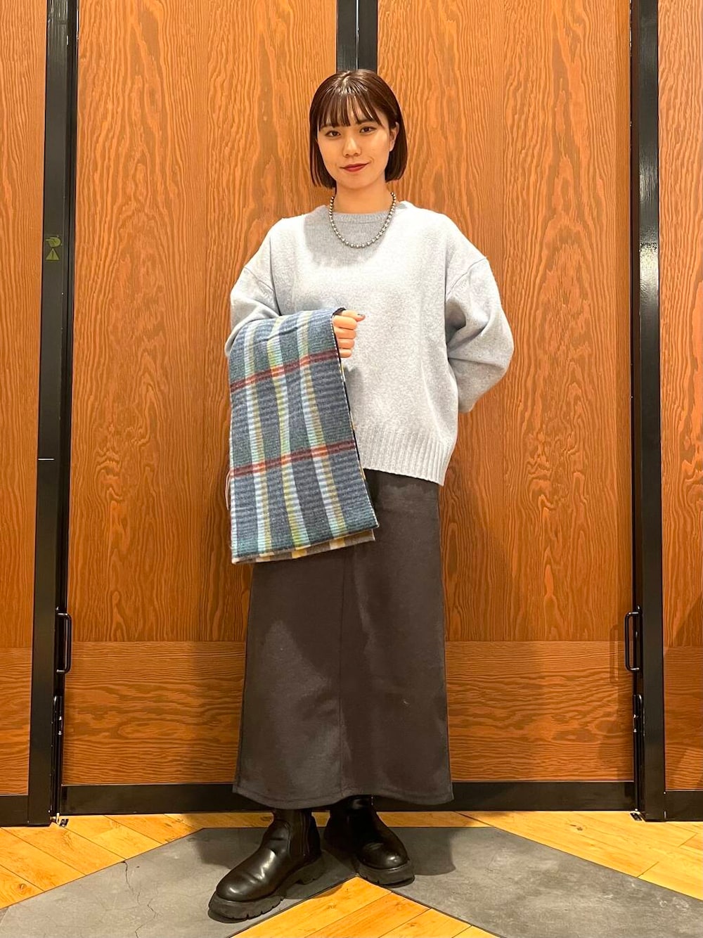 落ち着いた色味のブルーニットにチャコールグレーのスカートを合わせることで、全体的に柔らかく大人っぽいコーディネートになります!
