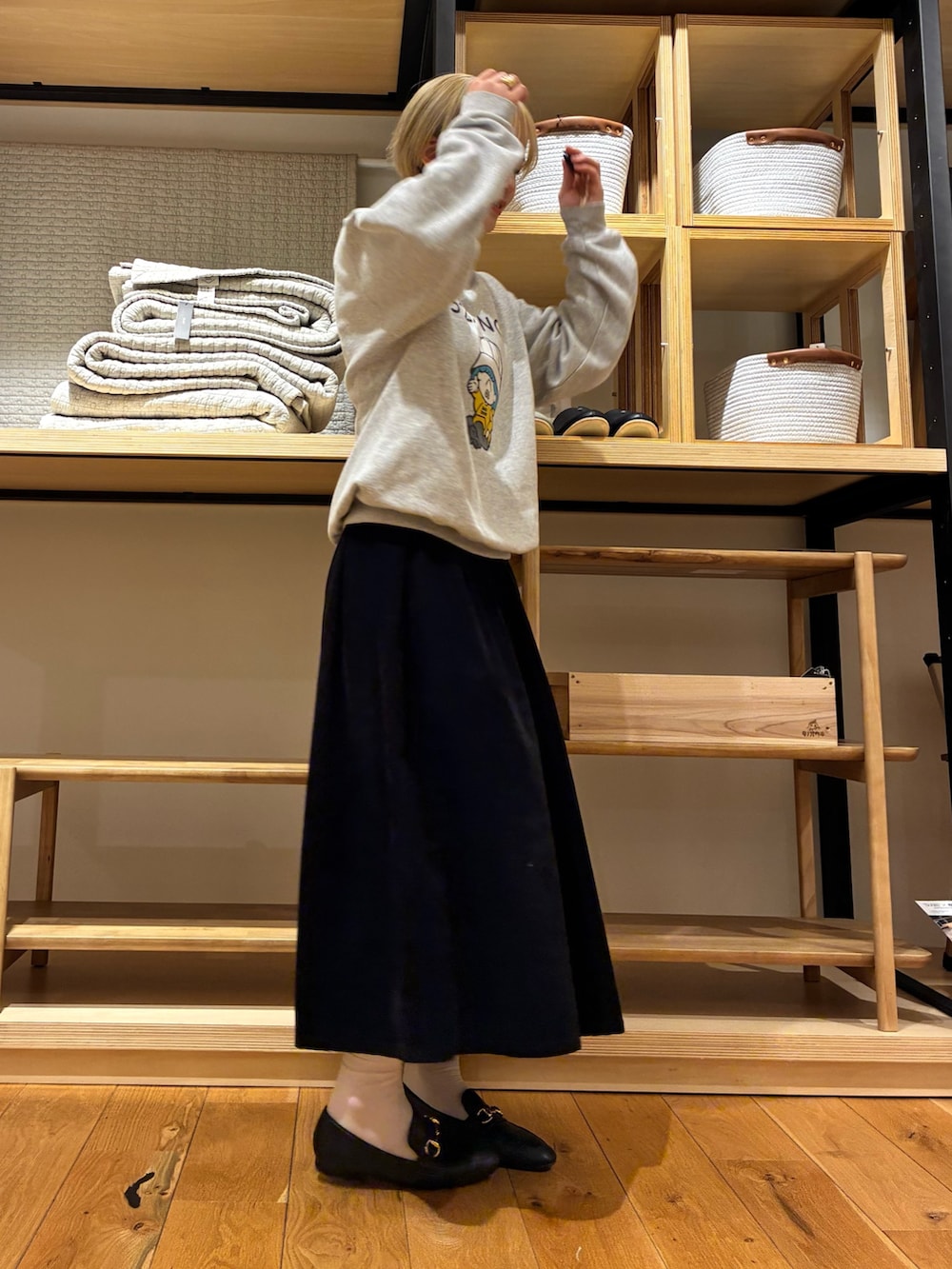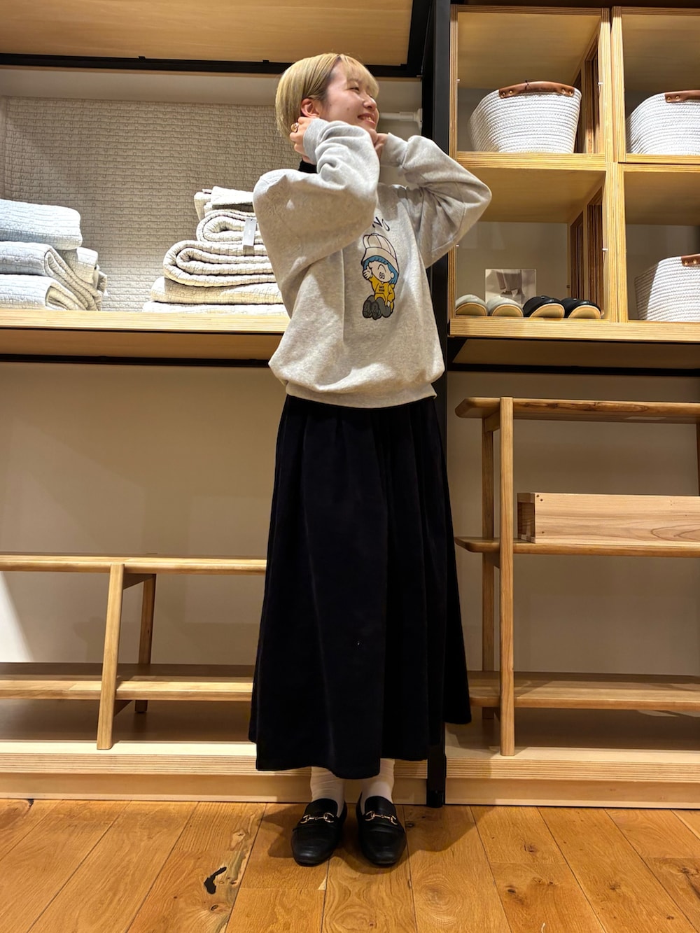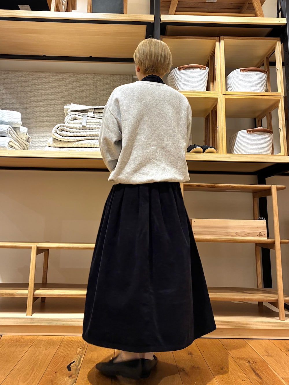 黒コーデュロイスカートは、なんでも合わせやすくて、生地感的にもこれからの季節にピッタリですね〜