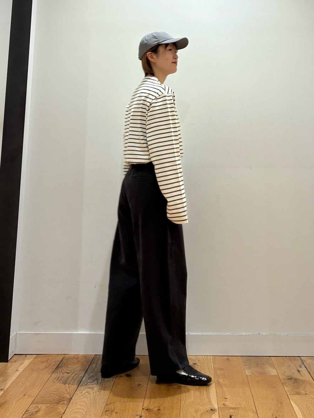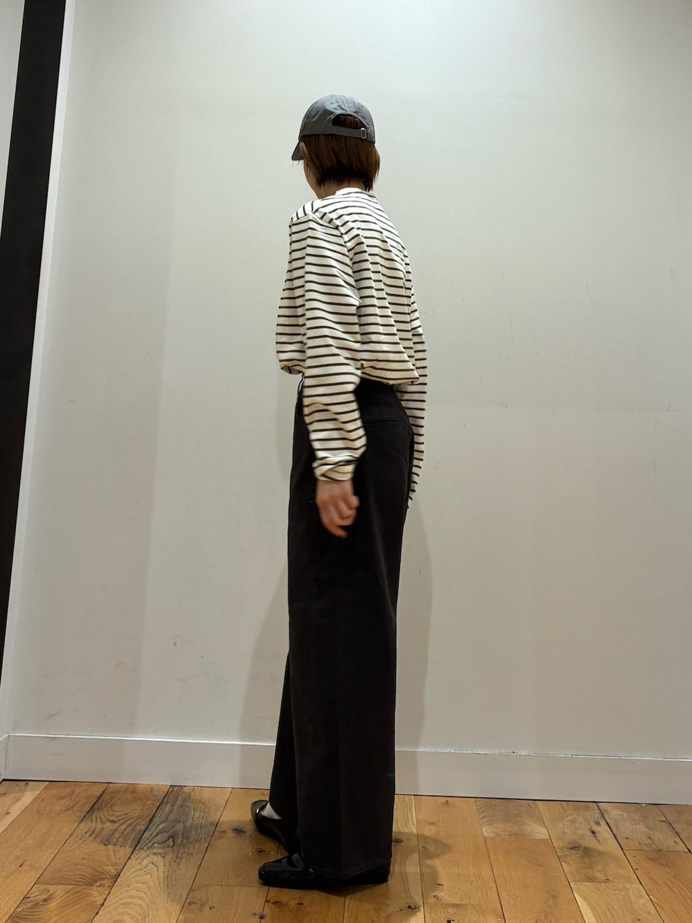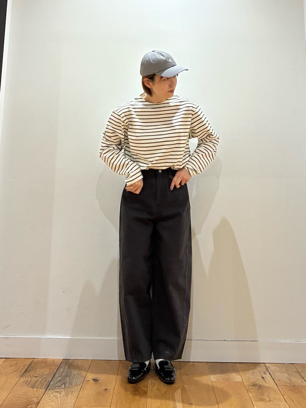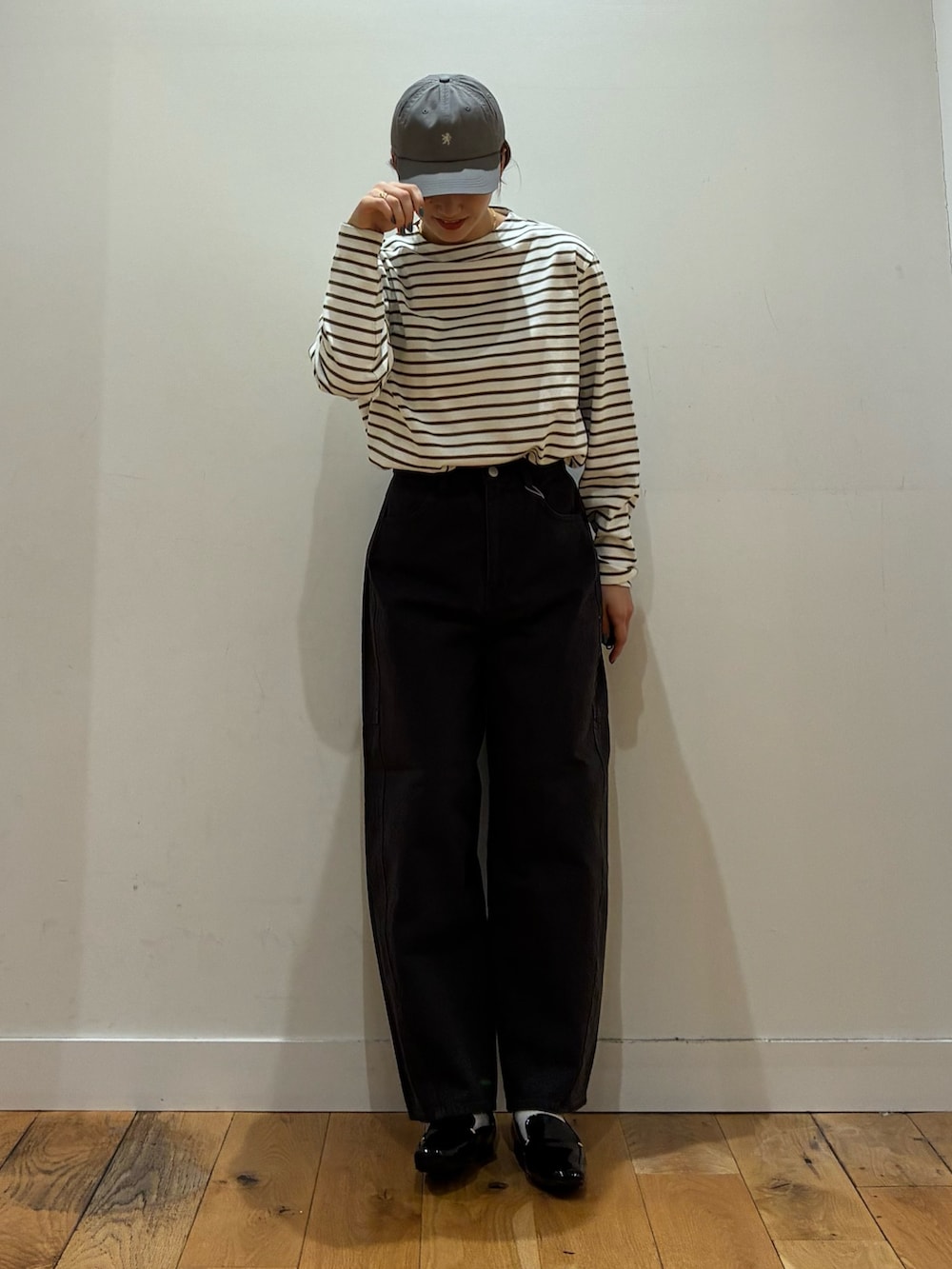 シンプルコーデですが、緑のボーダーが映える様なデニムのカラーですよね!