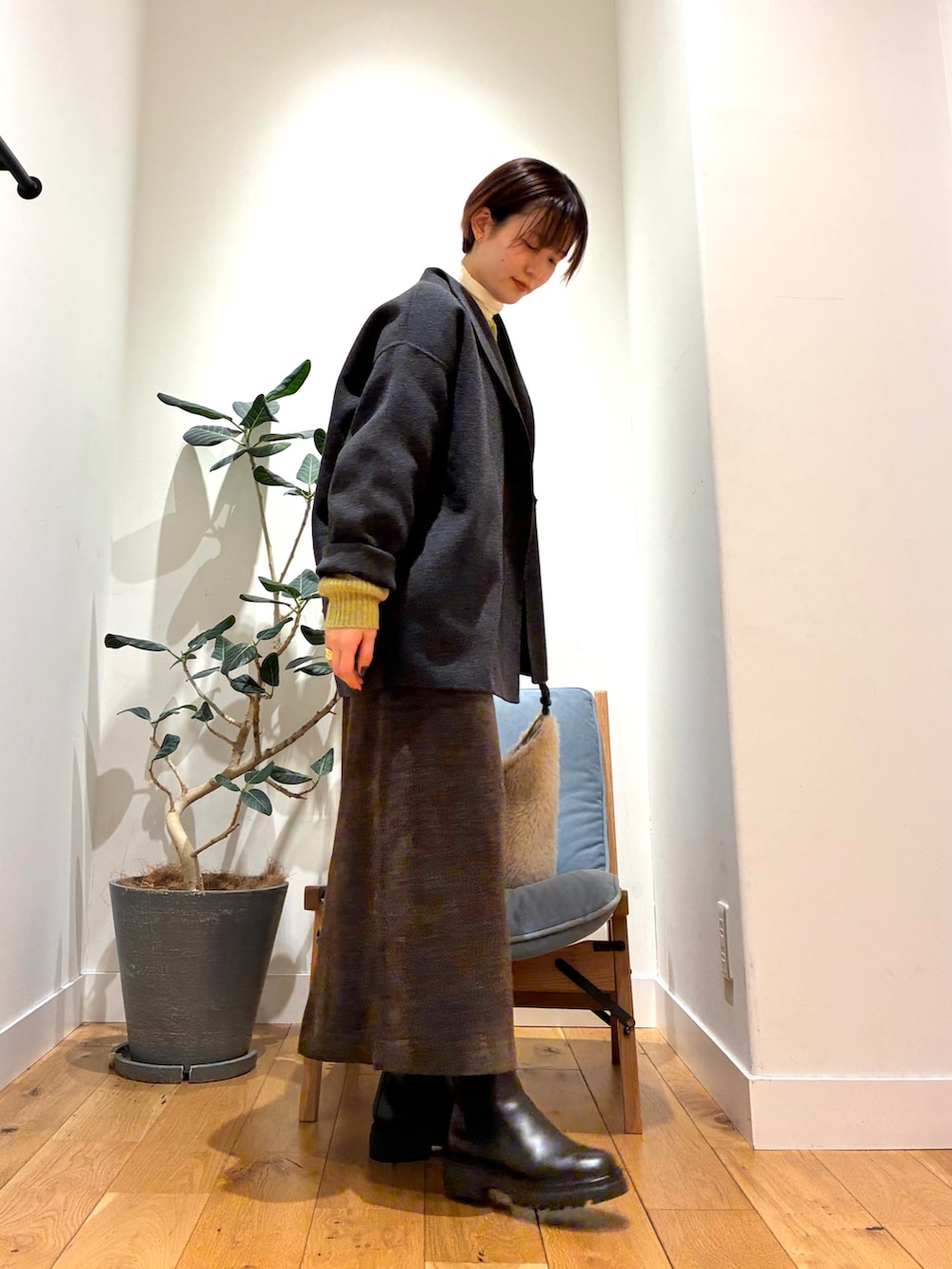 羽織っているコートは、ウールのコートで、とにかく軽い!!そして、カチッとしすぎず抜け感もある為、色んな場面で大活躍しそうな今時期にピッタリのコートですね〜😌