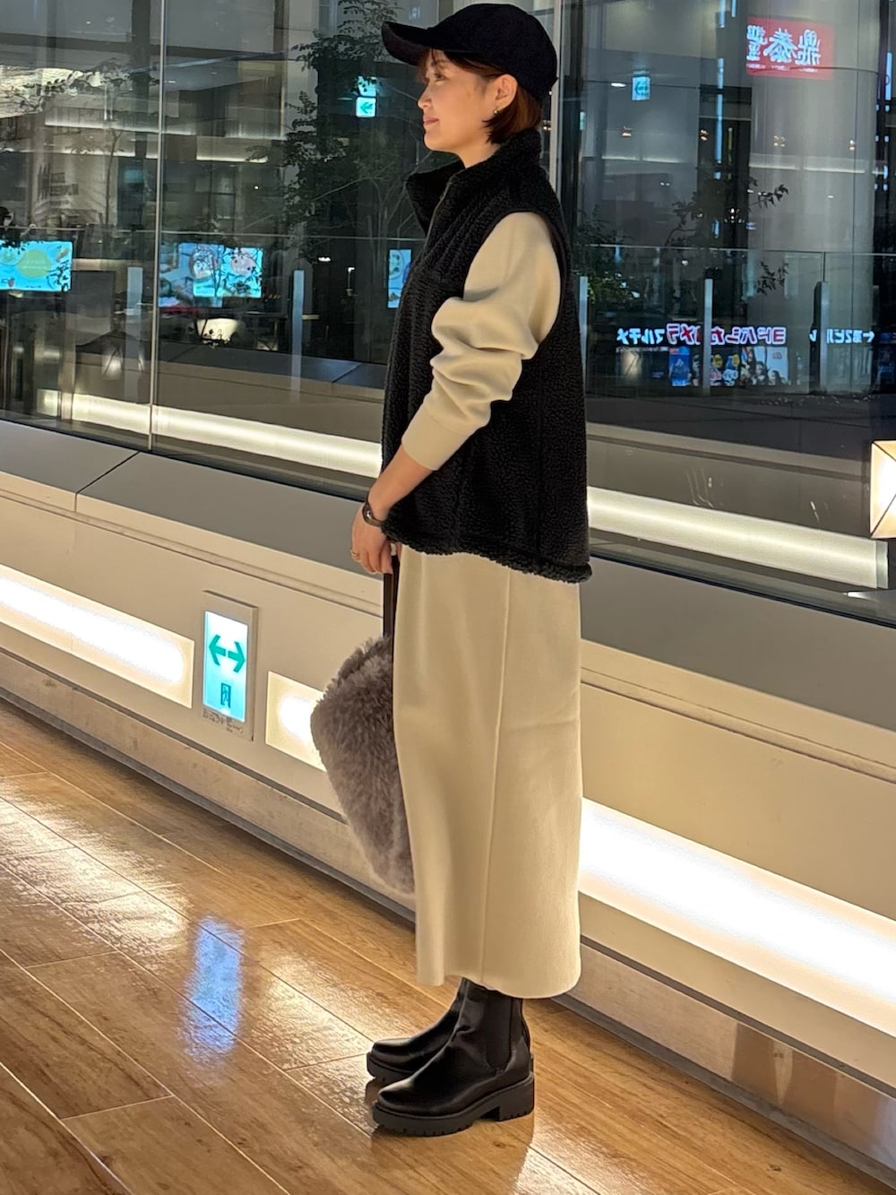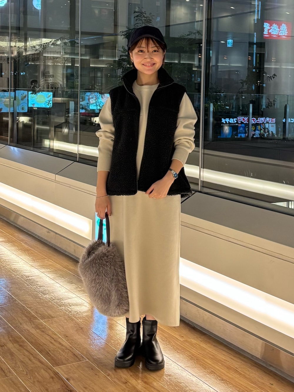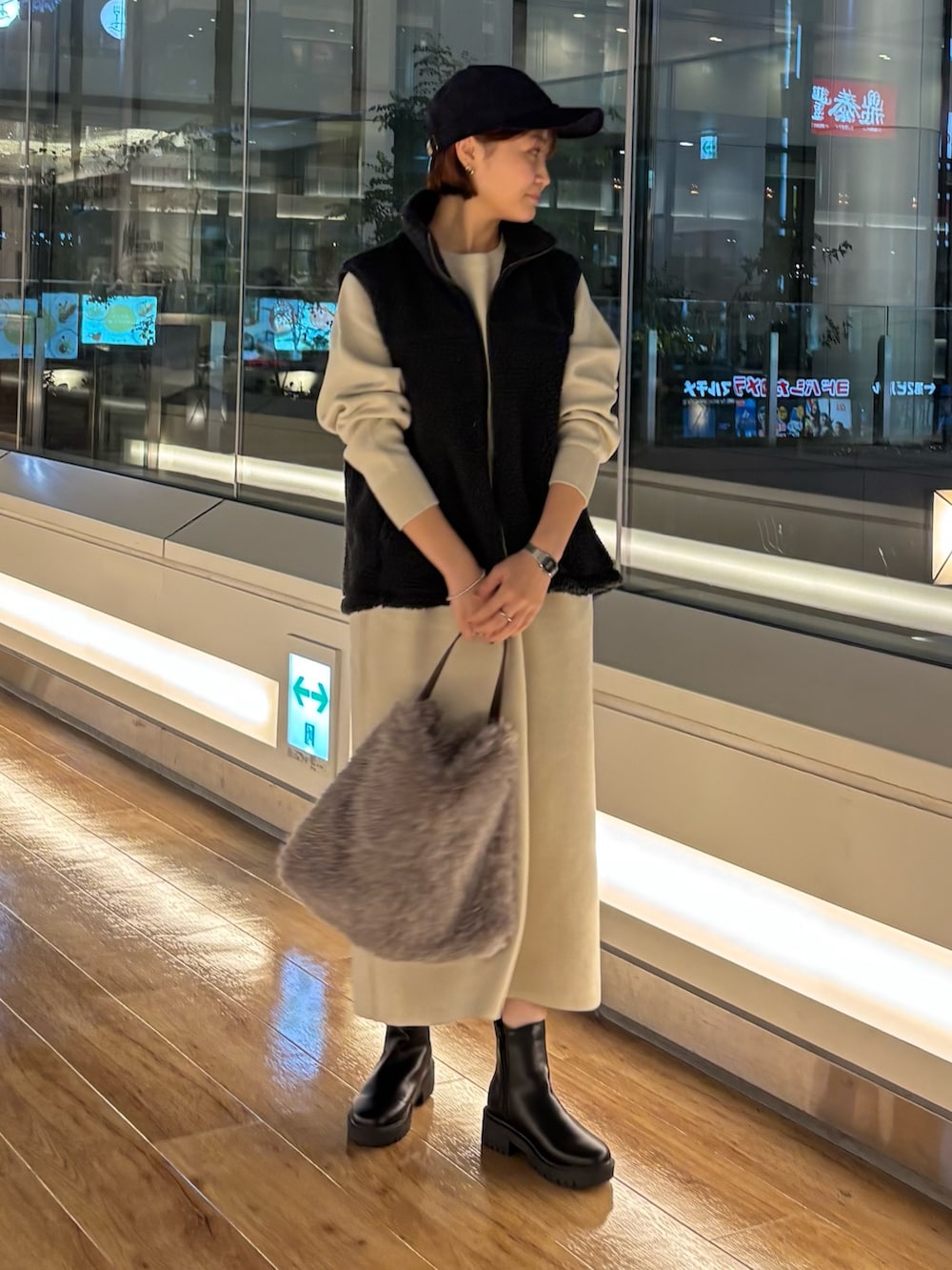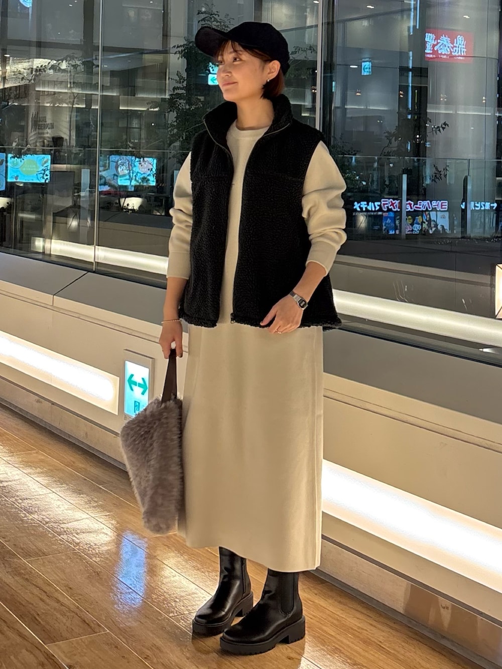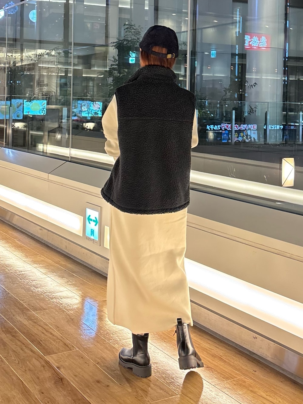 ボアジップベストは羽織るだけで着こなしがでるのと、腕周りがゆったりとしているので肉厚なアイテムと重ねてもバランスよく着用できますよ◎