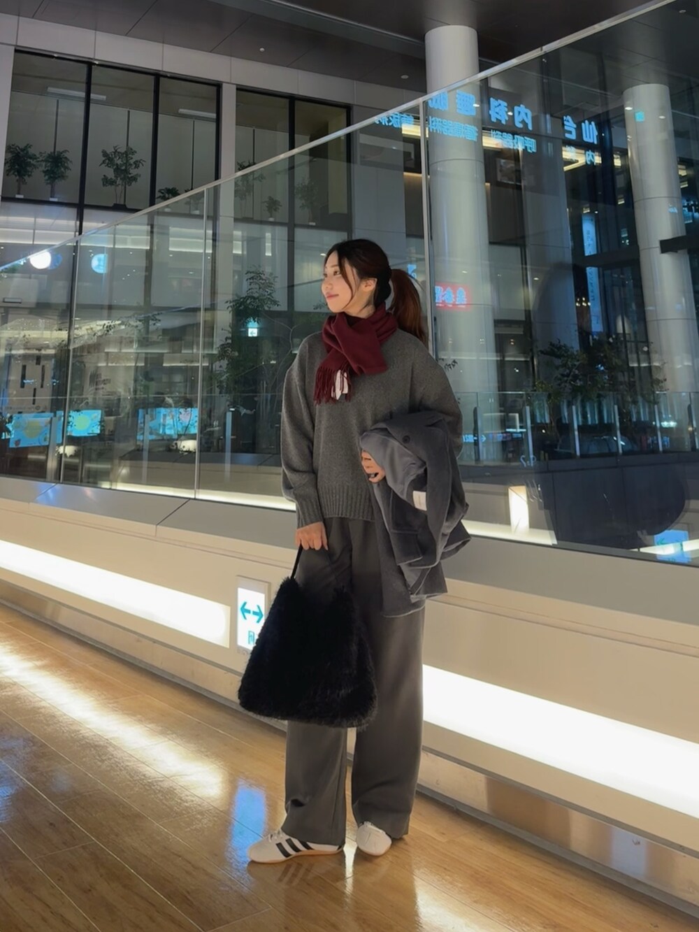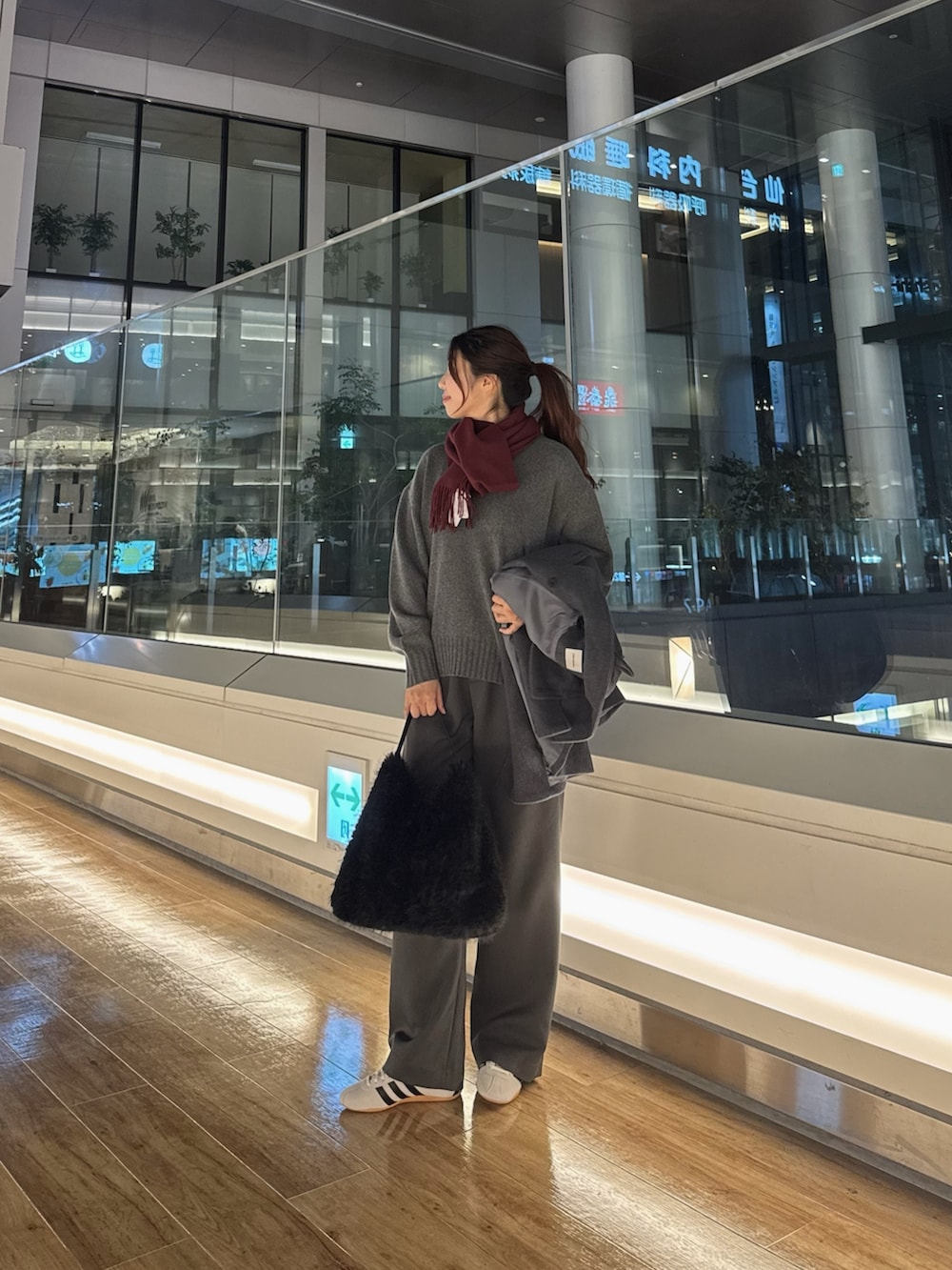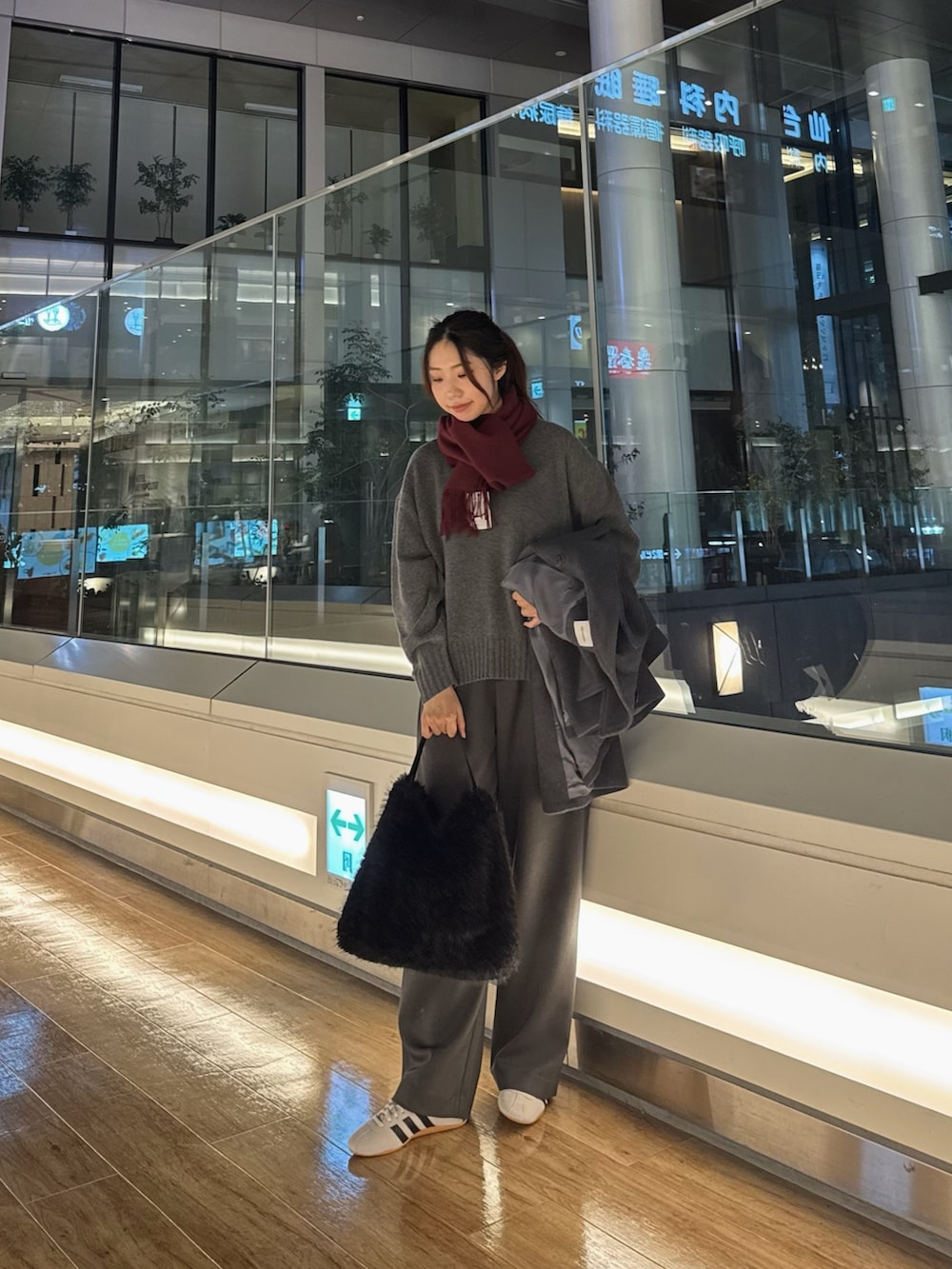マフラーは、ウールにカシミヤをブレンドした触り心地の良いチェリーレッドのマフラーを着用し寒さ対策を🧣