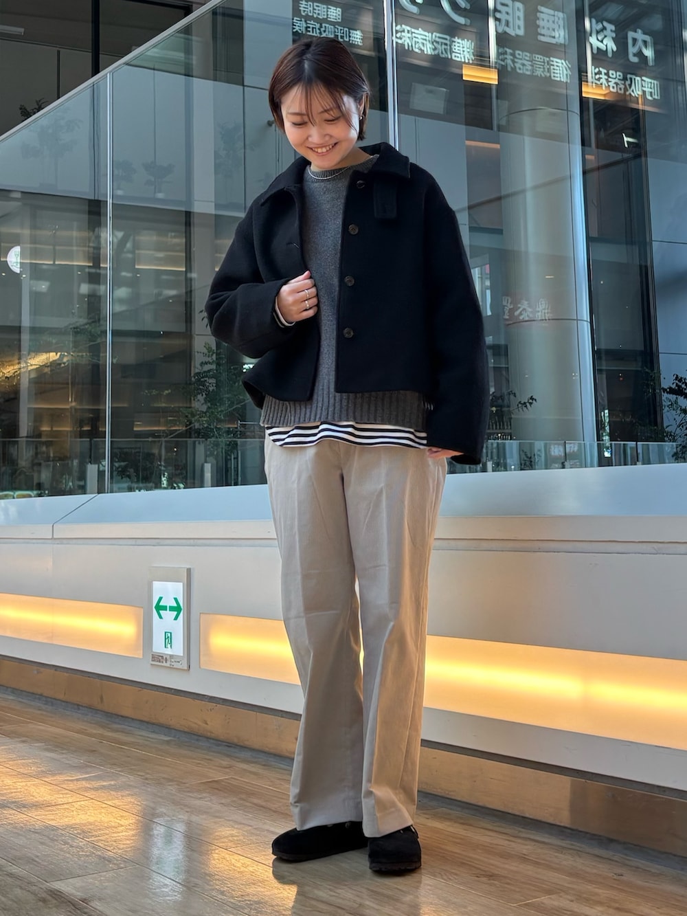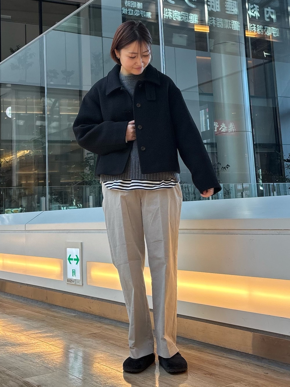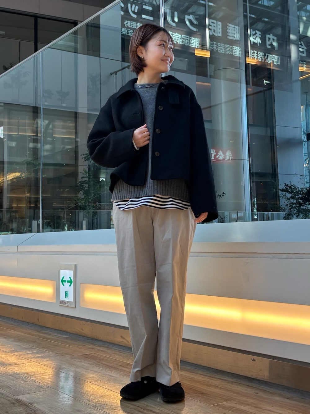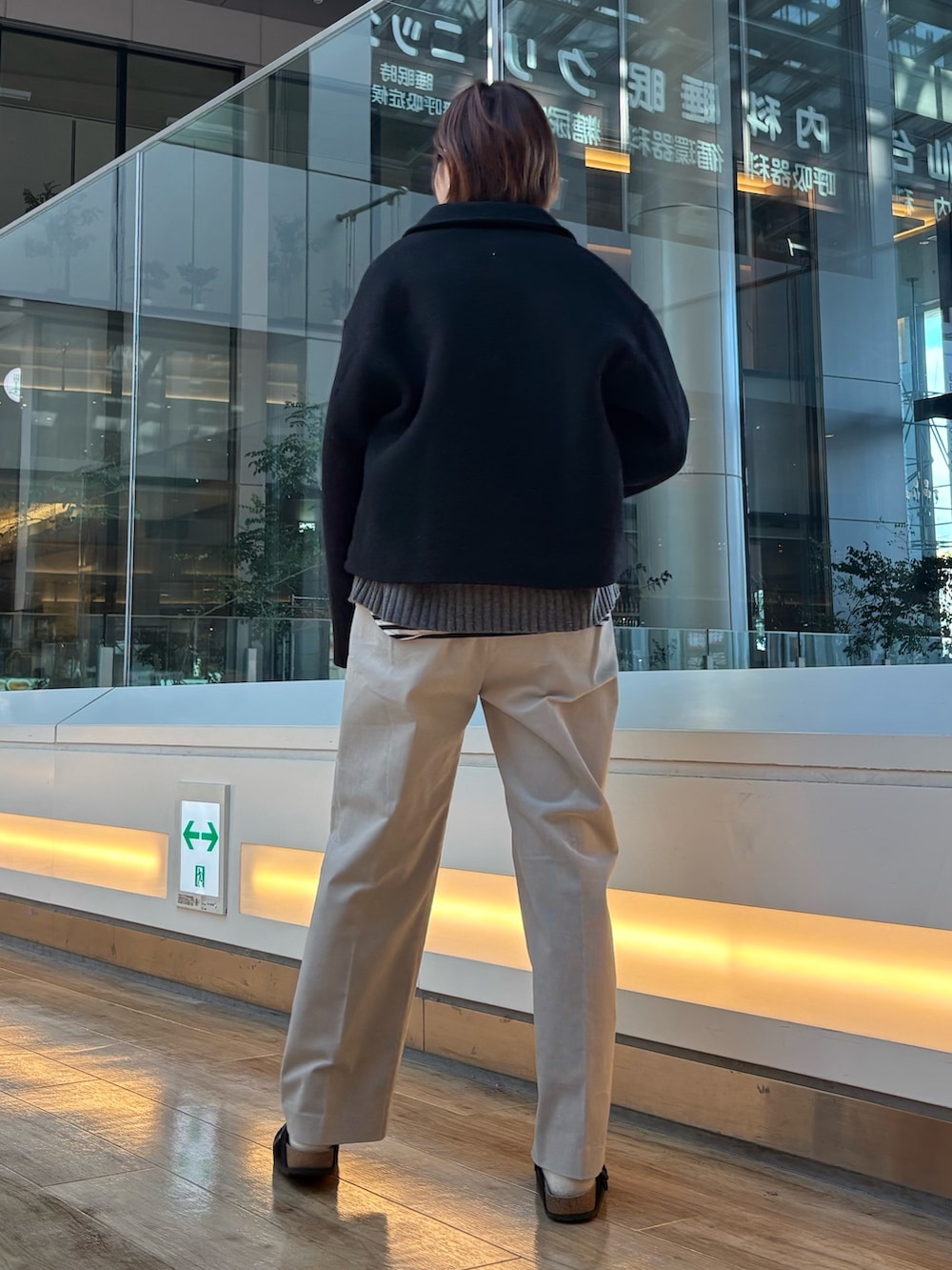インナーをコットンラウンドTシャツにしています。ボーダーが少し見えるのでシンプルなアイテムにアクセントになりかわいいですよ。