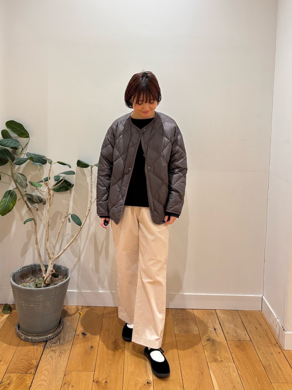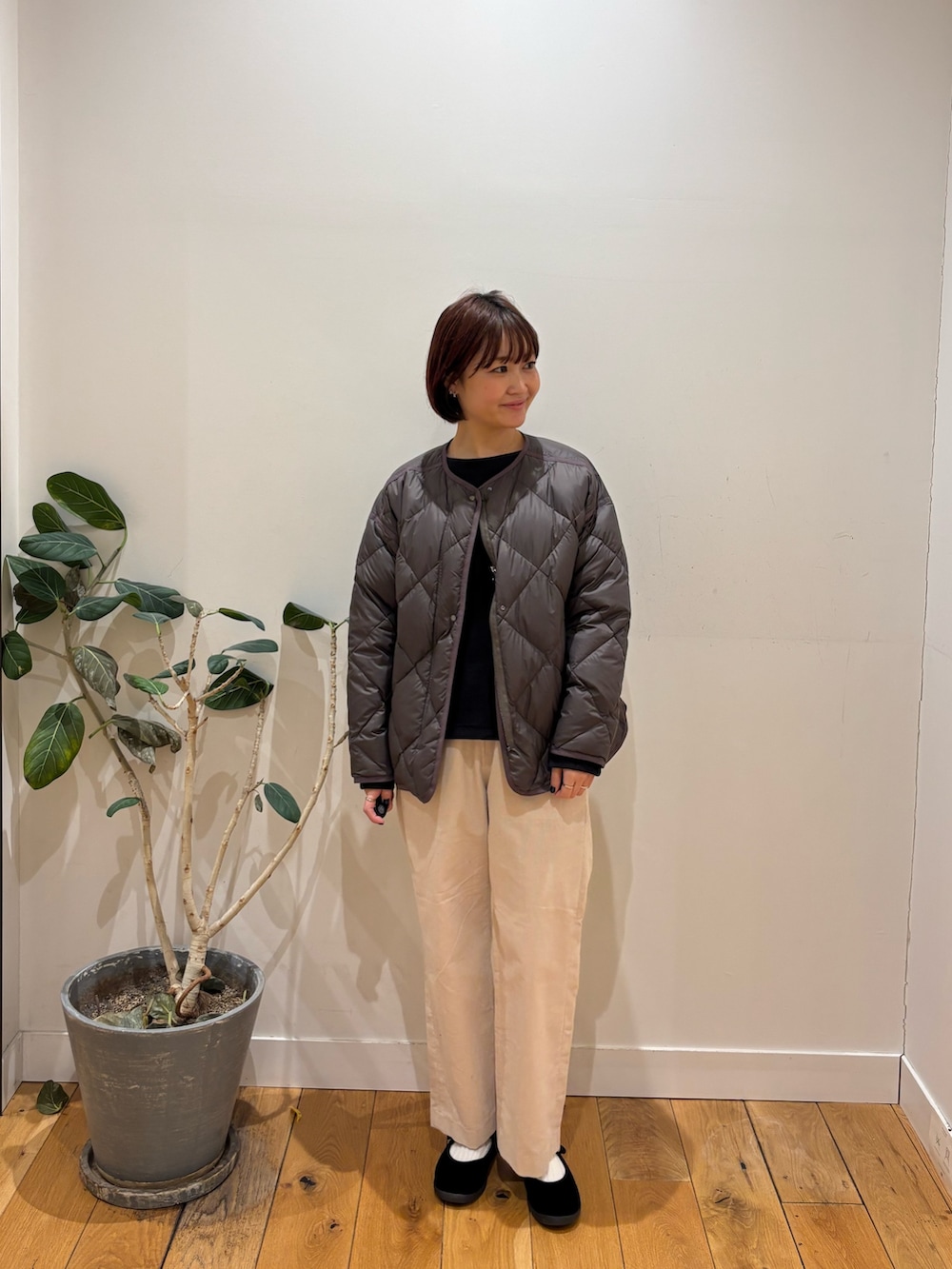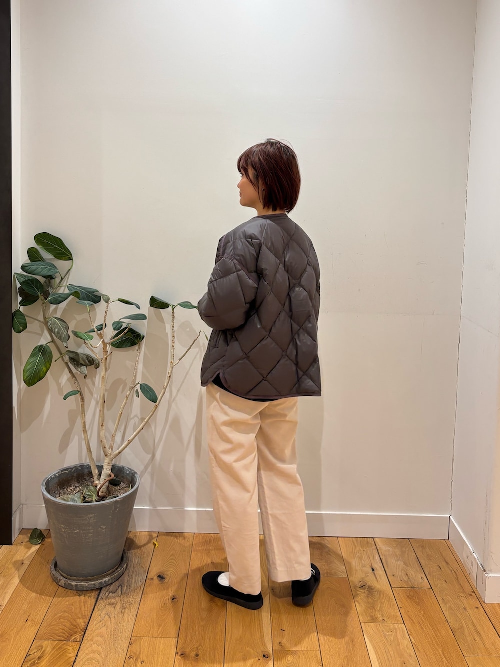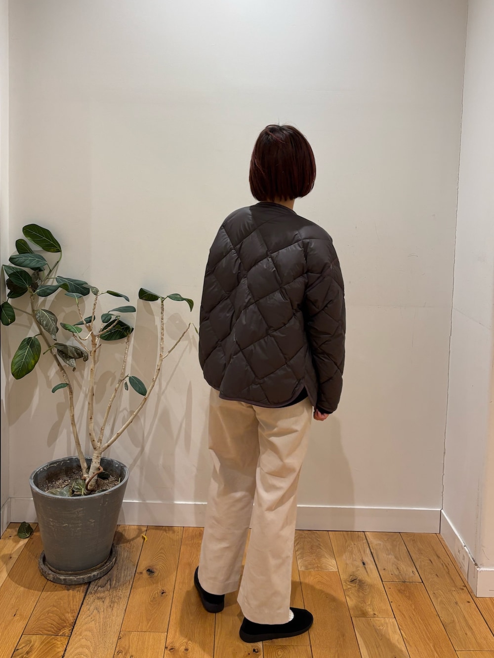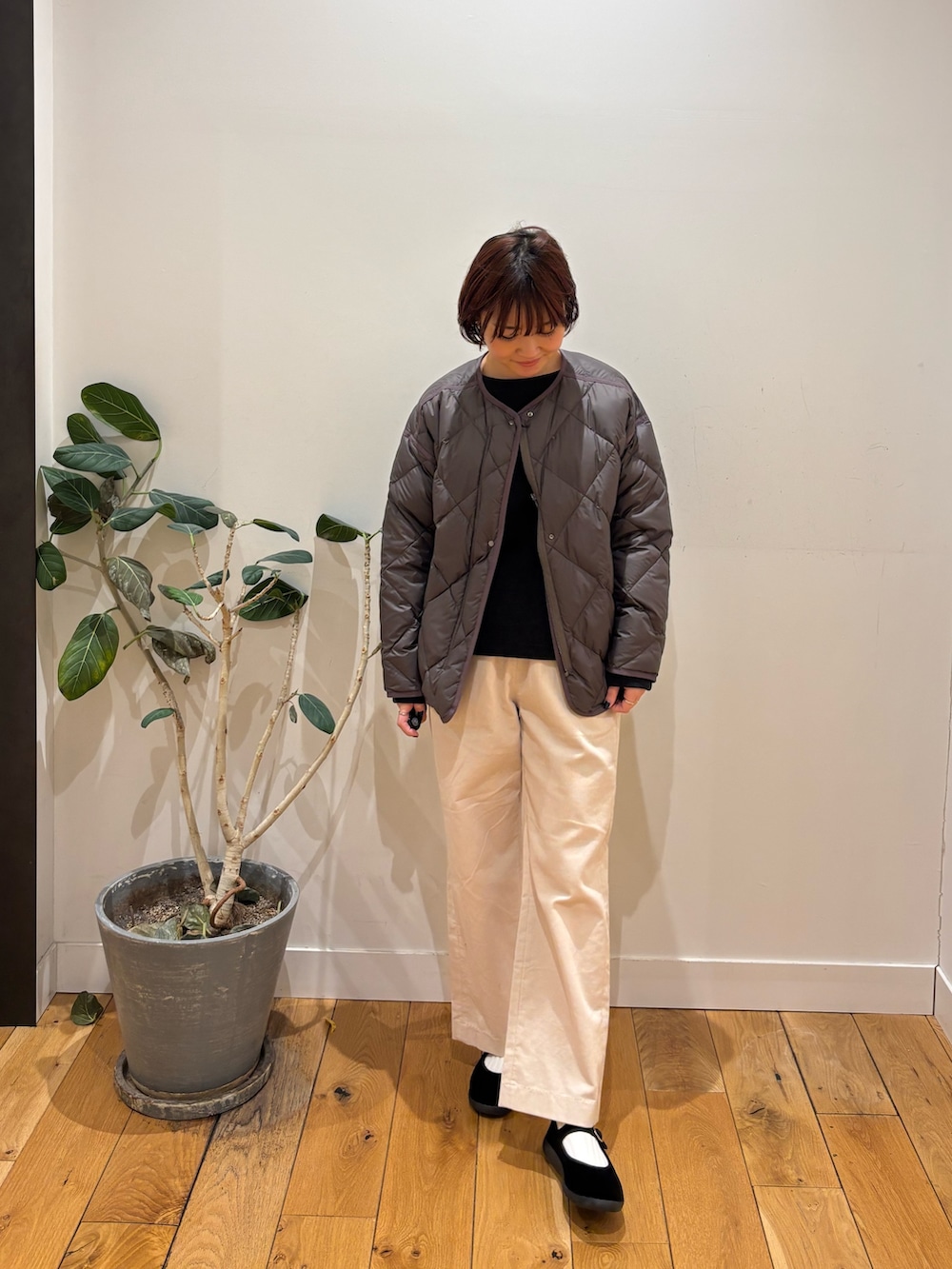 キルティングアウターはとても軽くてあたたかいので今時期から春先まで長く使えるアイテムになっています!お色味もブラウンの落ち着いた色合いなのでデニムや白、ベージュなどベーシックカラーとも相性がいいです◎