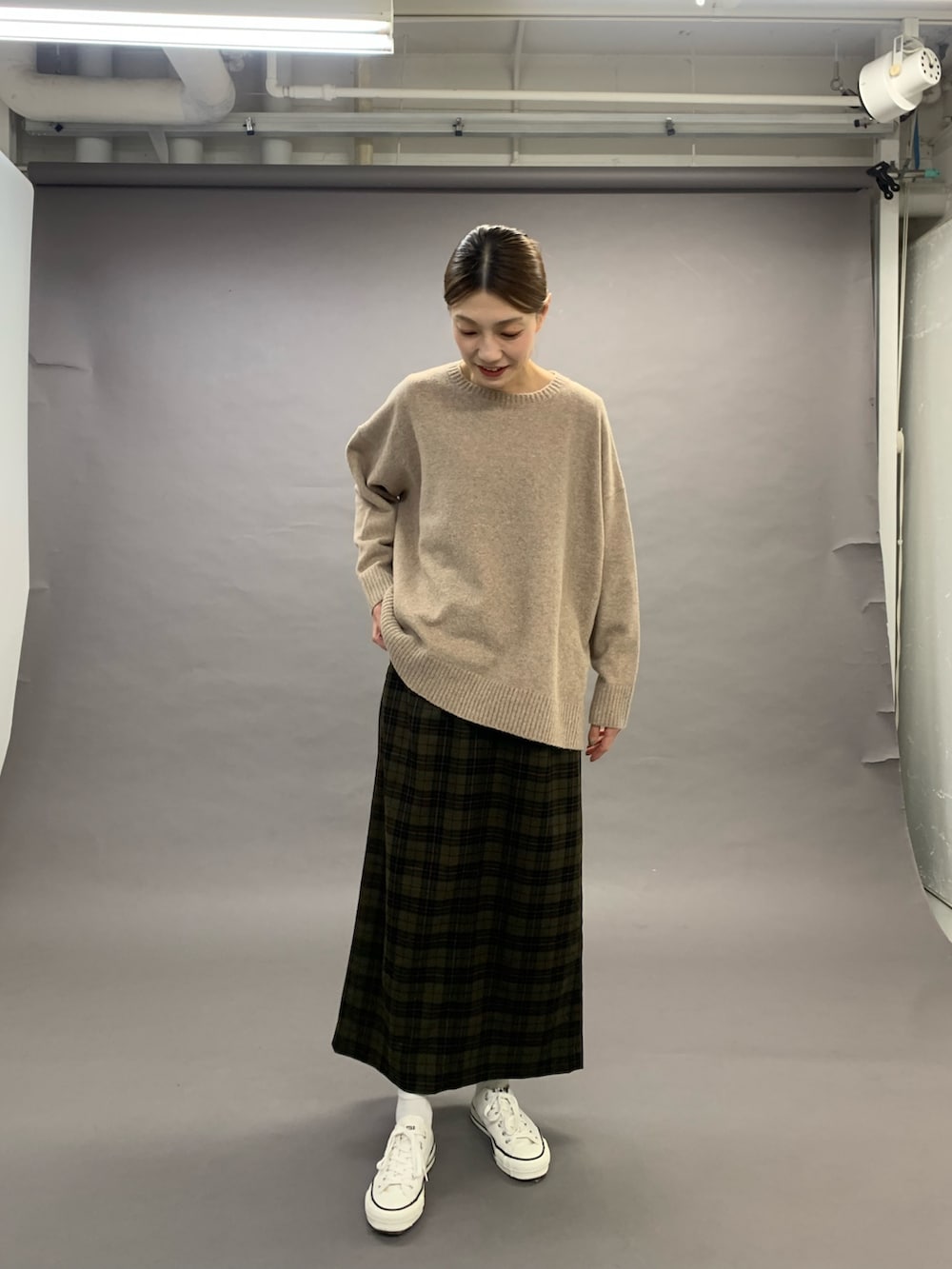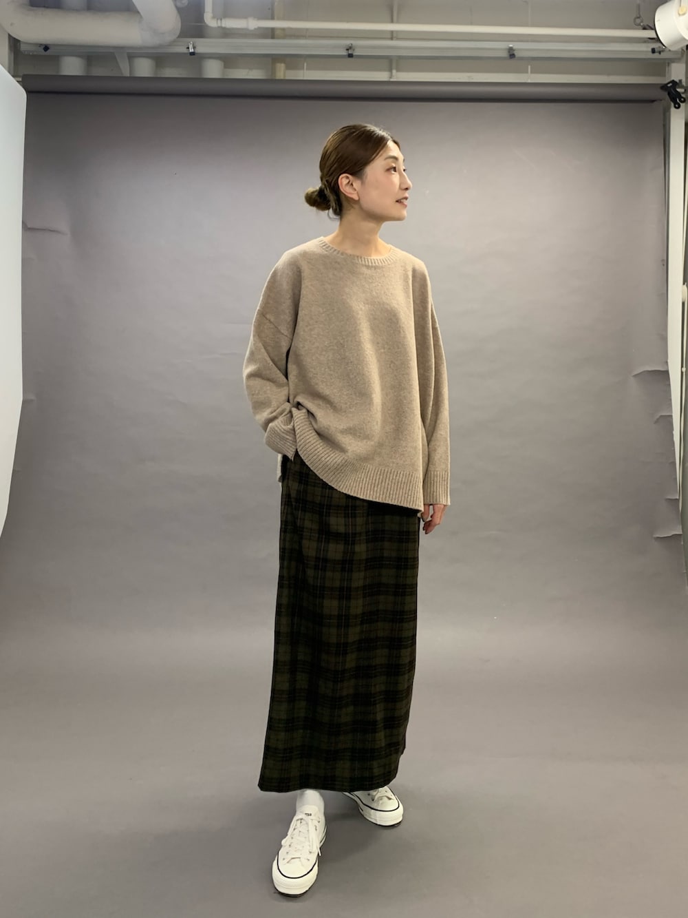 着丈の長いトップスも、広がらないスッキリしたラインであればスカートと合わせてもバランスがいいです◎