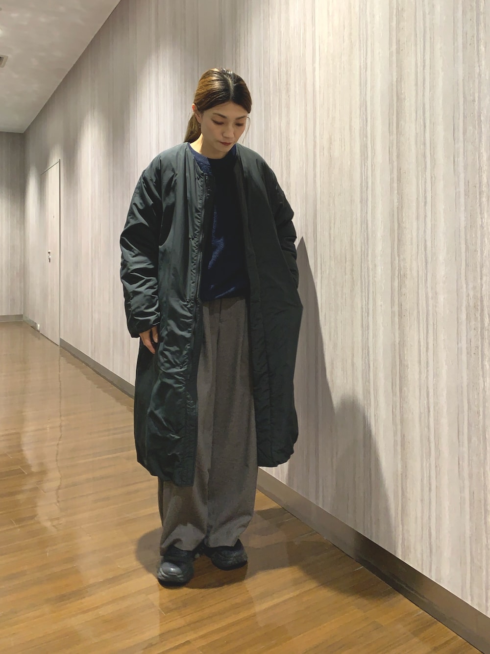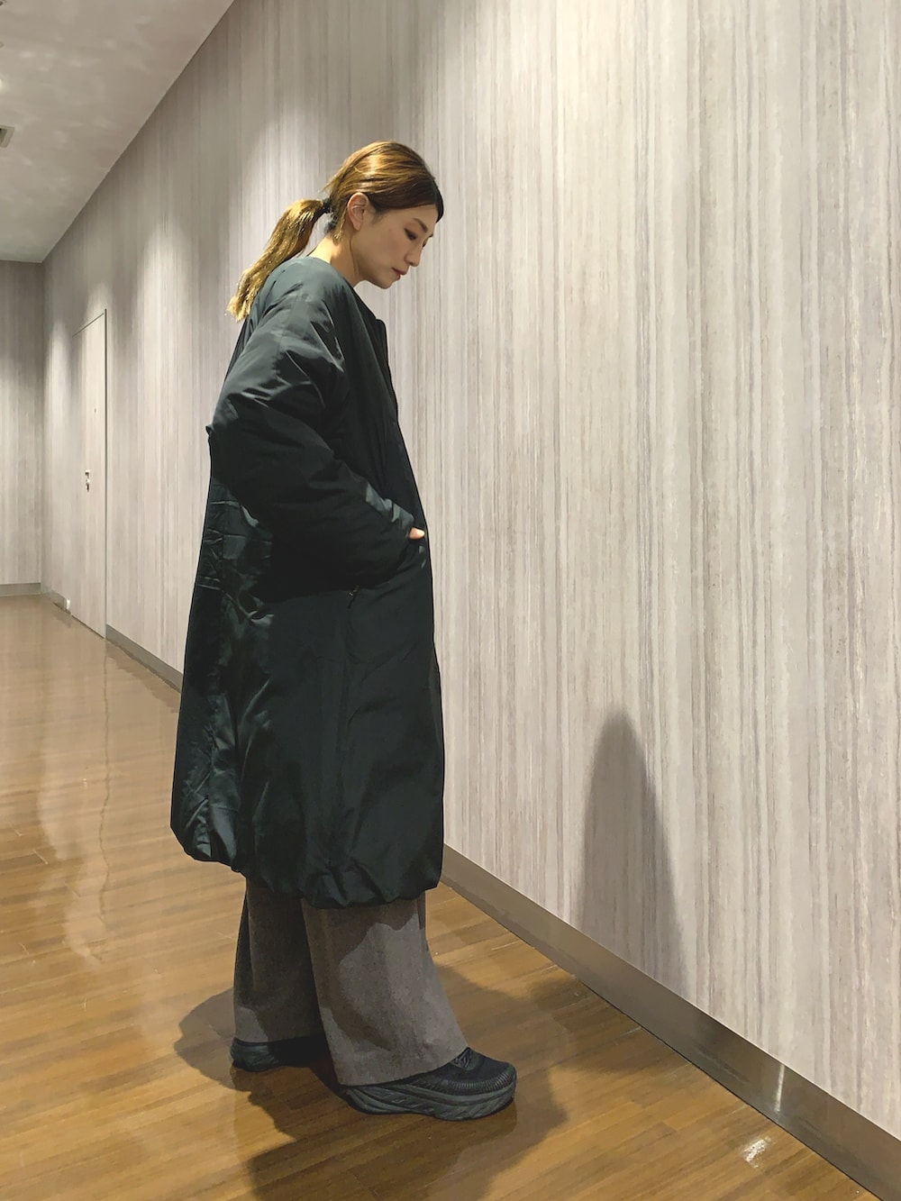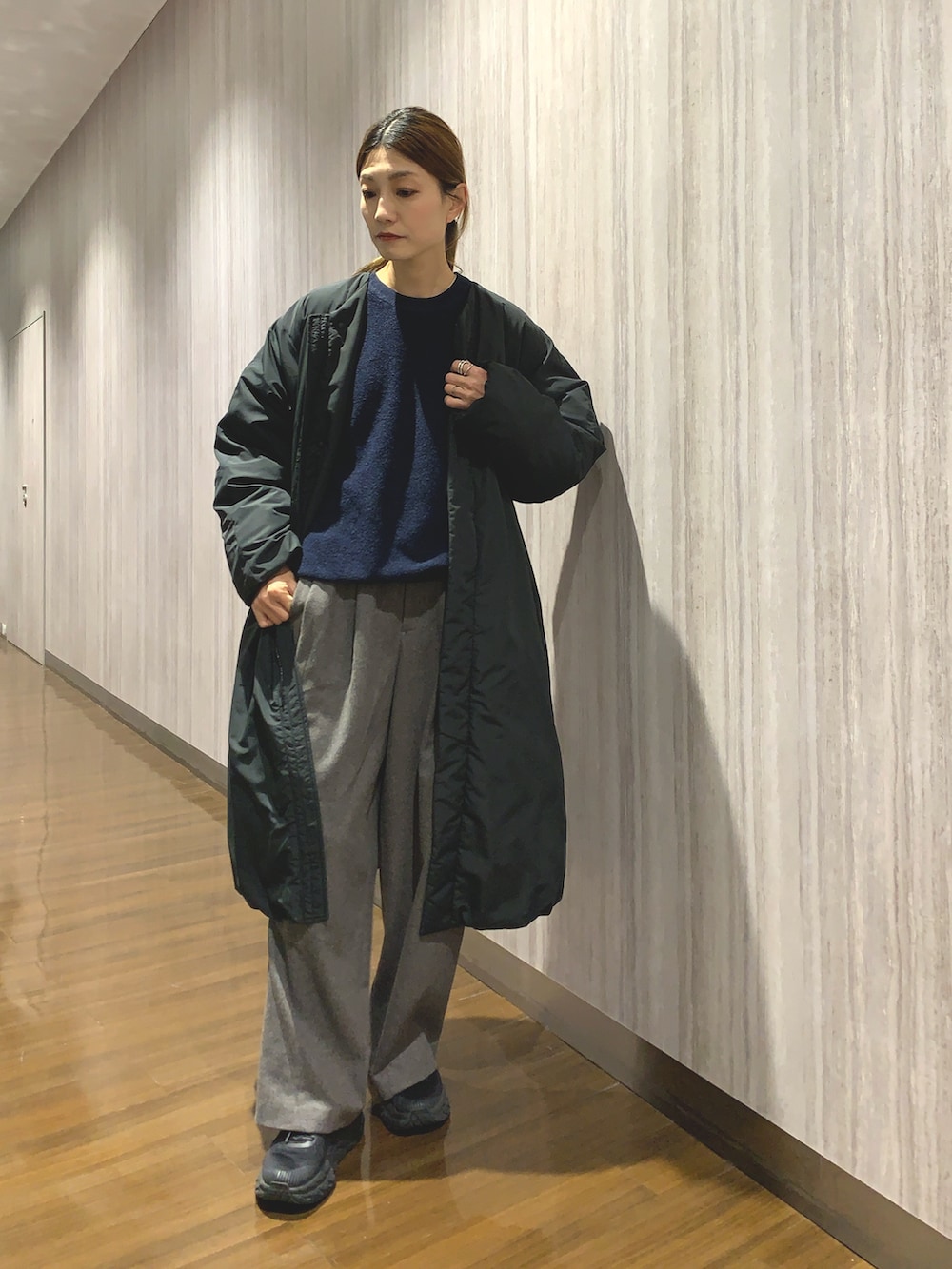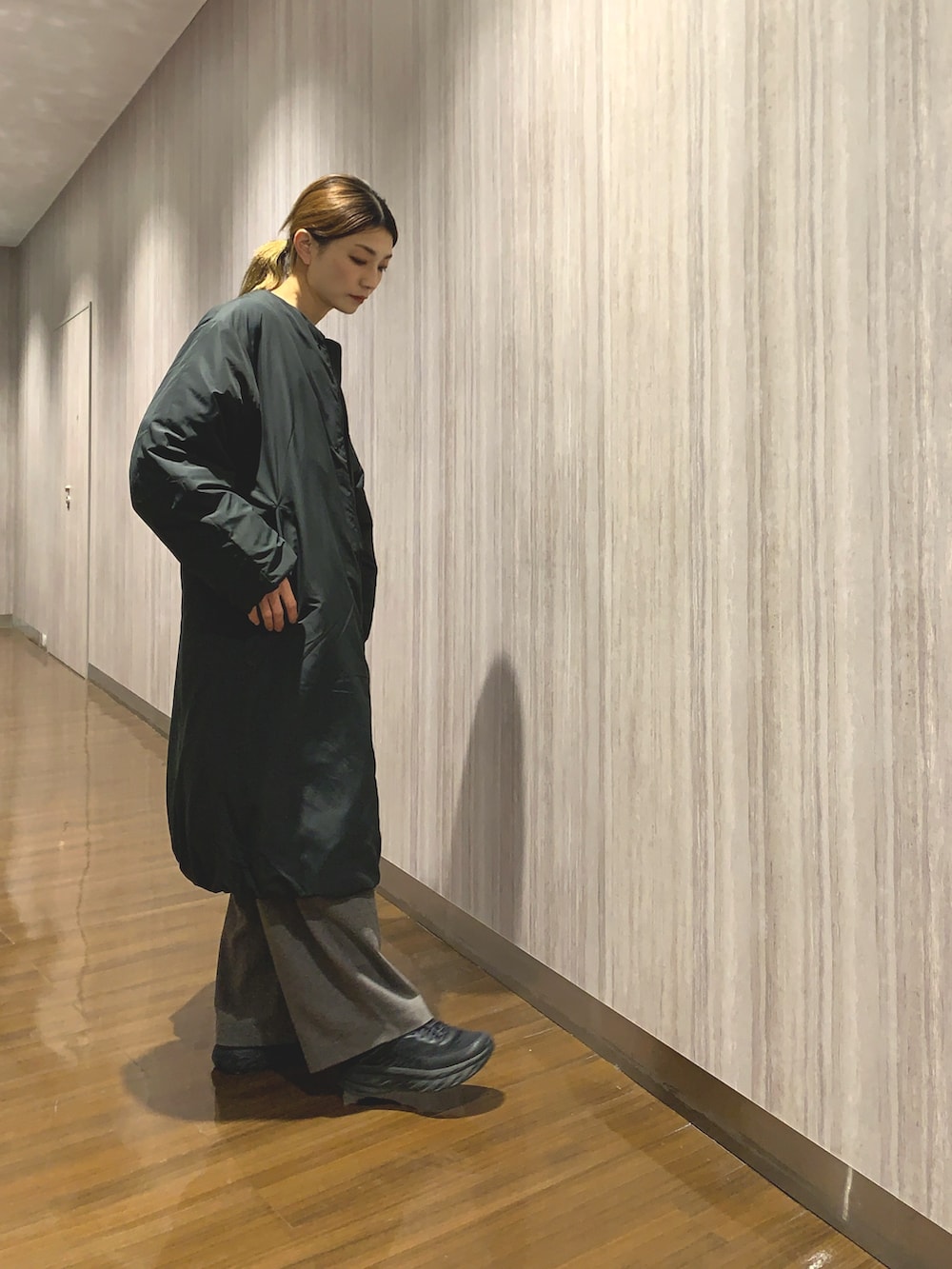 アウターは、程よくボリュームはありながらノーカラーのスッキリしたシルエット。