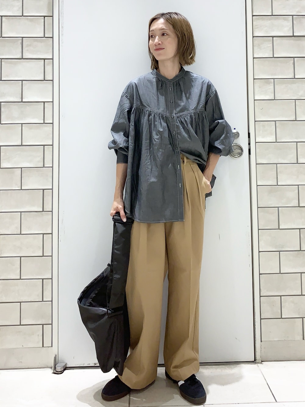 タンガリーシャツのブラックにのったステッチがとても可愛いらしく、ナチュラルな雰囲気で着用できます!チノパンと合わすことで、柔らかさを残しつつ全体をメンズライクにまとめてみました。