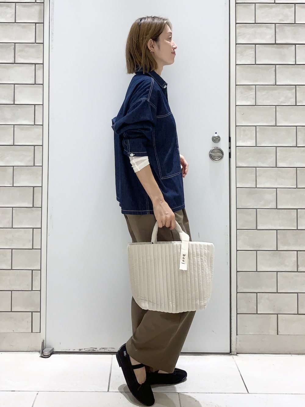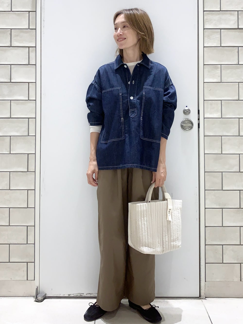プルオーバー型のデニムトップスがとても新鮮です!生地の厚さも程よく、インナーはタンクトップからタートルネックまで、季節によって取り入れ可能です😊