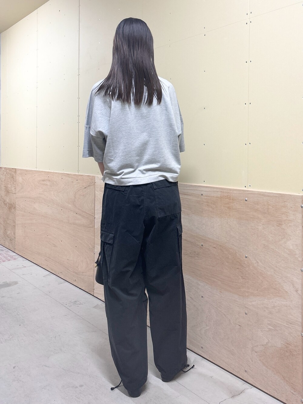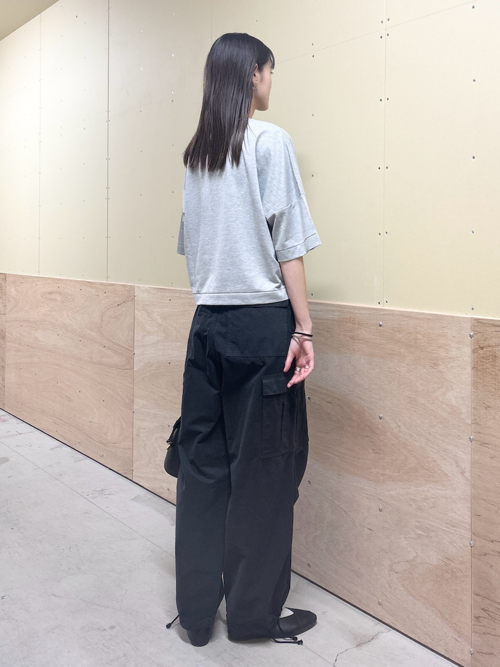 綿ポリのサラッとしたシワになりにくい生地感の5分袖くらいのTシャツになります!