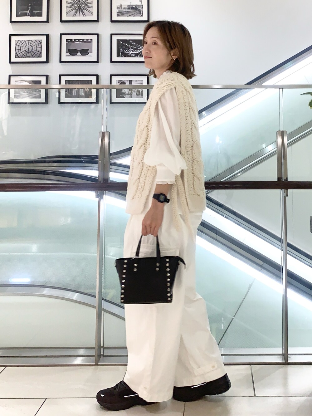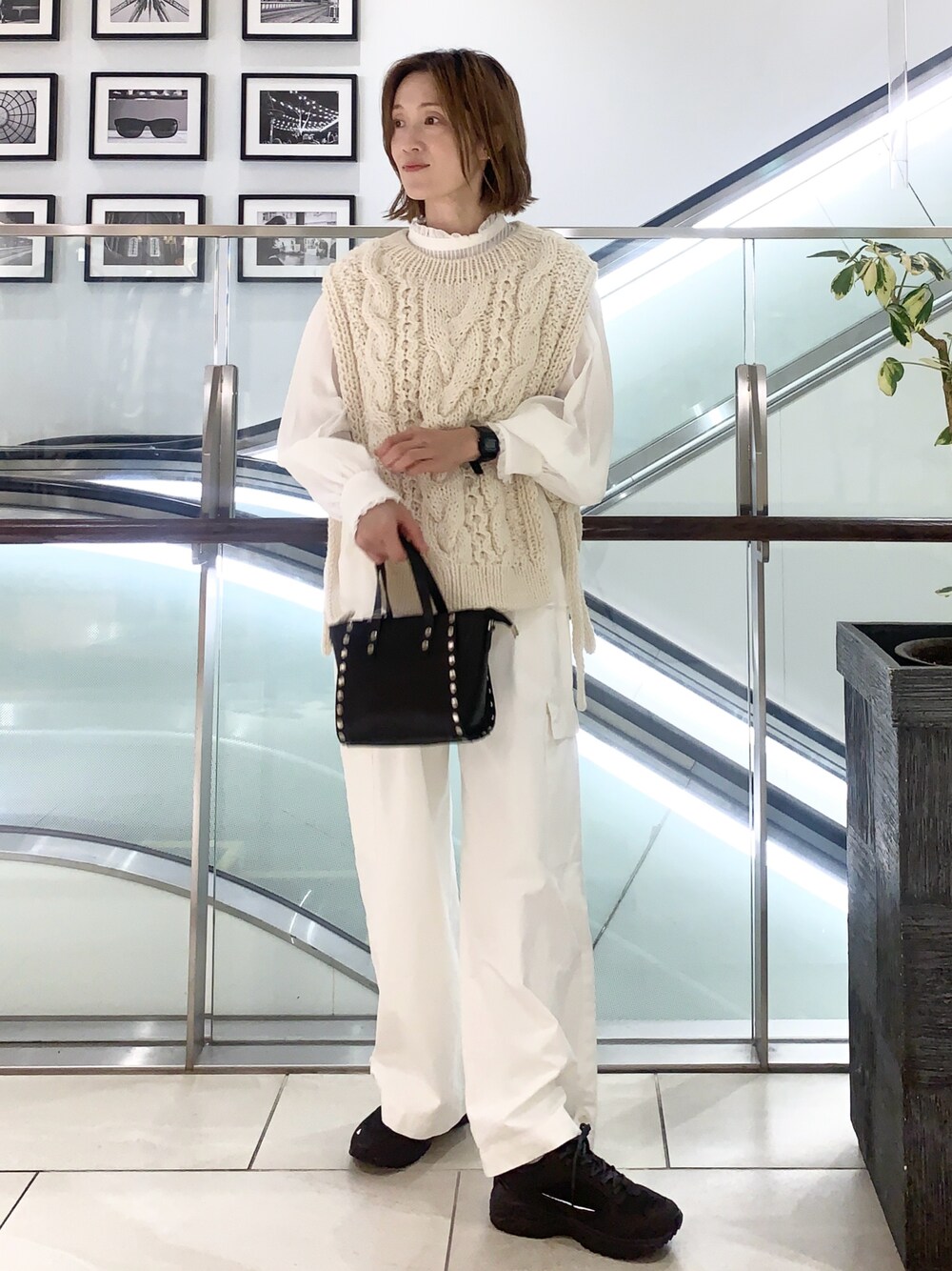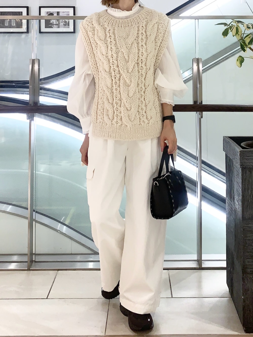 冬のオールホワイトコーデの主役、アラン編みはしっかり冬の装いに…ベストはインナーで雰囲気を変えられるので欠かせないアイテムです。
