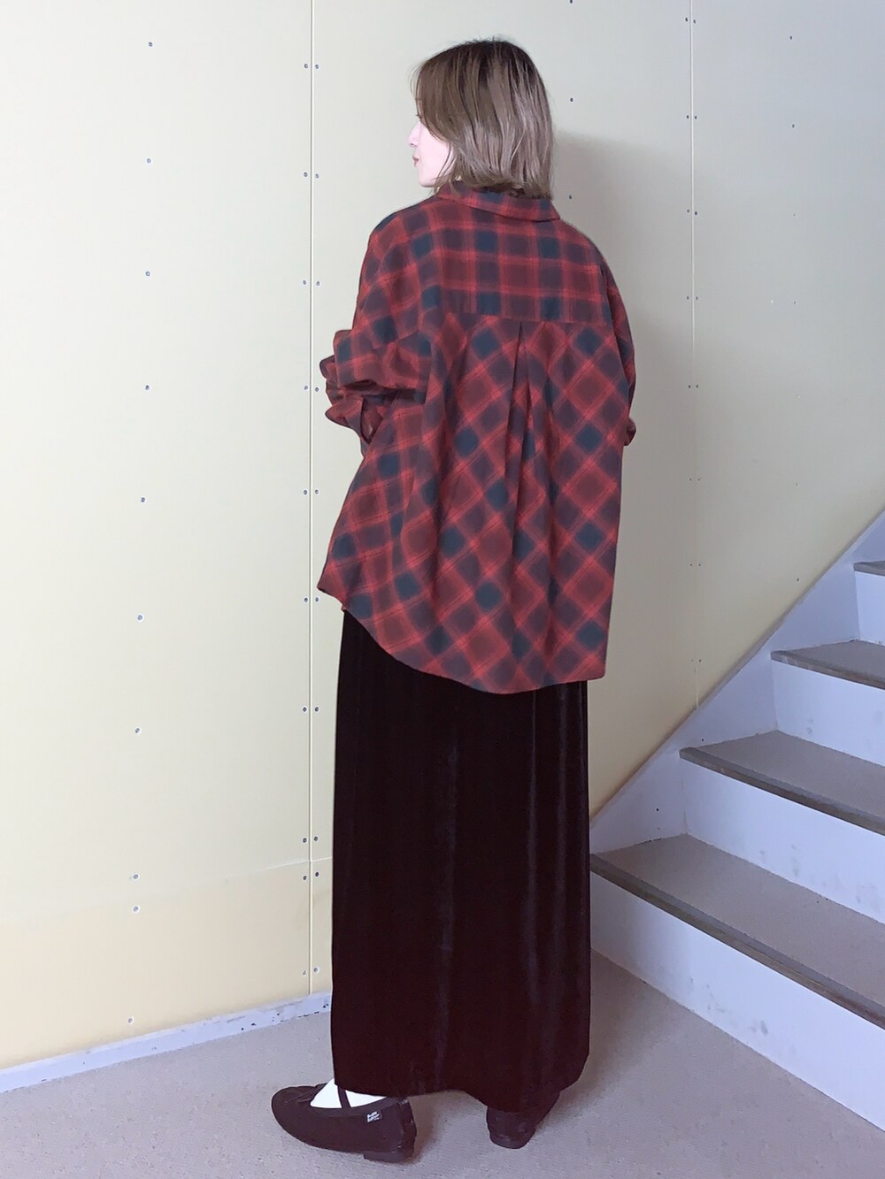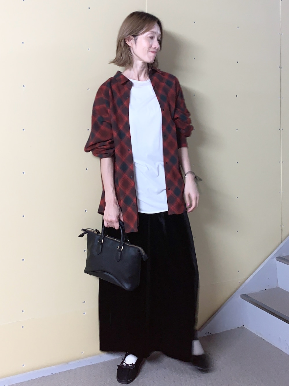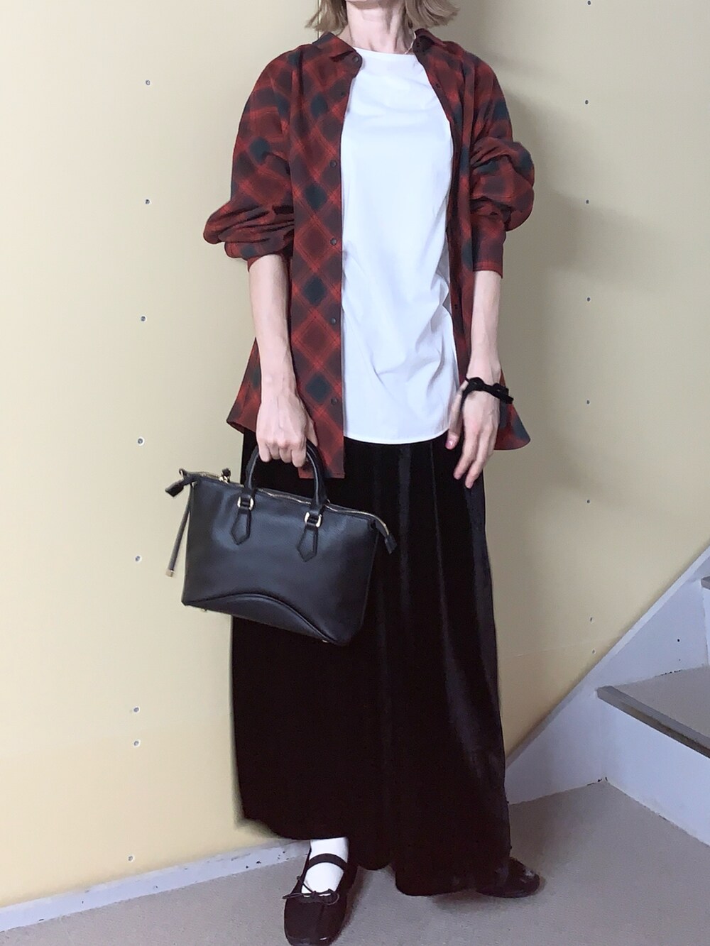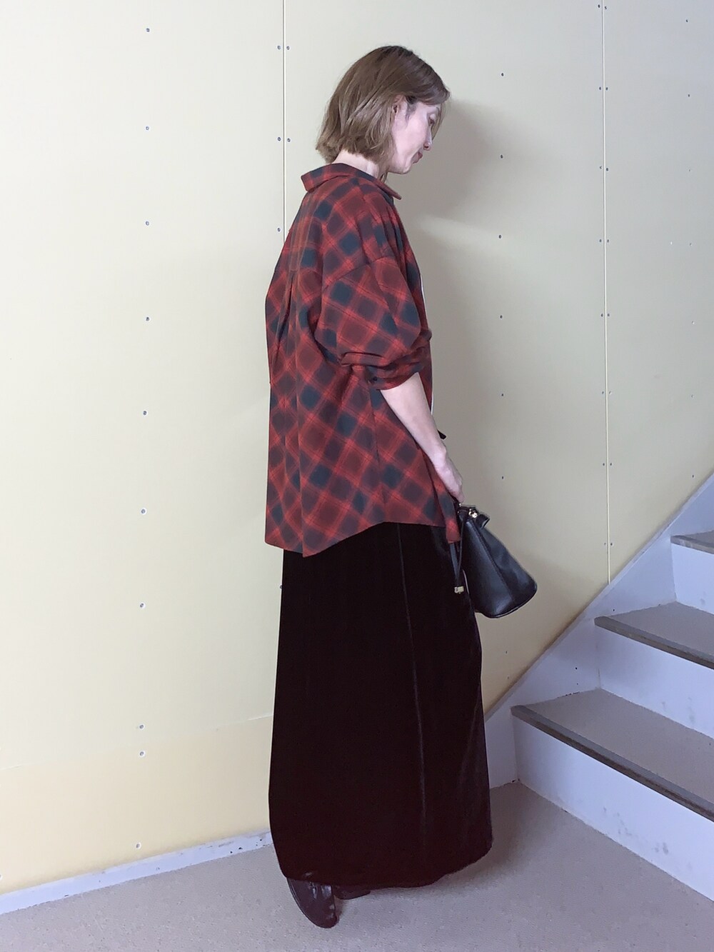 秋冬のベルベットは大好きなアイテムの1つです、チェックシャツのようなカジュアルアイテムに合わすことでおしゃれ見えします。