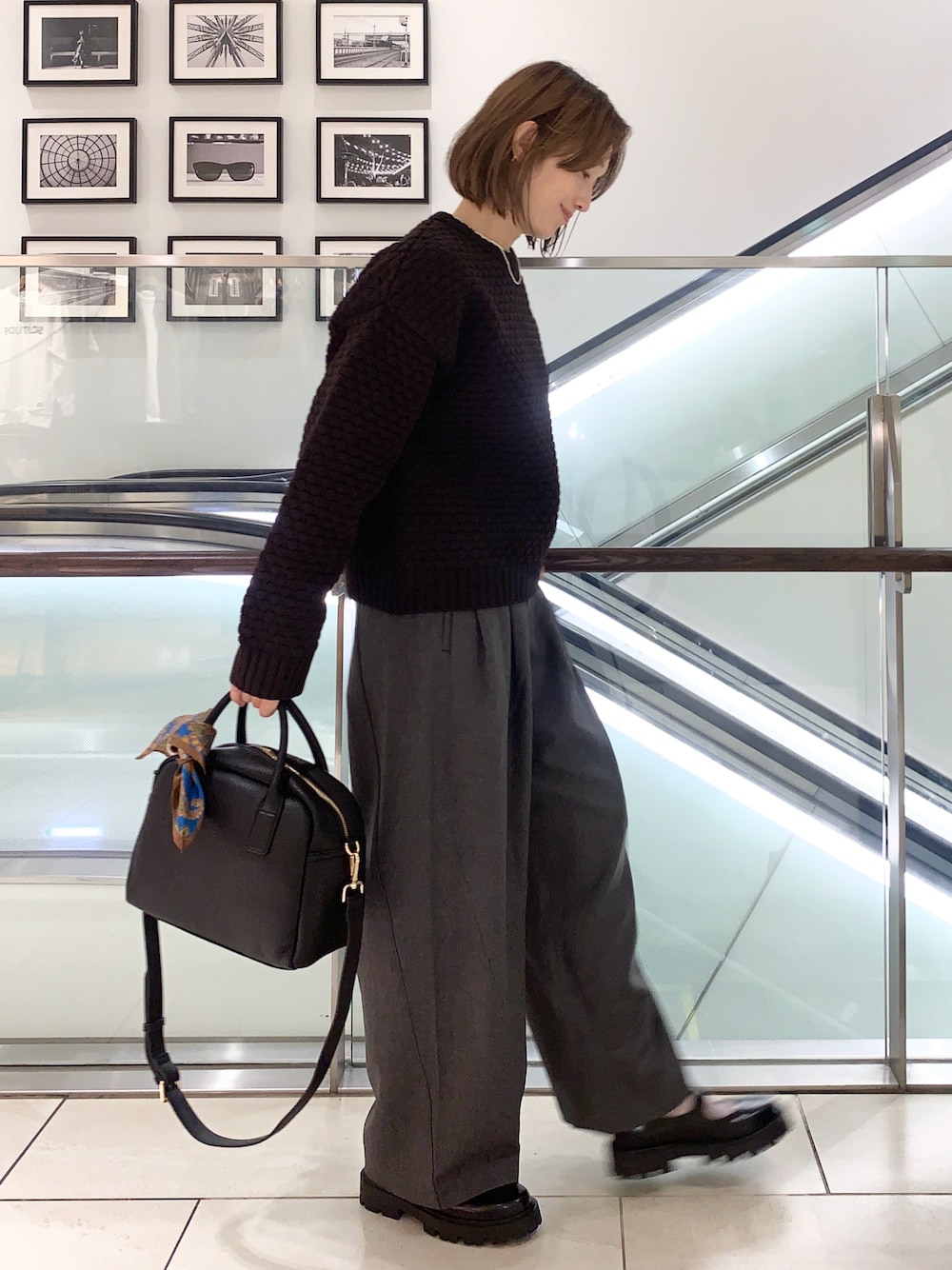 ポップコーンのような凹凸が可愛くオシャレ見えします。旬のブラウンをきれいめカジュアルで着たいです😊またレイヤードで少し白を取り入れるのがポイントです✨