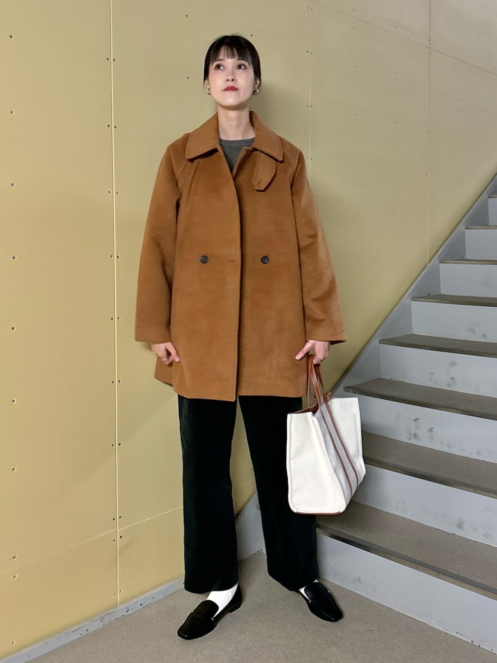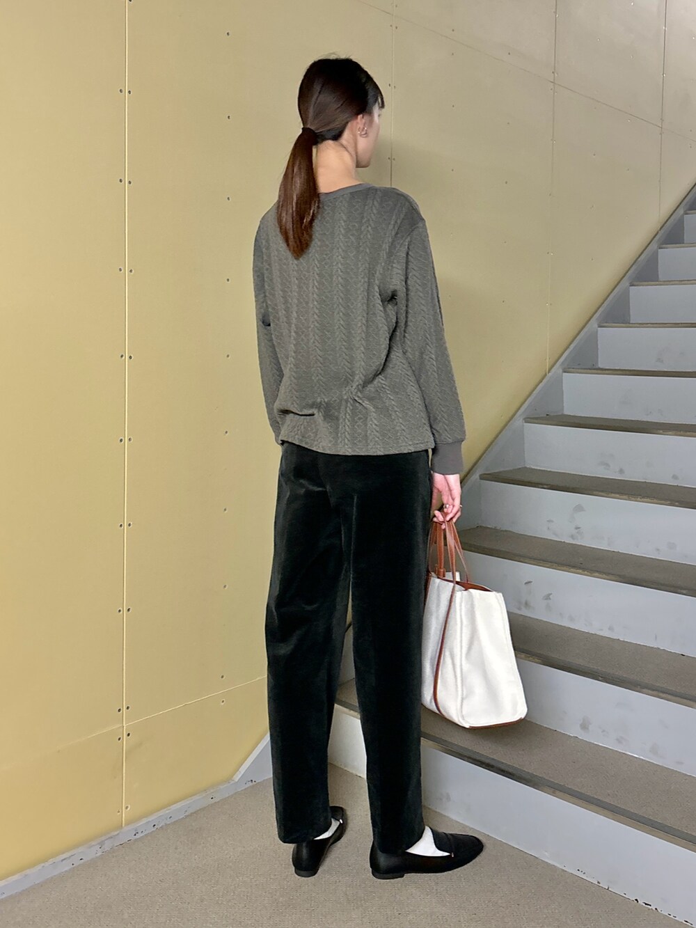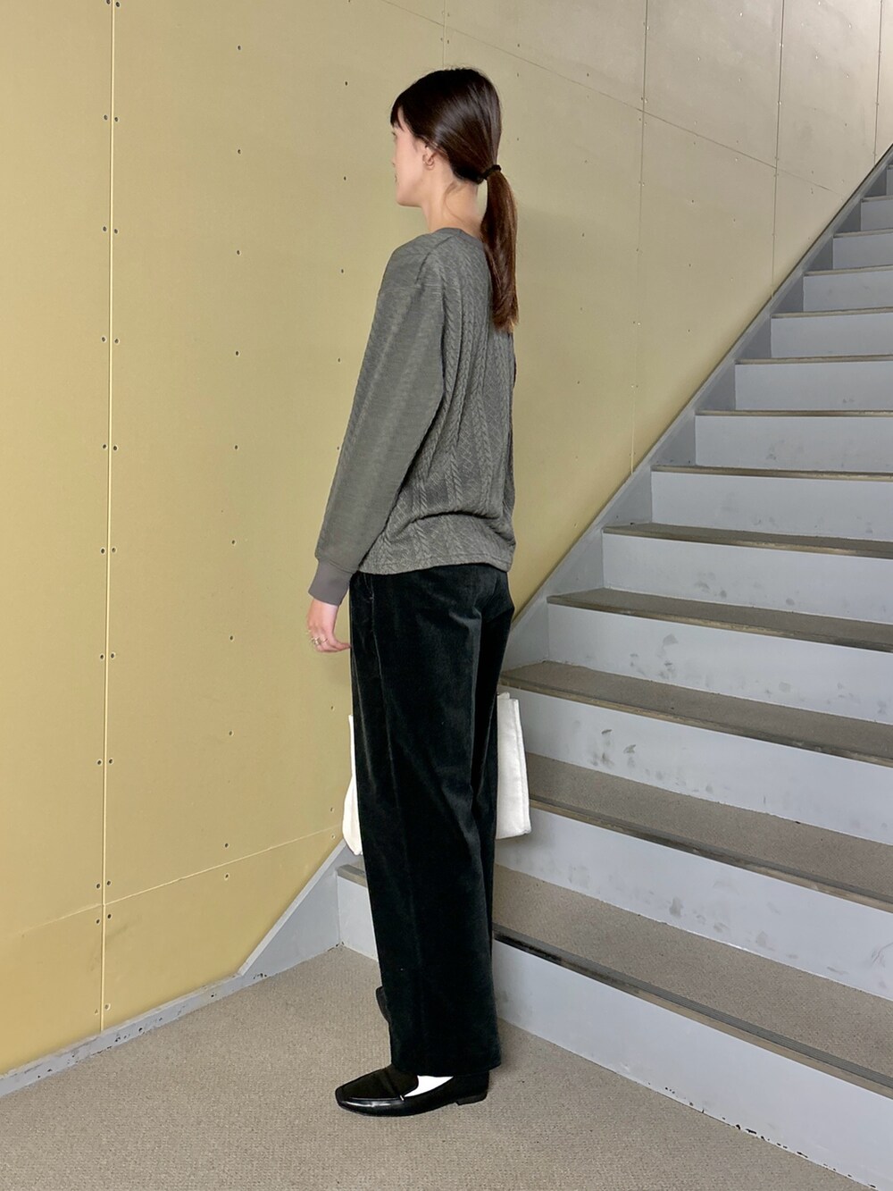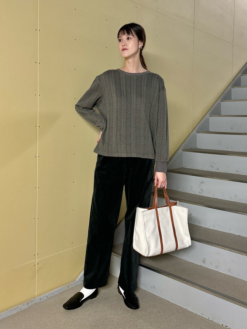 ボトムとインナーをグレーで統一し、アウターが主役のコーデです✨