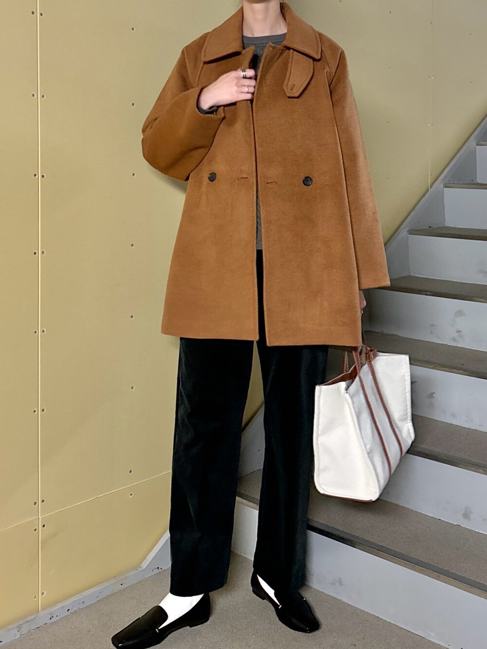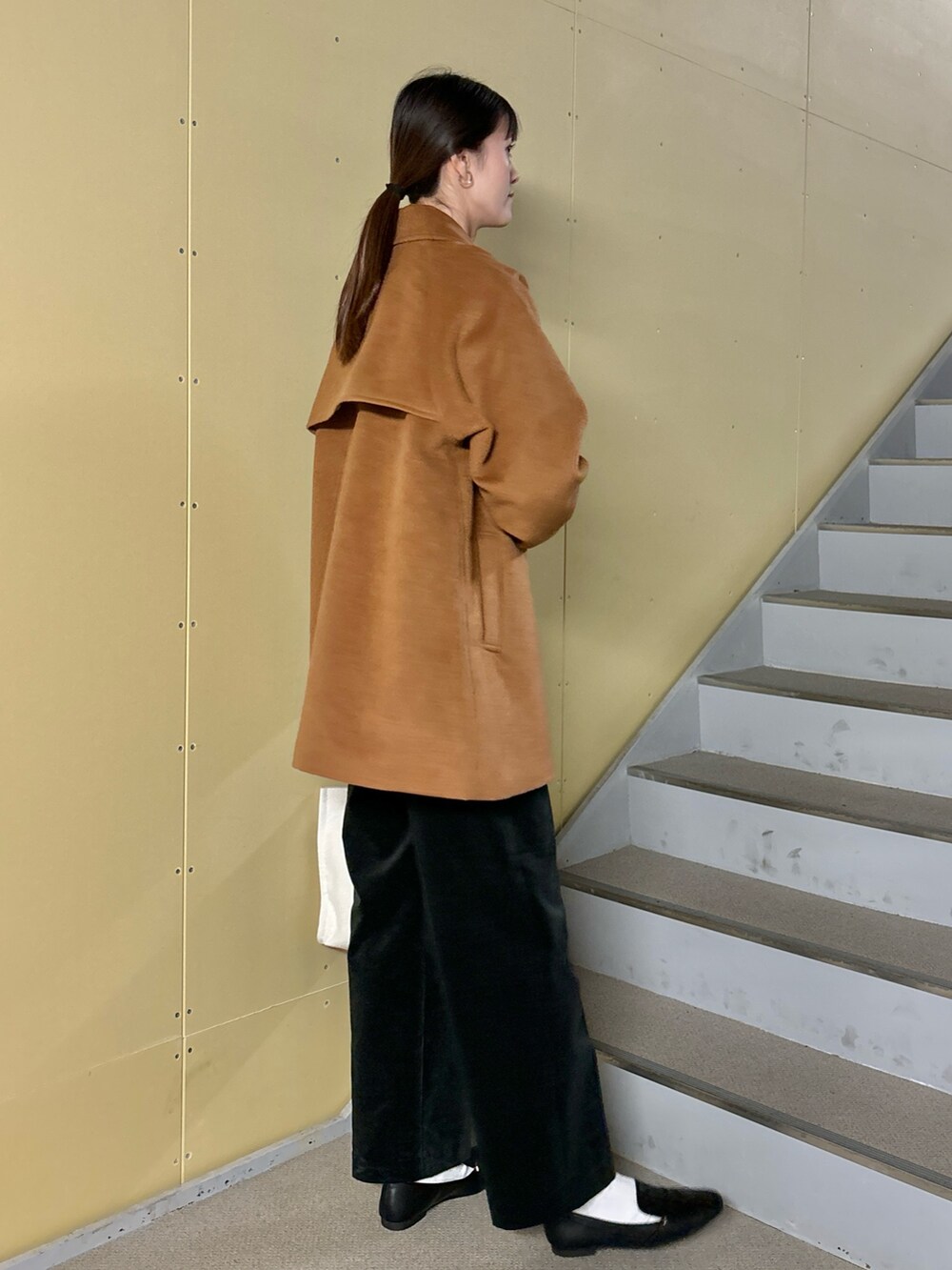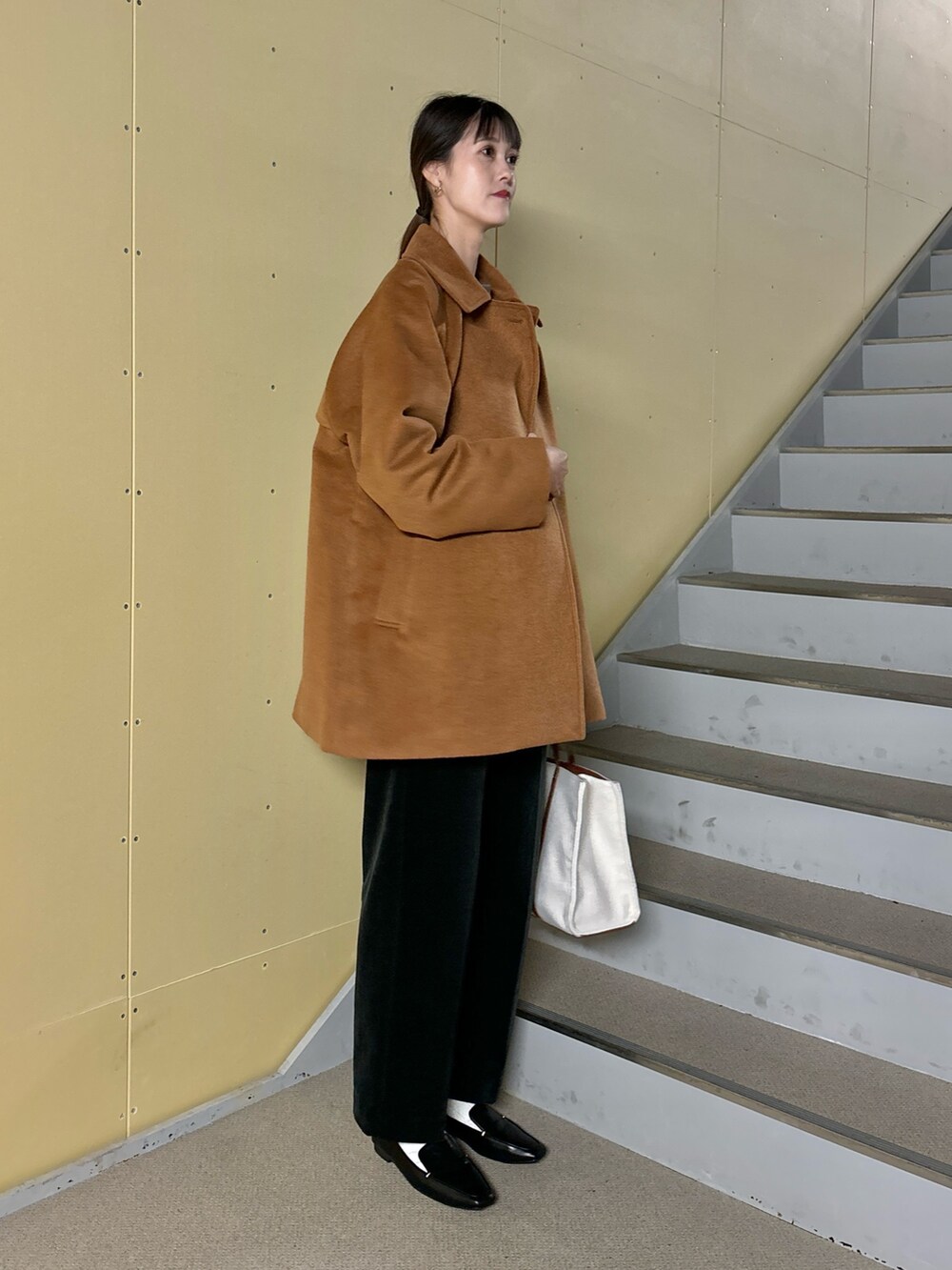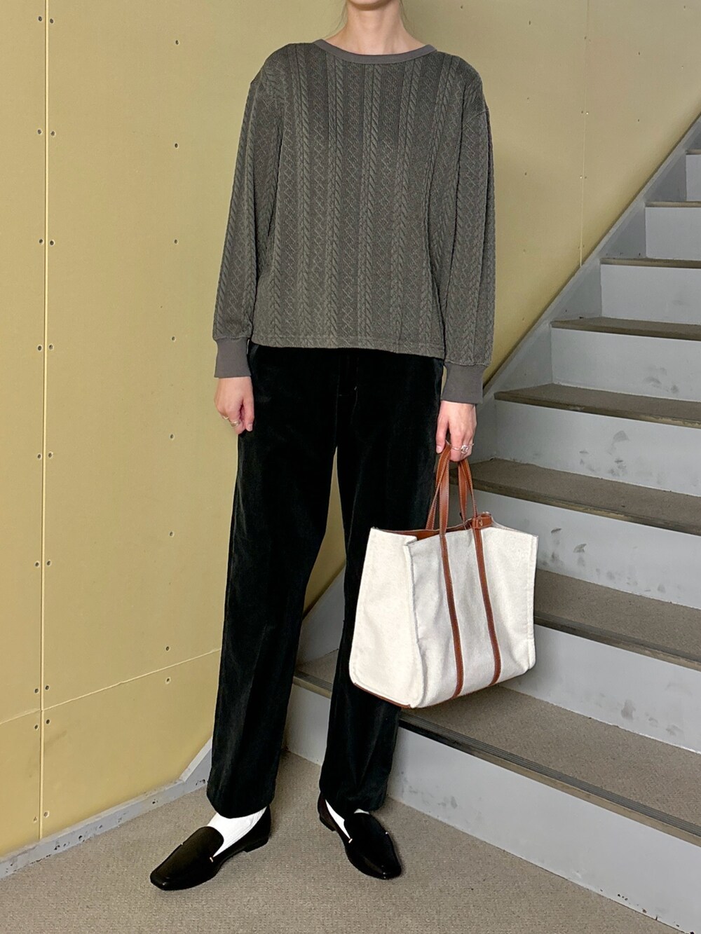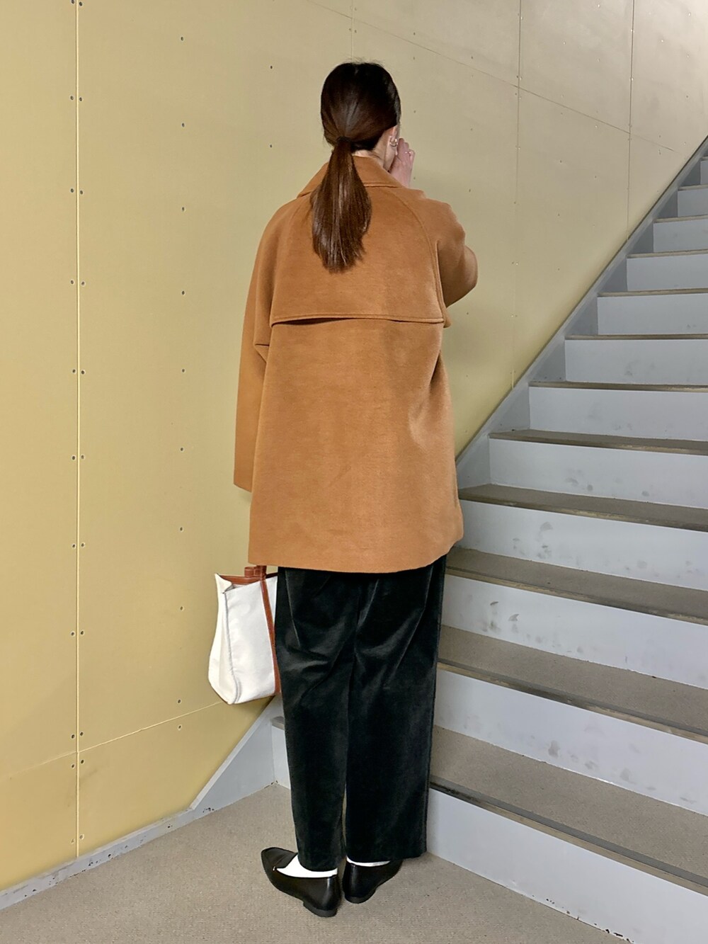 ボトムとインナーをグレーで統一し、アウターが主役のコーデです✨