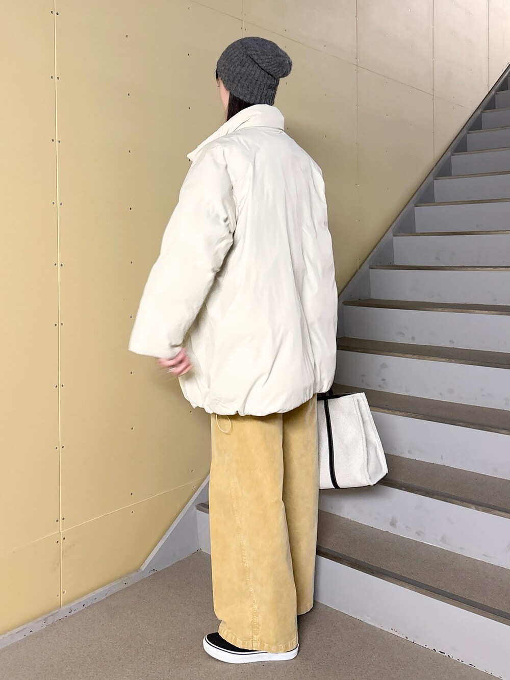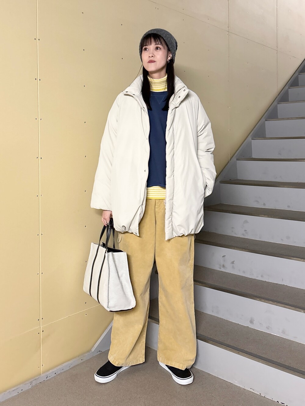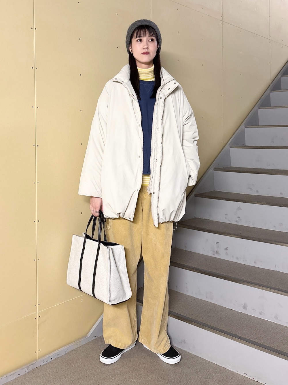 デザインはスタンドカラーのミドル丈を採用し、裾にスピンドルを通しているので絞るとシルエットを変えていただけます。