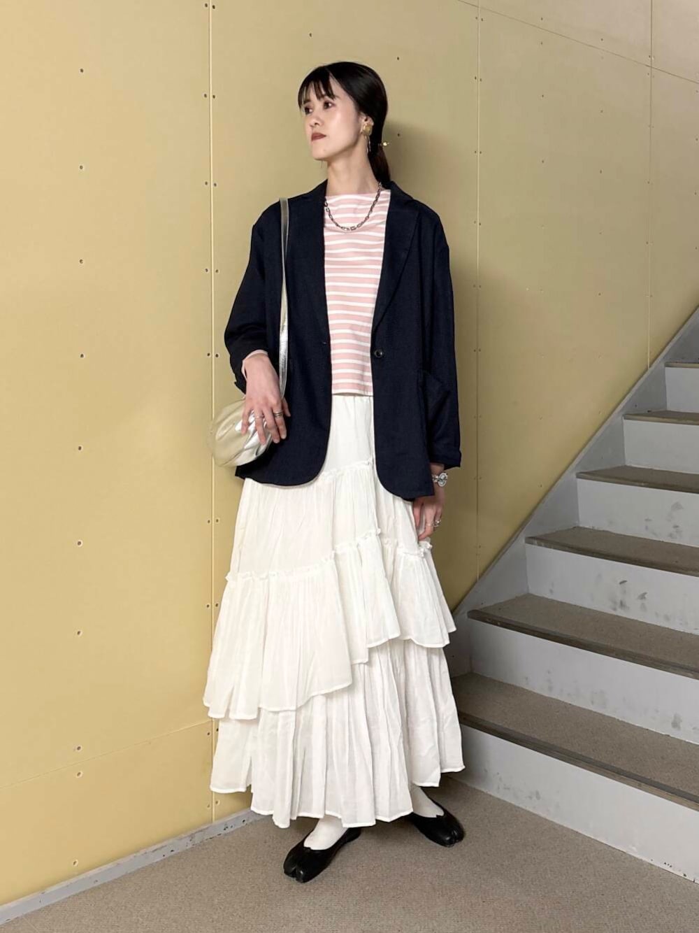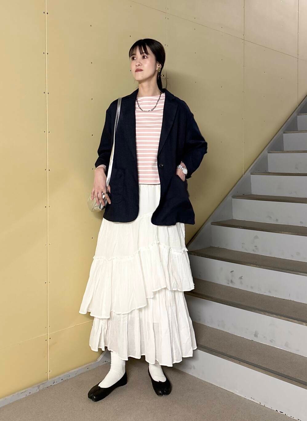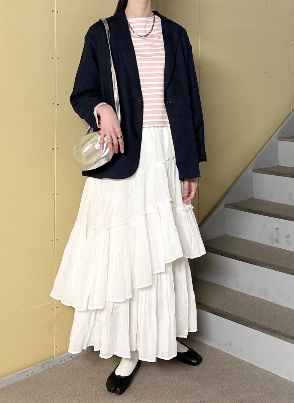 ピンクのボーダーで春らしい印象にしてスカートで甘く、ジャケットで締めてみました✨
