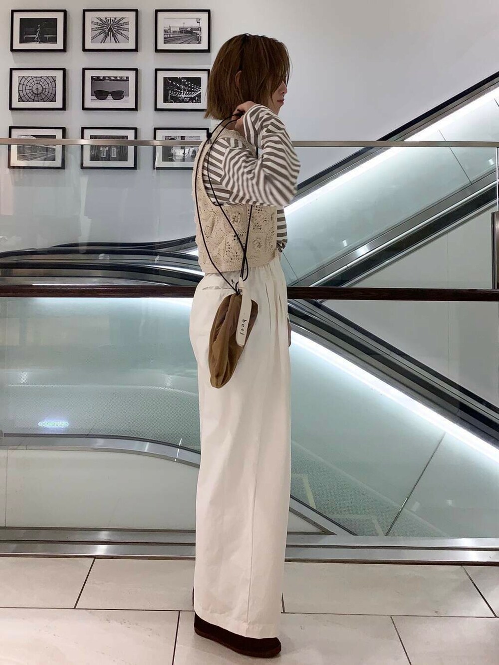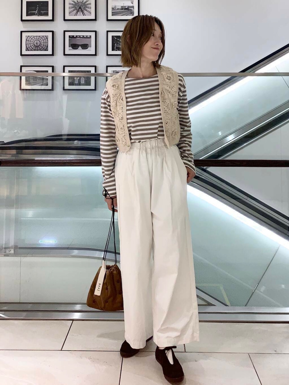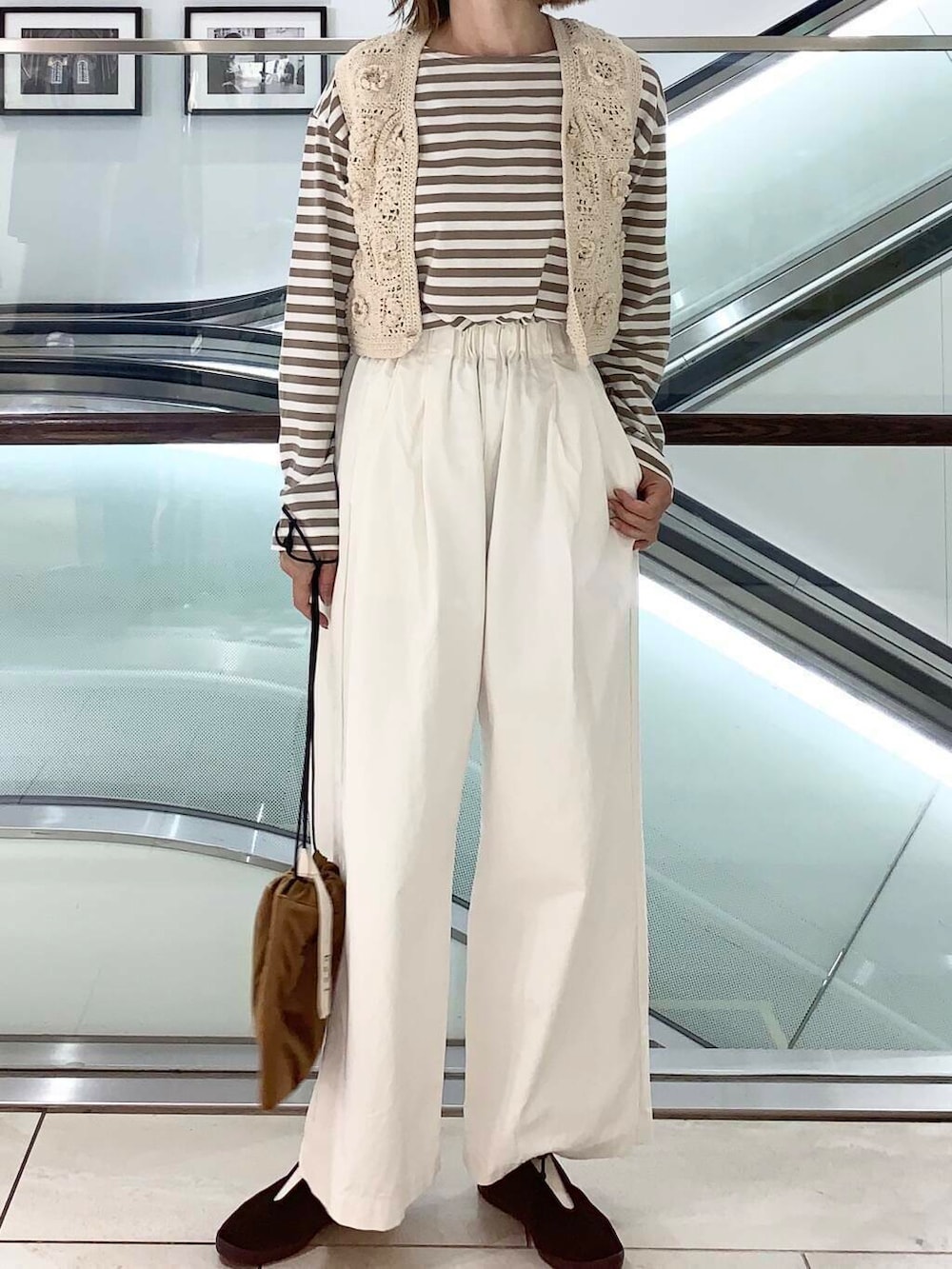 タックがしっかり入り、立体的に見えるワイドパンツです。まだまだ暑さ続くこの時期に薄手のカットソーをinにしても綺麗に決まります✨今年はクロップド丈のトップスが多めなので、スタイリング的にもより使いやすいと思います😊