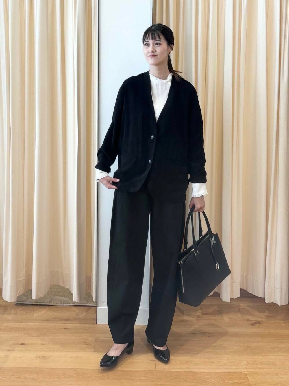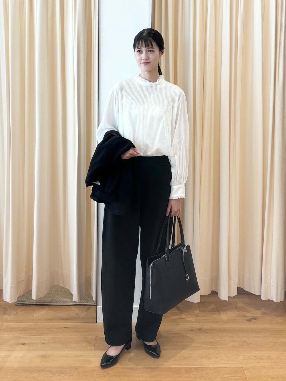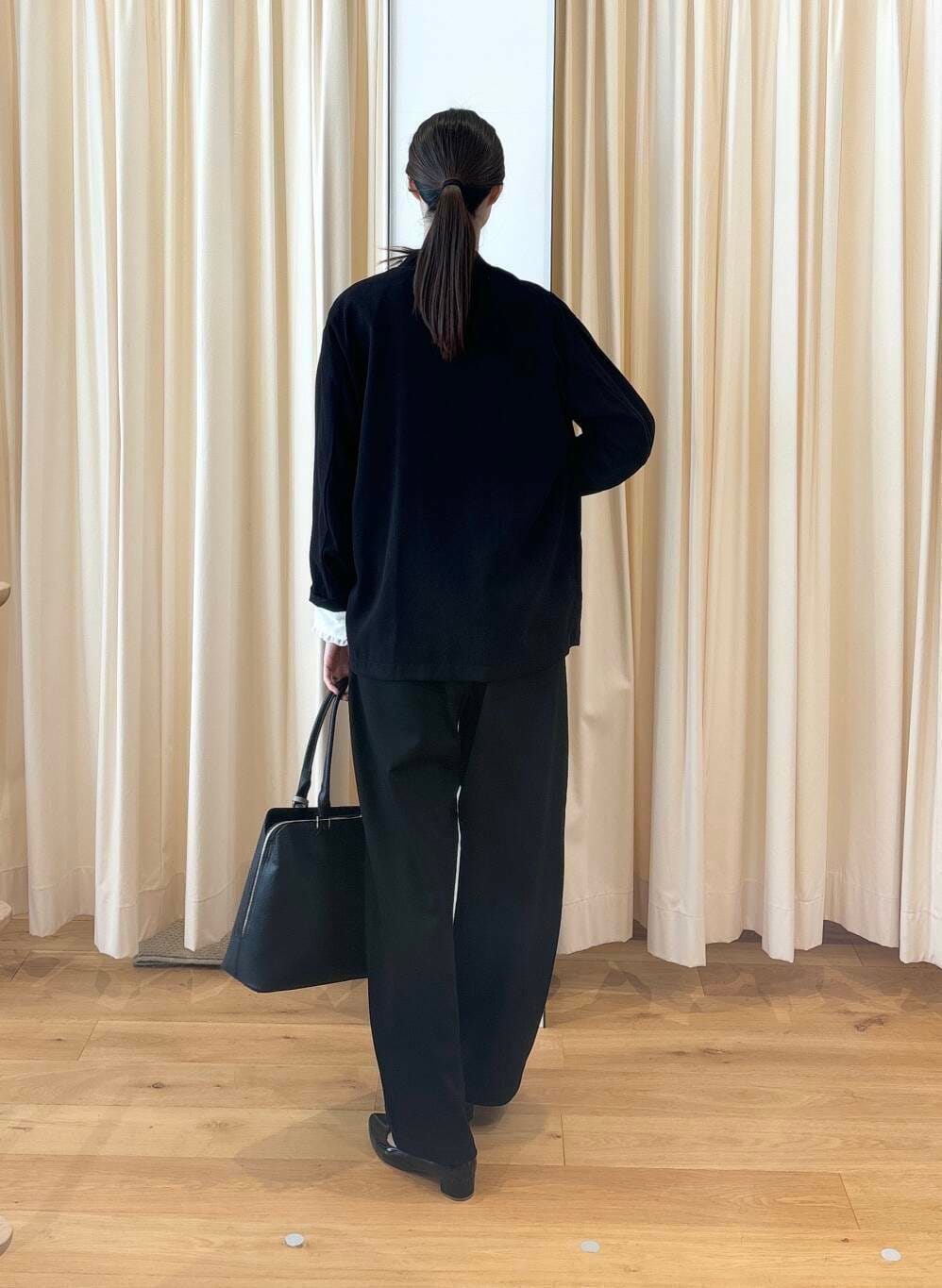 ブラウスは少し甘くなると思うので、ブラウス以外をブラックで合わせて統一感を出してスッキリ落ち着いた印象にしてみました。