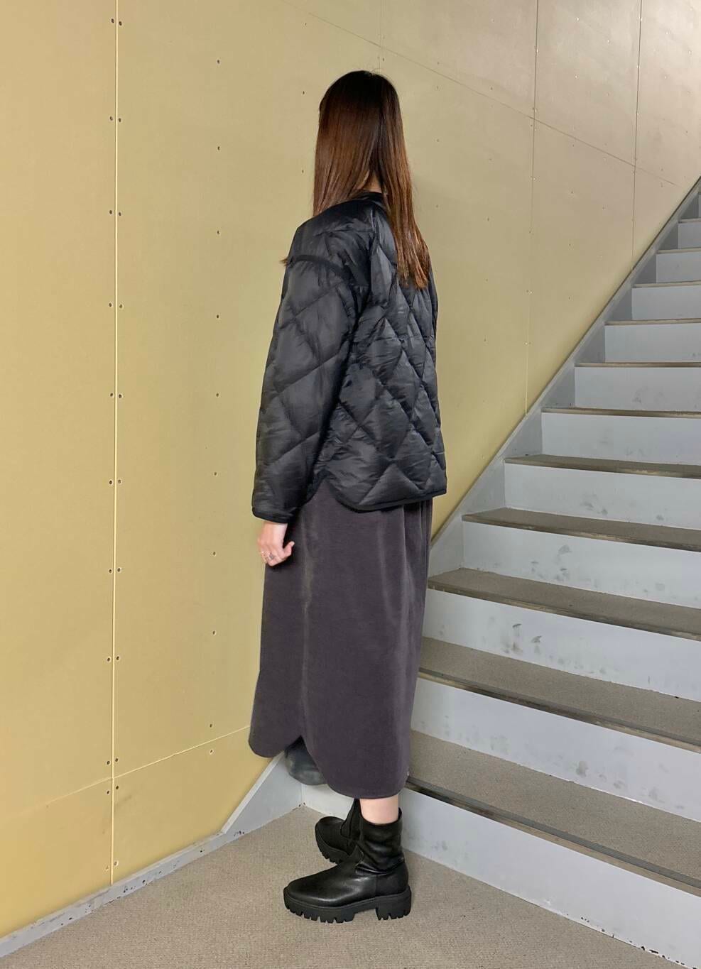 襟がない分タートルとの組み合わせやサイドスリットがしっかり入っているのでボトムスとのレイヤードも可能なので、幅広くスタイリングを楽しんでいただけます。