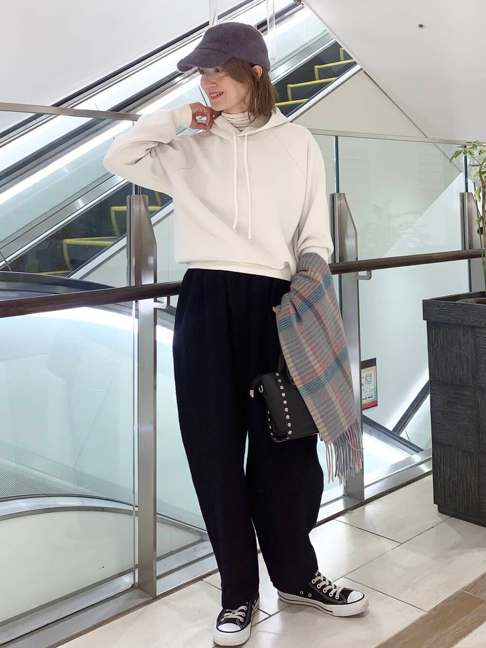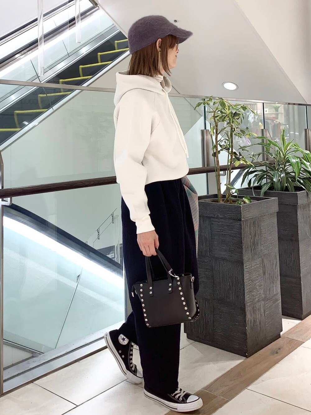 ツルッとした生地が心地よい、ニットパーカーです😊大人のパーカースタイルはお休みの日によく着ます。合わすボトムスは少し個性的なアイテムで、カジュアル過ぎずに着ると良いバランスです✨