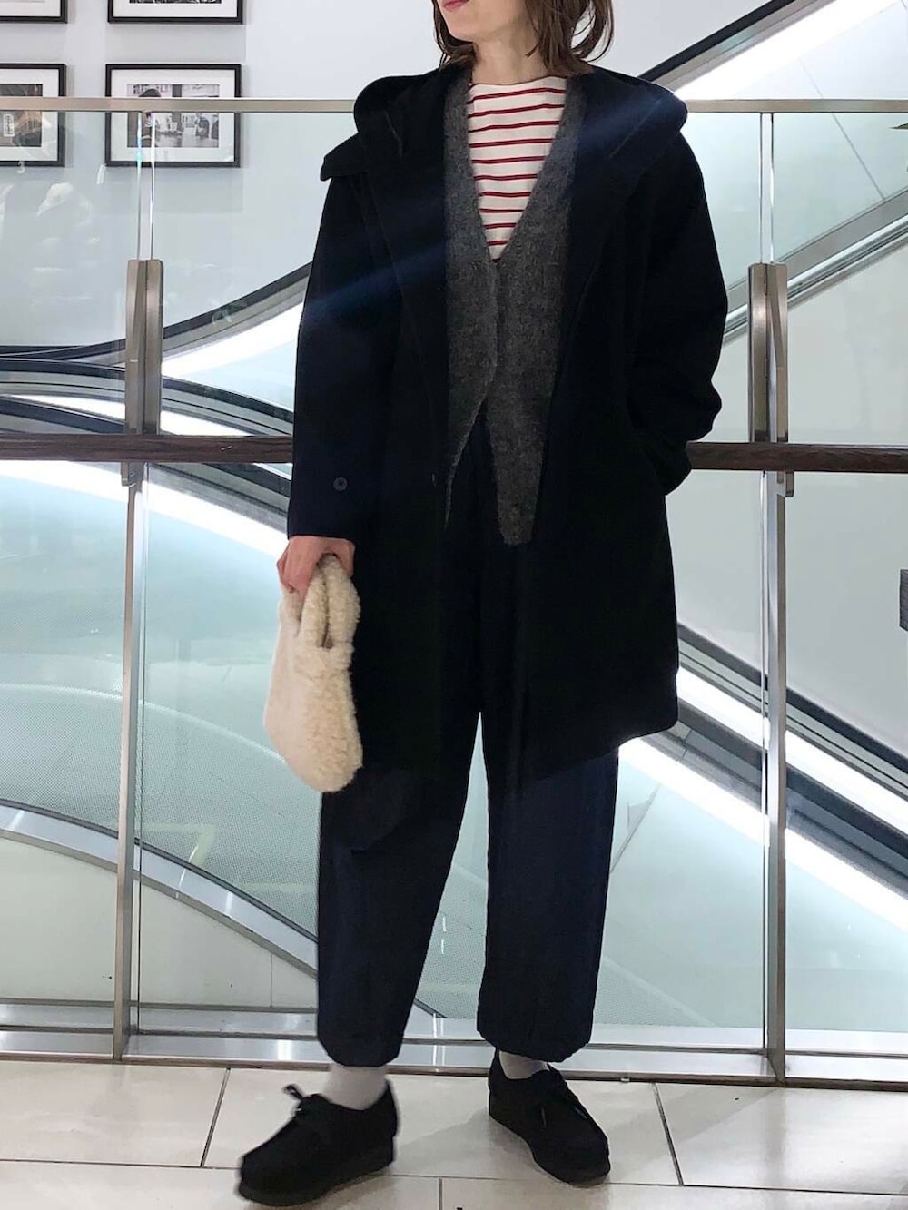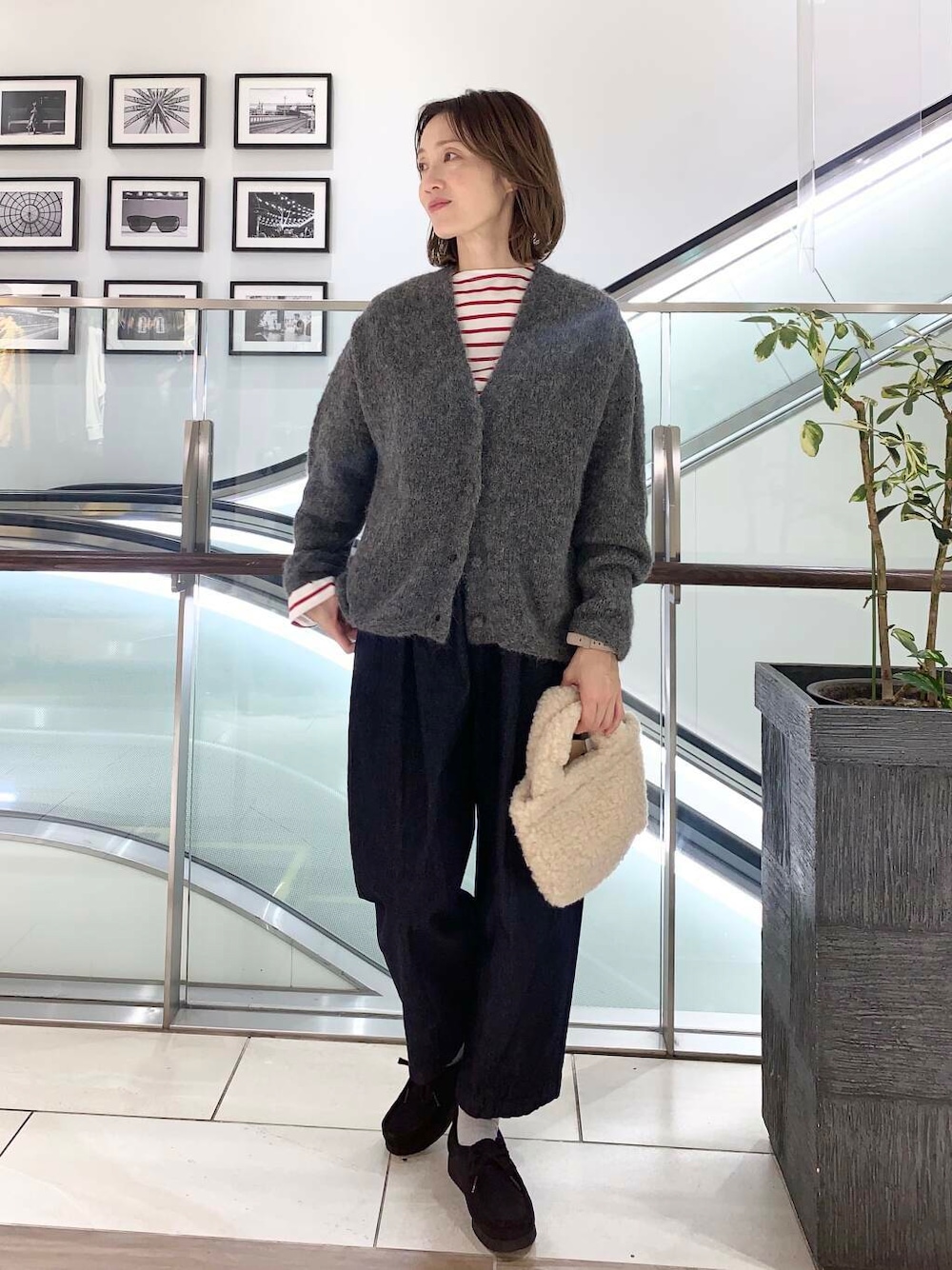 丈が短め、ワイドな幅、袖も同じくワイドで個性的なデザインです!冬からチラ見せで着こなし、春は1枚で思い切り楽しみたいです😊