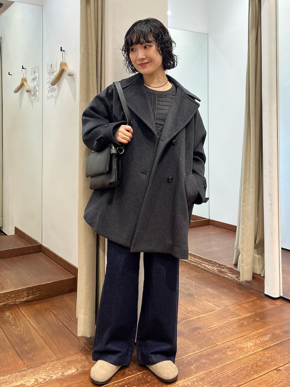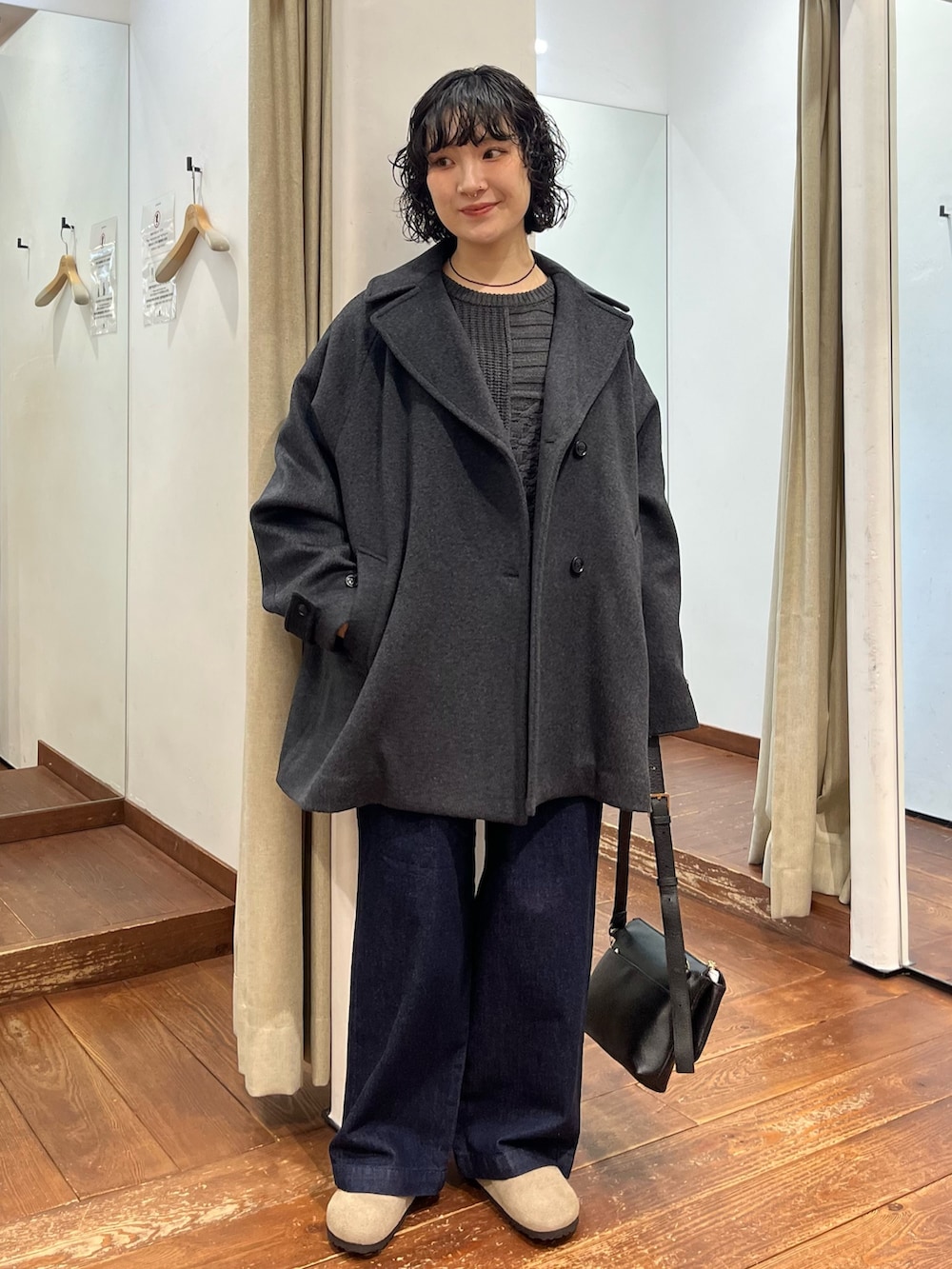 ビッグカラーが顔周りを華やかな雰囲気にしてくれます。Pコートですが、ボタンを1列にしてよりスッキリしたディティールに