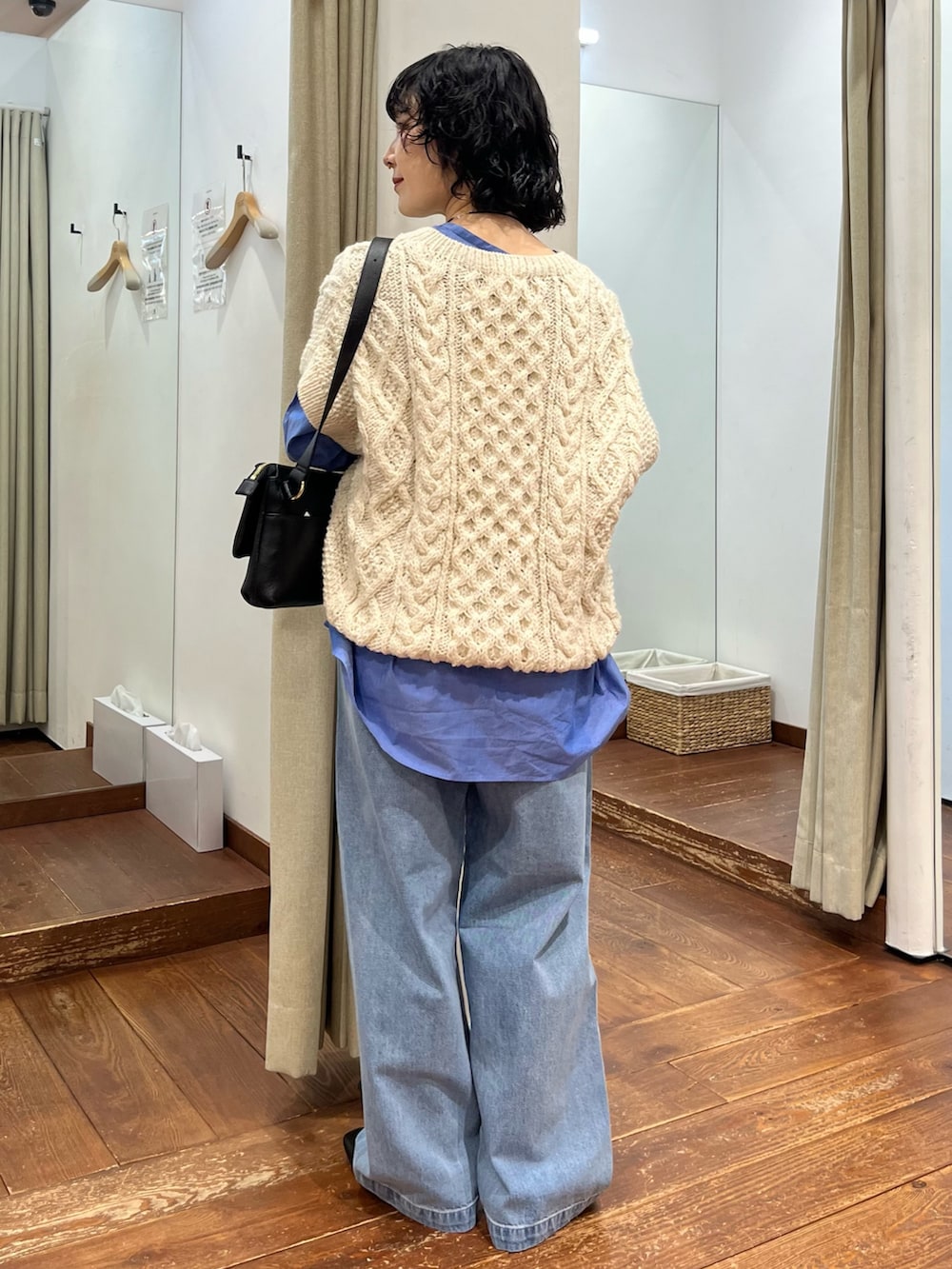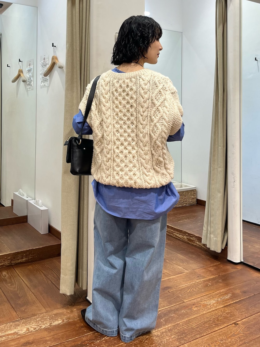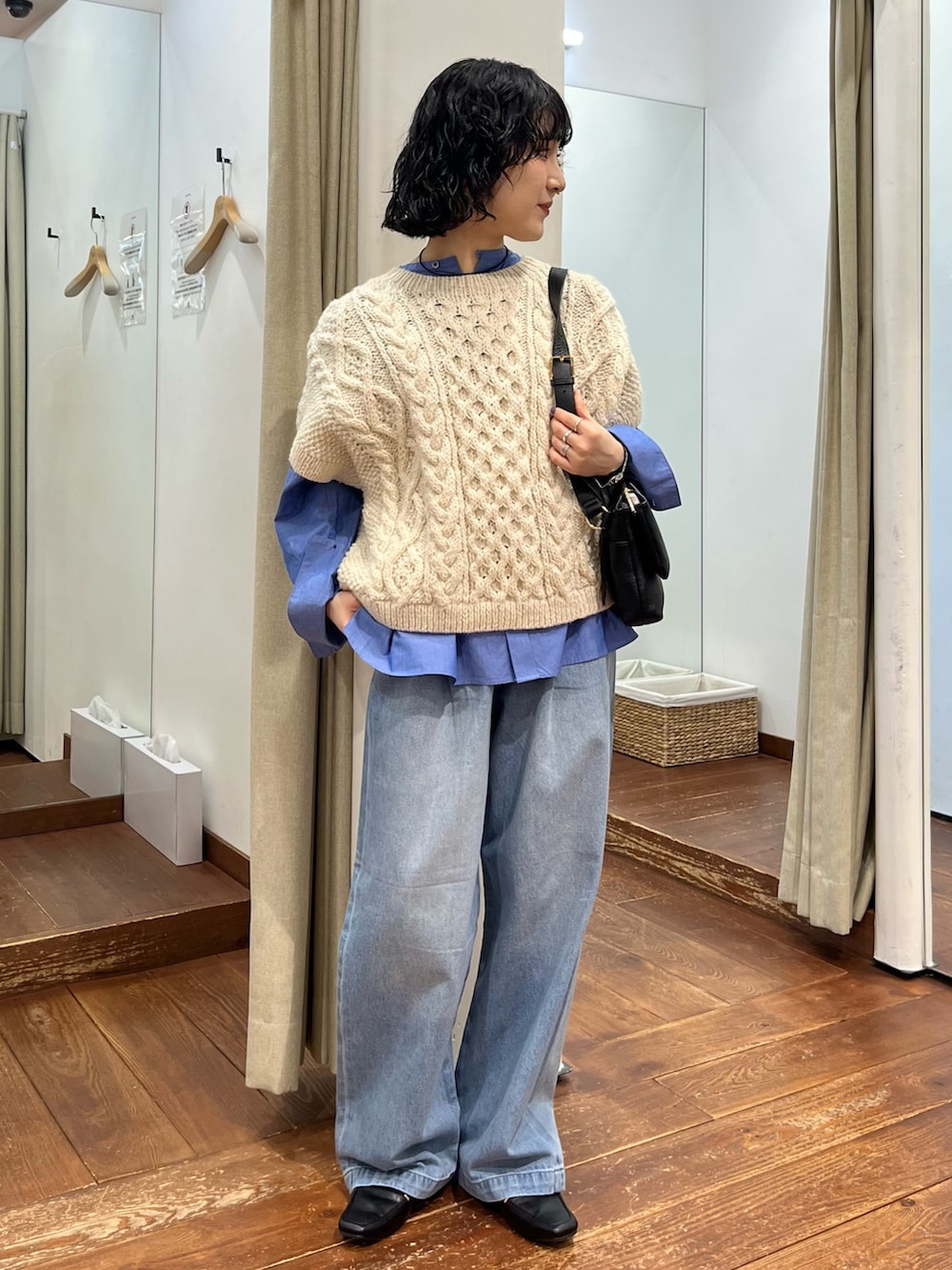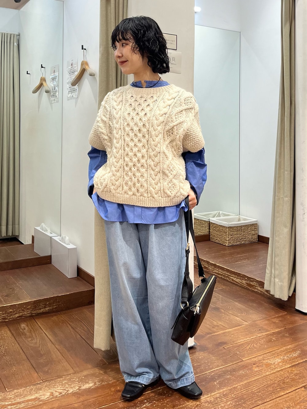ざっくりアラン編みが存在感バッチリで可愛らしいです🧶身幅がワイドでゆったりしているのでシャツでも、薄手のニットに重ねても○