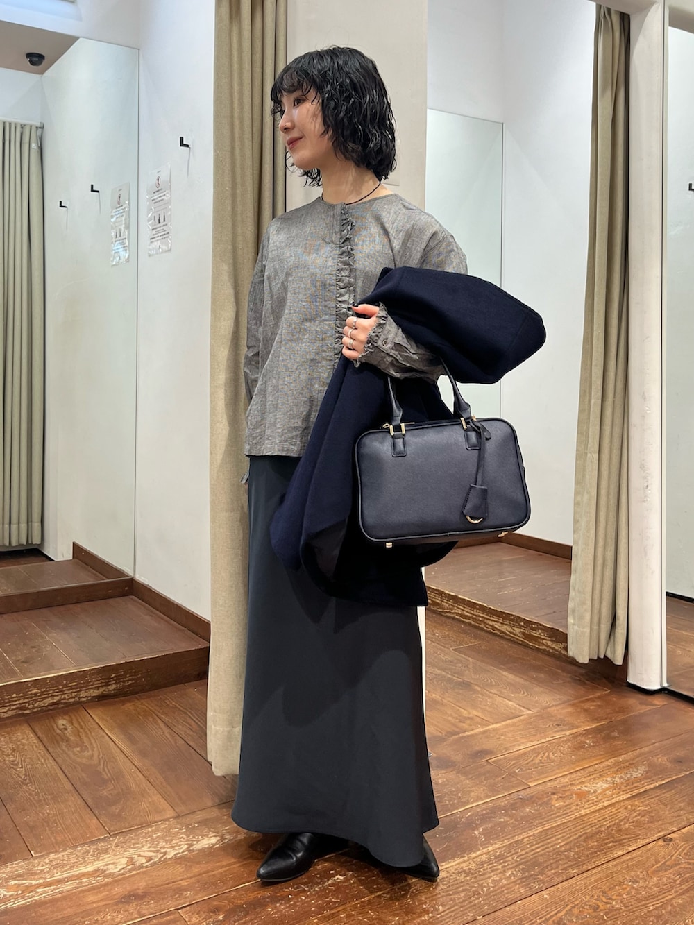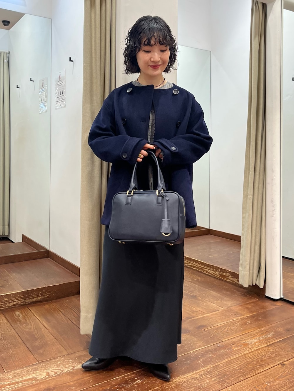 ベーシックな形ながら、肩が落ちていないのとフロントダブルの仕様のためかっちりクールな印象のコートです。